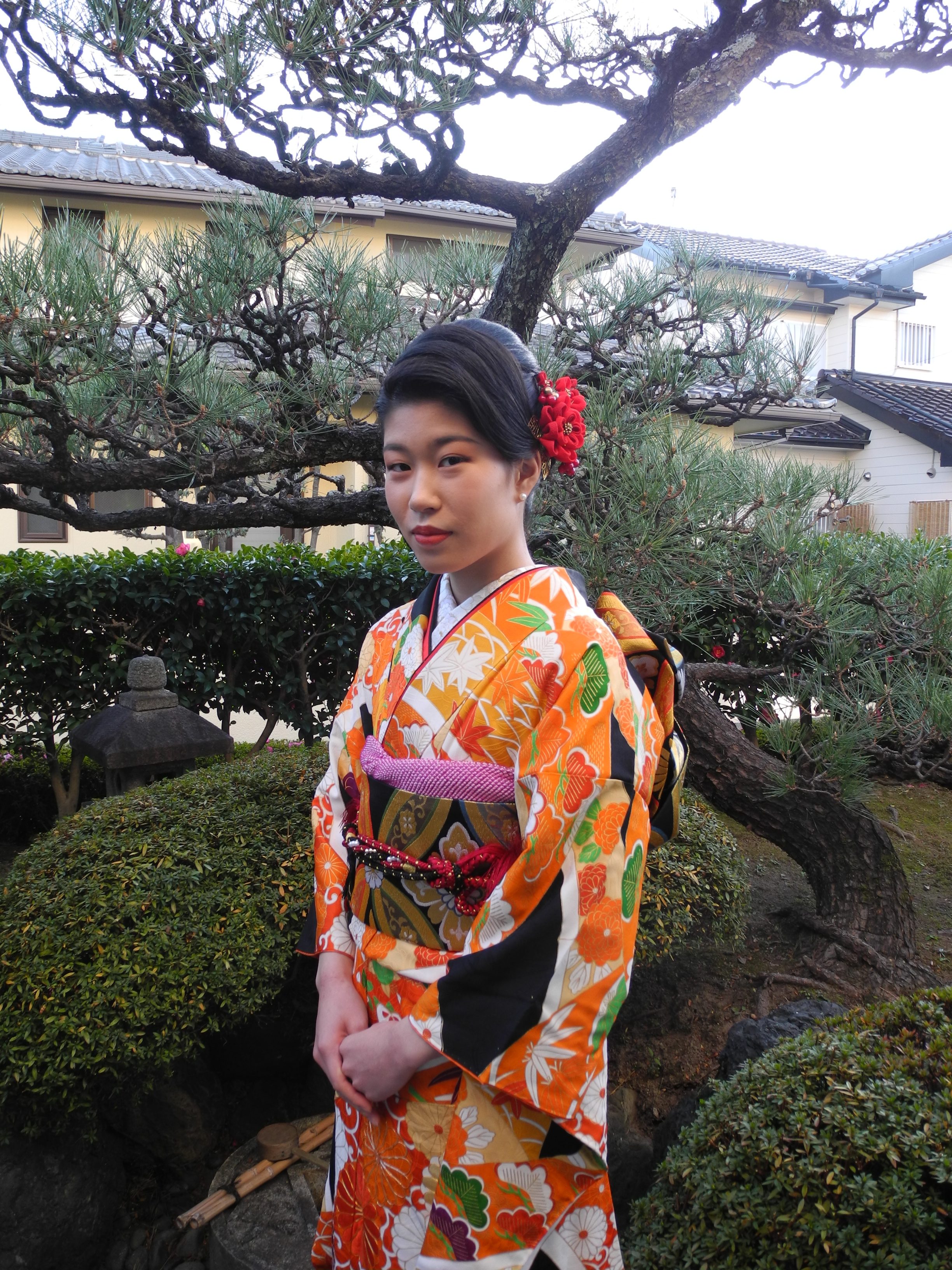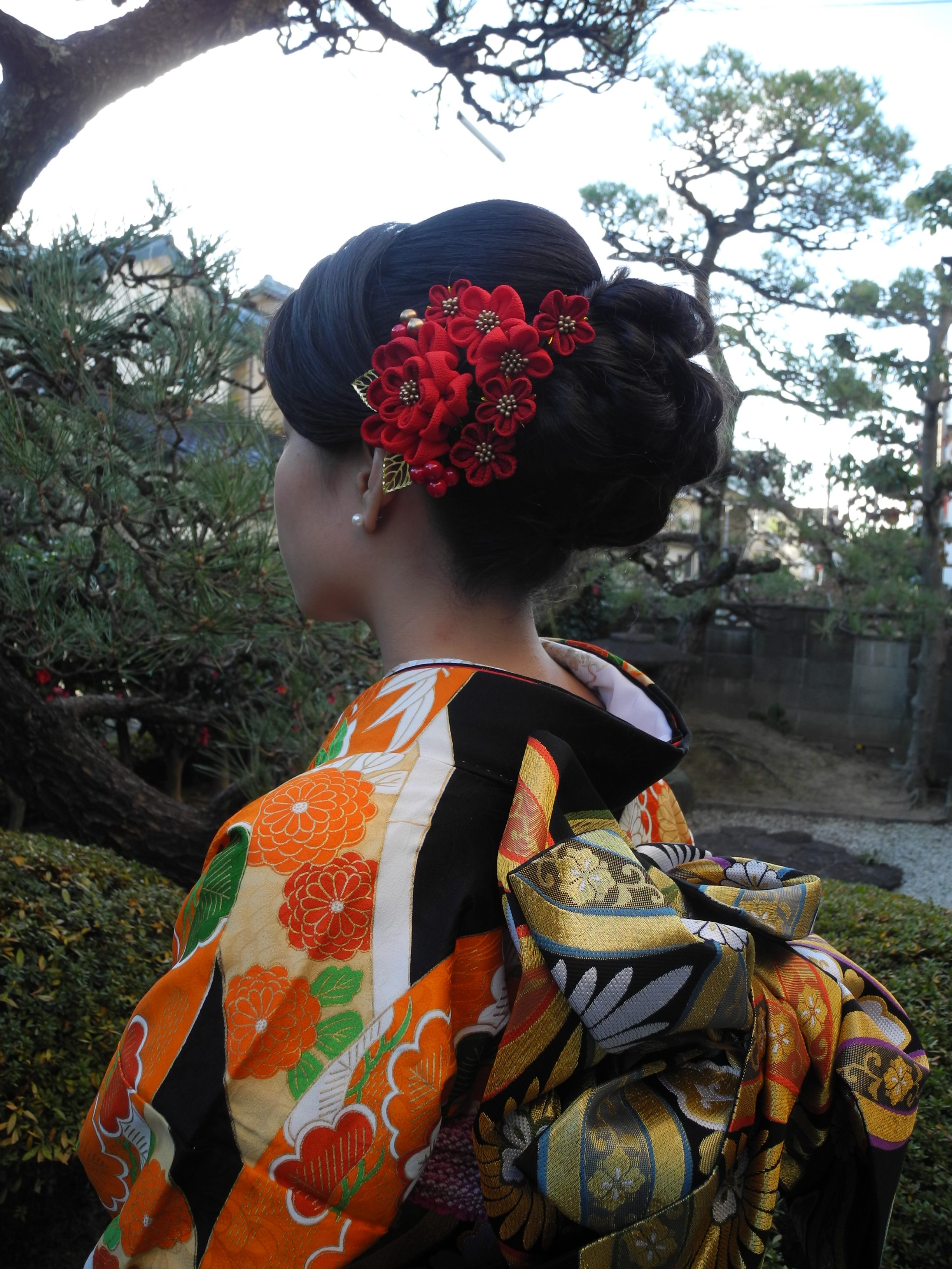 髪飾りは赤のちりめん細工。黒髪のきっちりしたまとめ髪にお似合いですね。