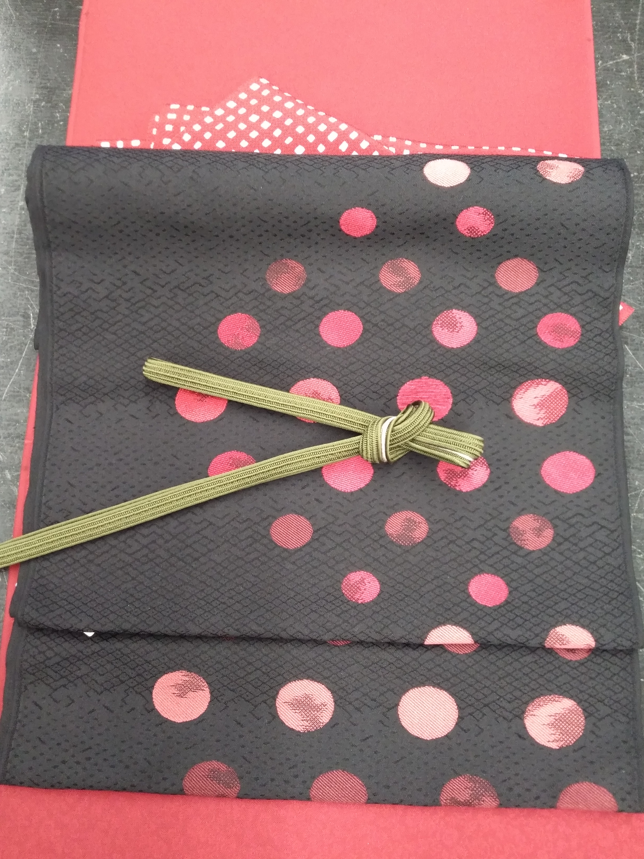 赤い色無地着物に南天の実のような赤の水玉模様(南天に見える~)の名古屋帯を合わせて。帯締めには、葉の色の緑を挿して。
