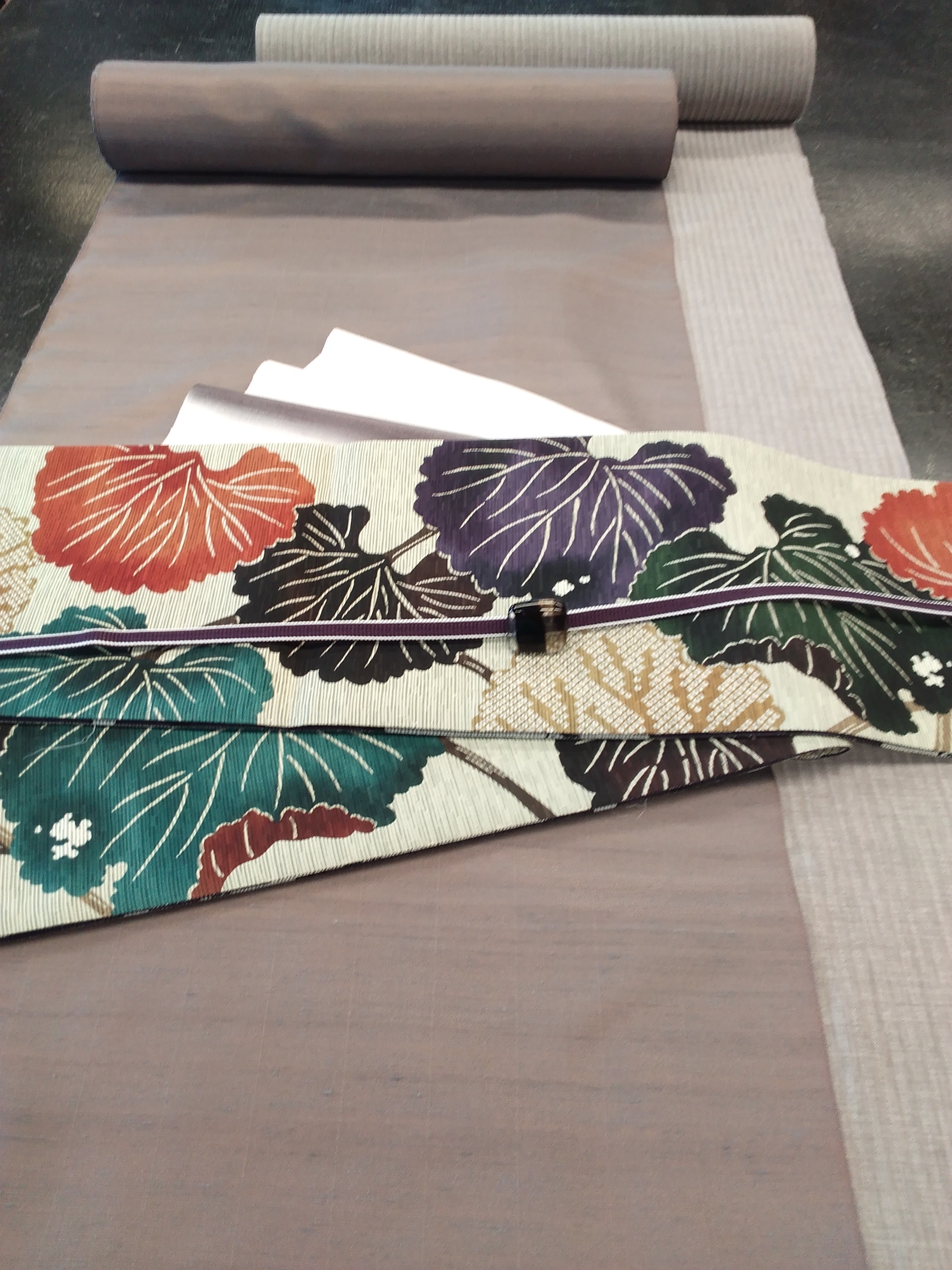 ですので、こちらは長襦袢と着物を変えずに、ツワブキの葉柄の半巾帯をコーディネイトしてみました。