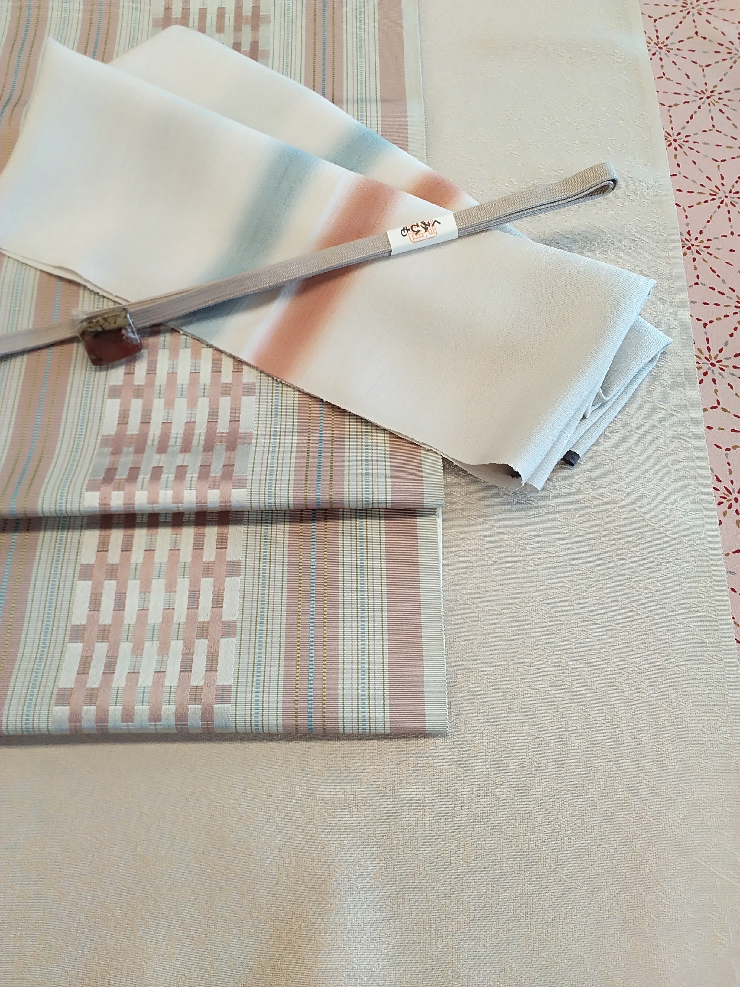 煎り豆色?ベージュの色無地にベージュとスモーキーピンクの博多帯を合わせて。長襦袢にスモーキーピンクの麻の葉柄を組み合わせるとちらりと見えるオシャレなコーデになりますよ♪しかも麻の葉柄は邪気払いの意味を持つ柄。節分にももってこいの柄ですよね!
