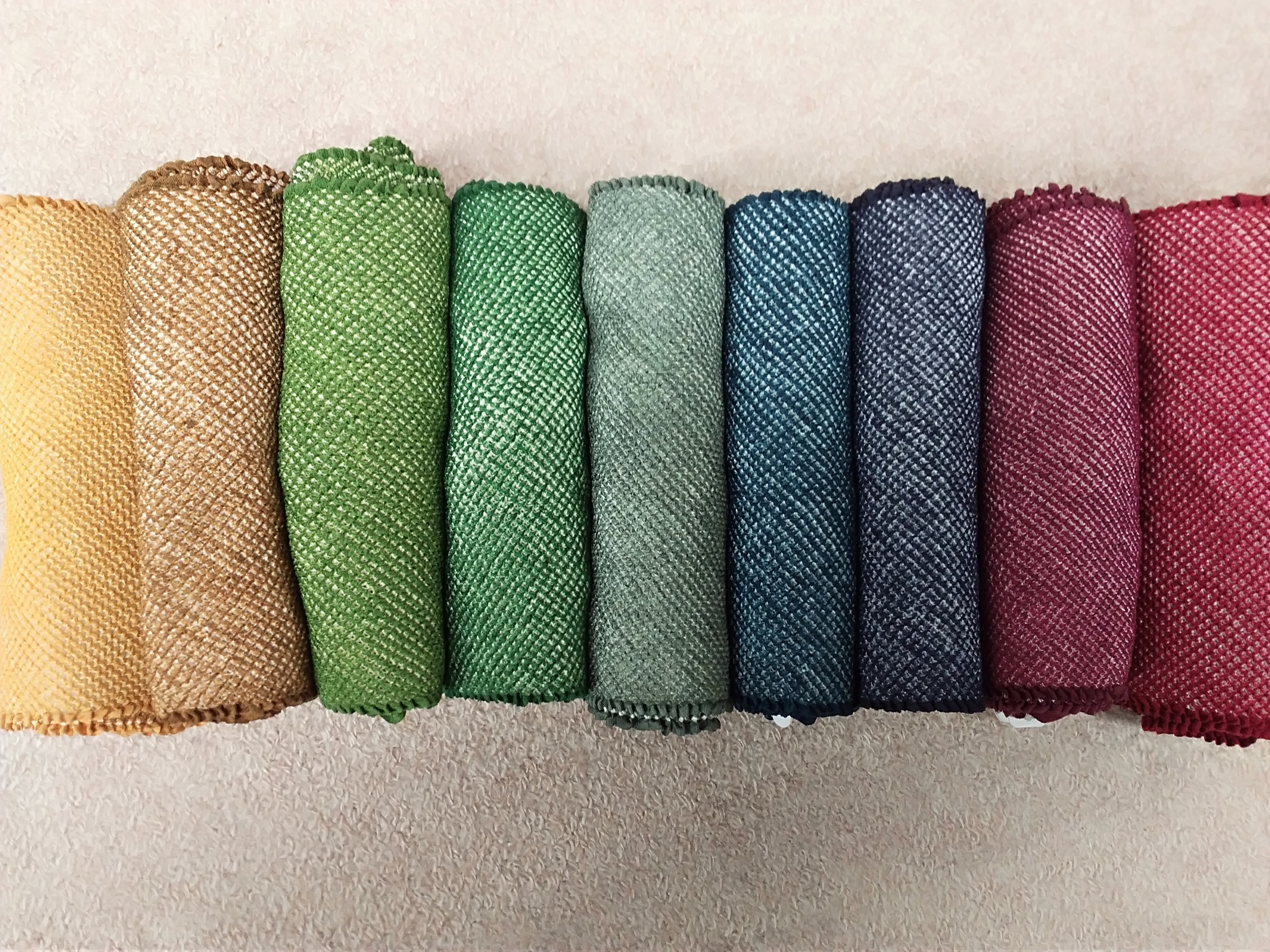 そんな中、弊社では髪飾りは委託して作って頂いていたり、帯揚げも業者さんにお願いしてアースカラーを染めていただきました。まずは1本ずつの入荷で、どんどん数が減ってきていますが、こんな色がありますよ。