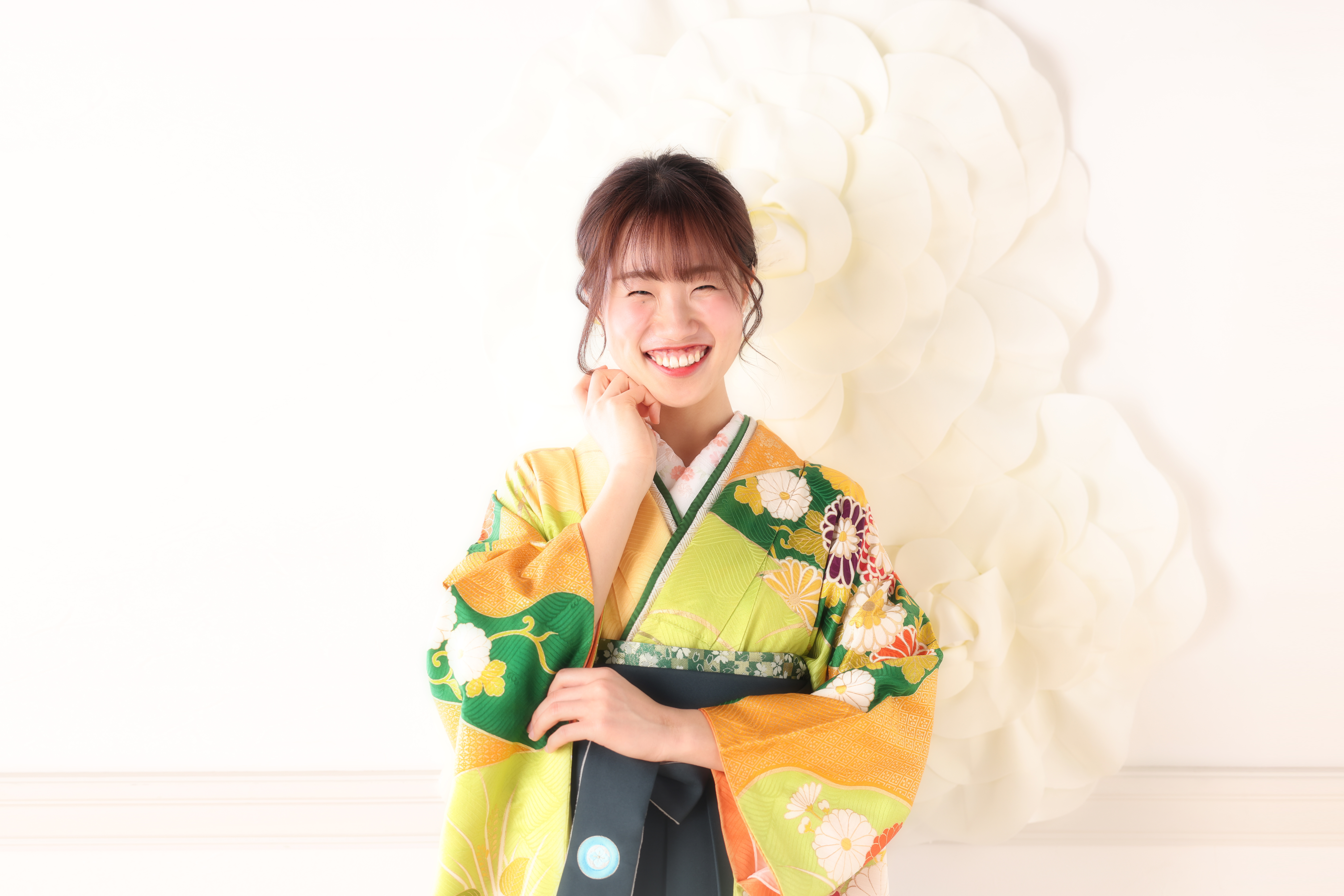 お母様のお振袖を着用されています。黄色、オレンジ、緑に大きな菊が描かれた、お着物は明るいお嬢さまにとってもお似合いです♪