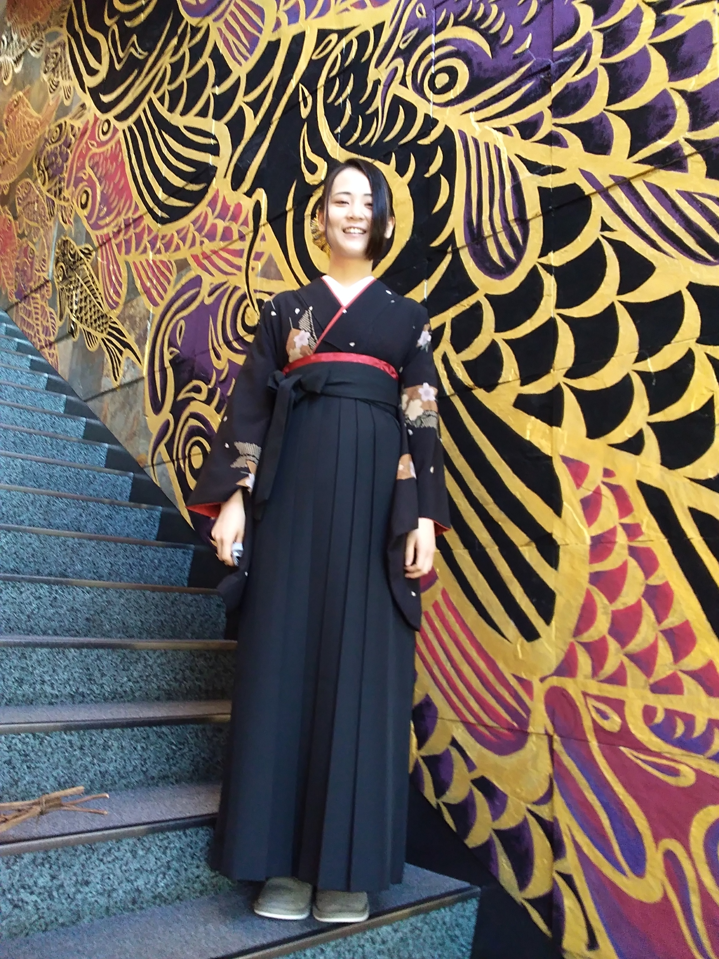 袴を選びに来てただいた時も、全身赤コーデ、黒コーデ、紺色コーデ等、ワントーンコーデを色々試して、黒地に桜柄のお着物に、黒の袴、帯や重ね襟に赤を組み合わせたコーディネイトにして頂きました。