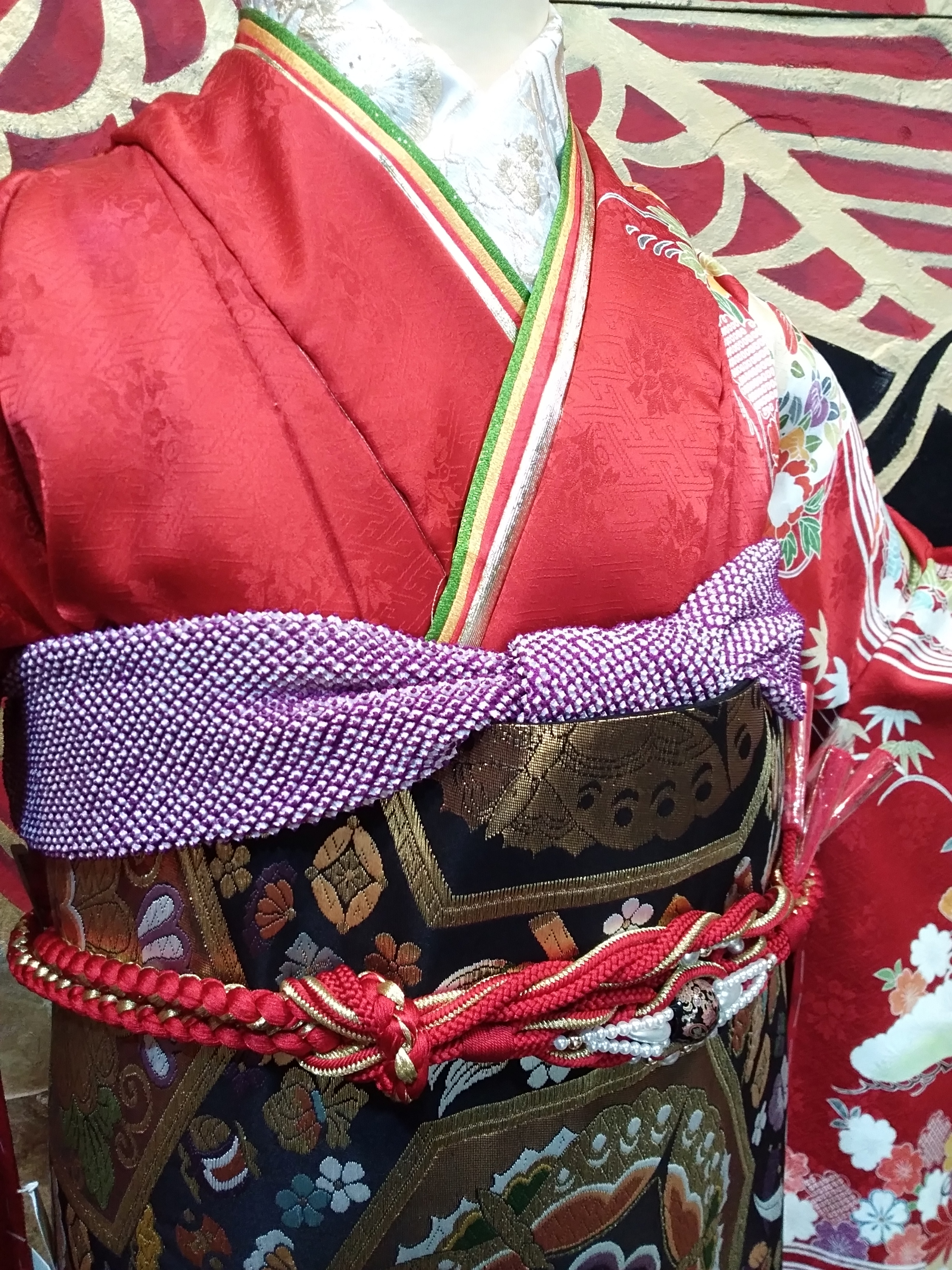 帯には宝尽くしの柄。①危険から身を守る、隠れ蓑、隠れ笠。②南蛮渡来の果物、薬用でも使用、丁子。③密教の法具、願いを意のままにする、宝珠。④願いをかなえる、敵を倒す、打ち出の小づち。⑤金銭を入れる袋、財布、金嚢。⑥金庫の鍵、宝鍵。⑦知識の拠り所、宝巻。⑧采配の決定、軍配。⑨秤で金の重さを量る、分銅。⑩法華経の教えによる七つの宝、七宝。このような意味を持った絵柄が描かれた帯は無敵状態ではないでしょうか。