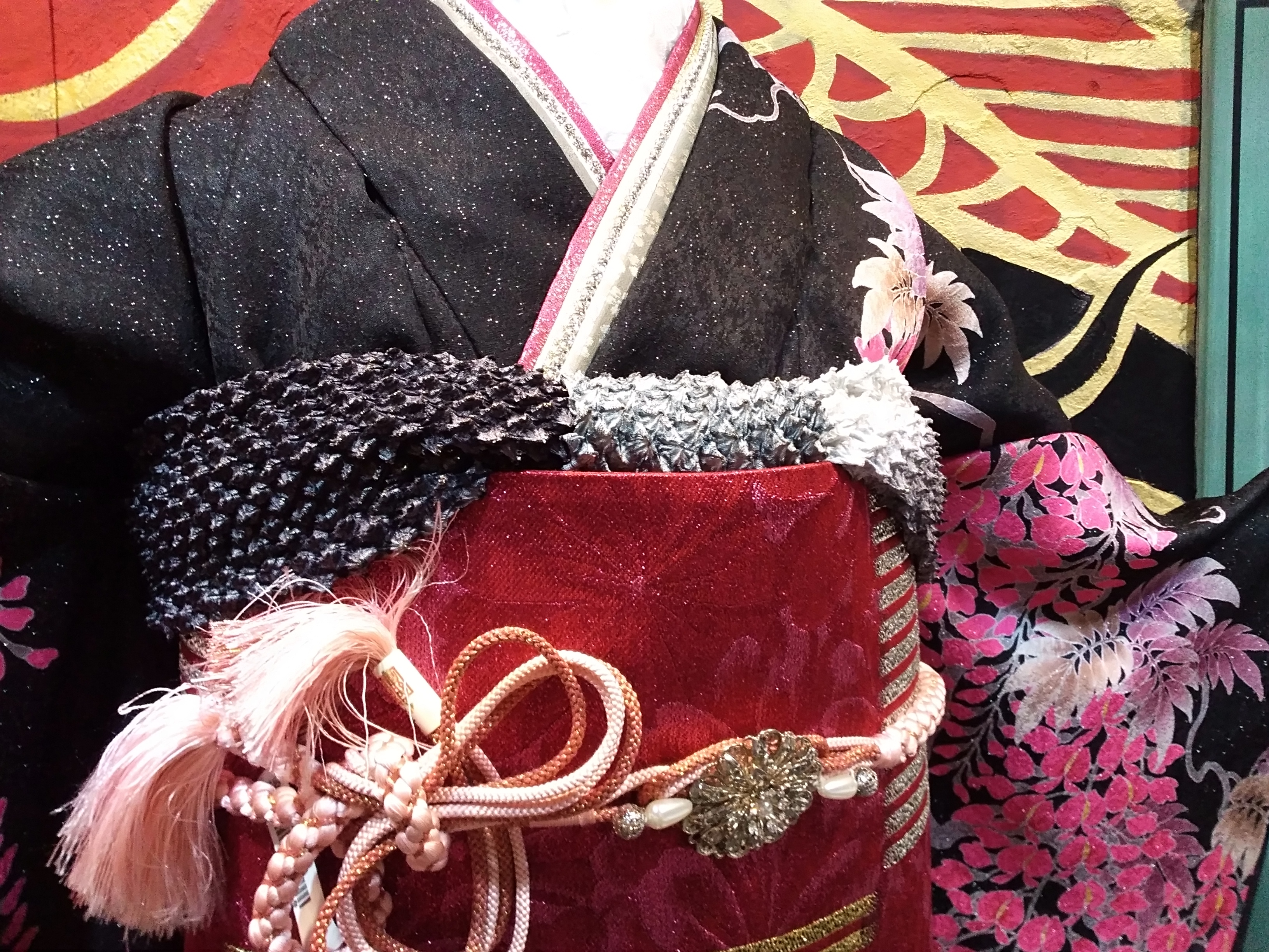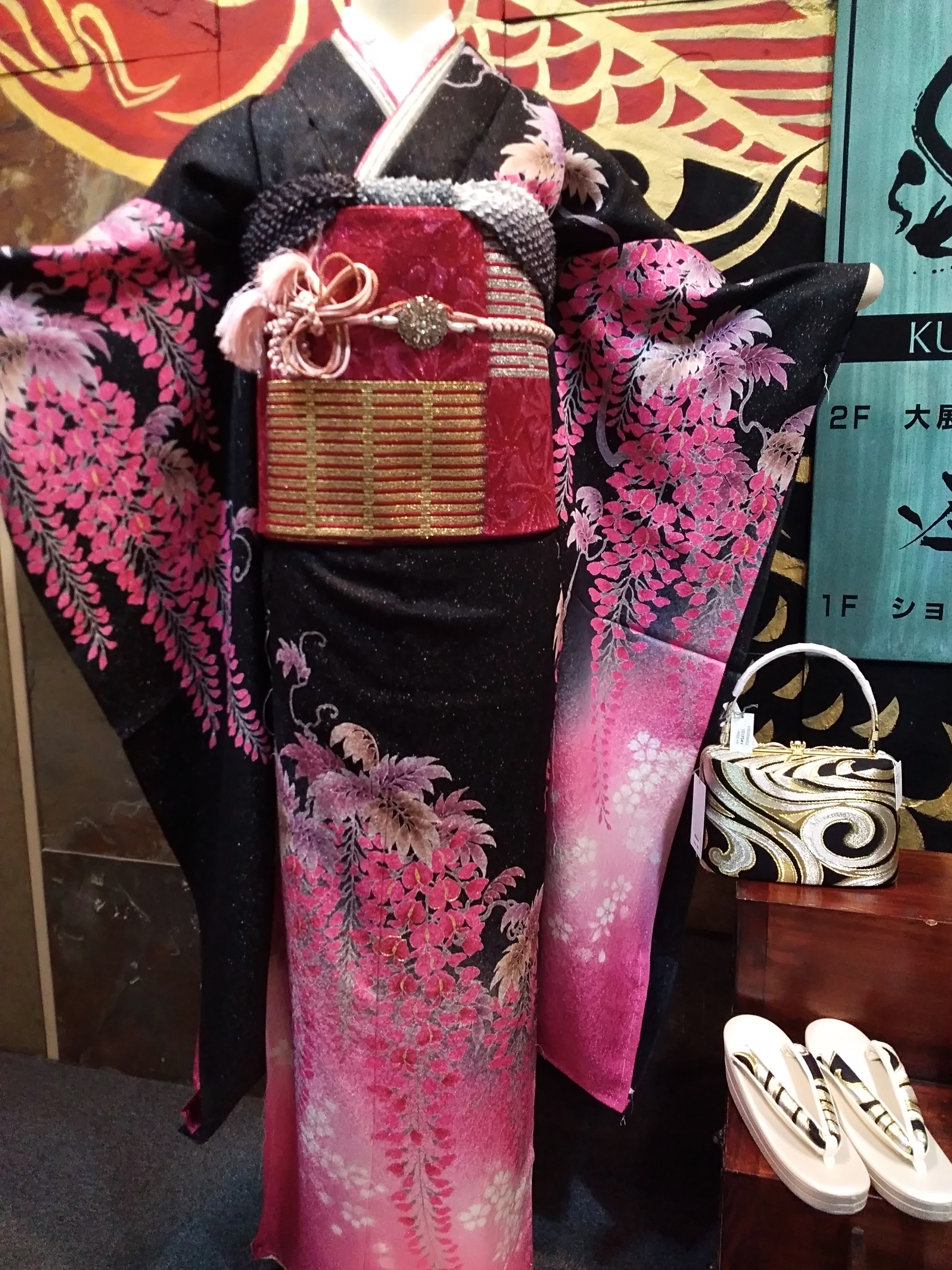 黒、白、グレー、マゼンタピンクと少ない色のコーディネイトですが、キラキラ光る着物の地や、小物類で華やかです♪