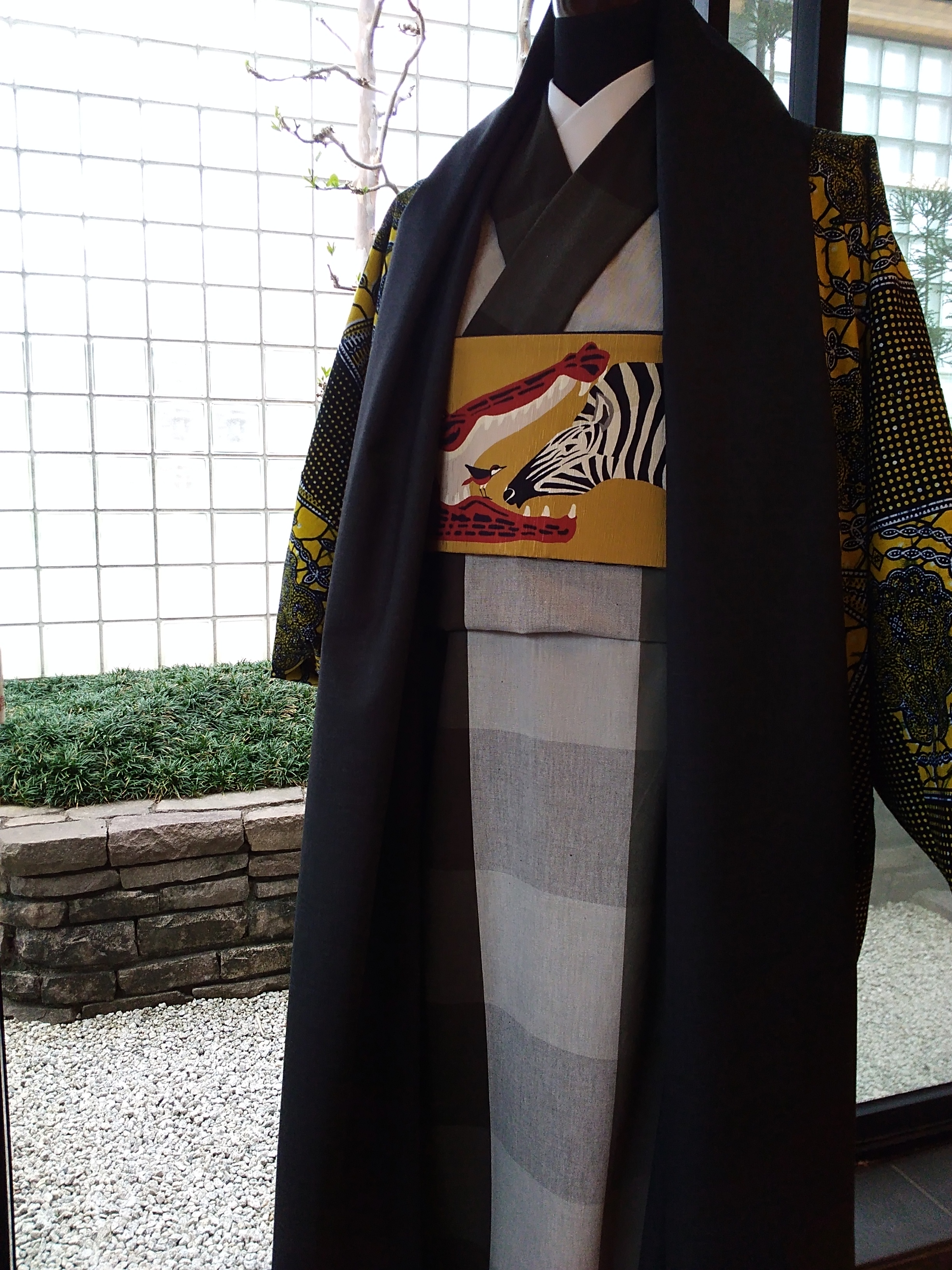 羽織り紐を使って羽織として着ることもできますし、ブローチなどでとめてコートとして着たり、ベルトをしたり・・・。