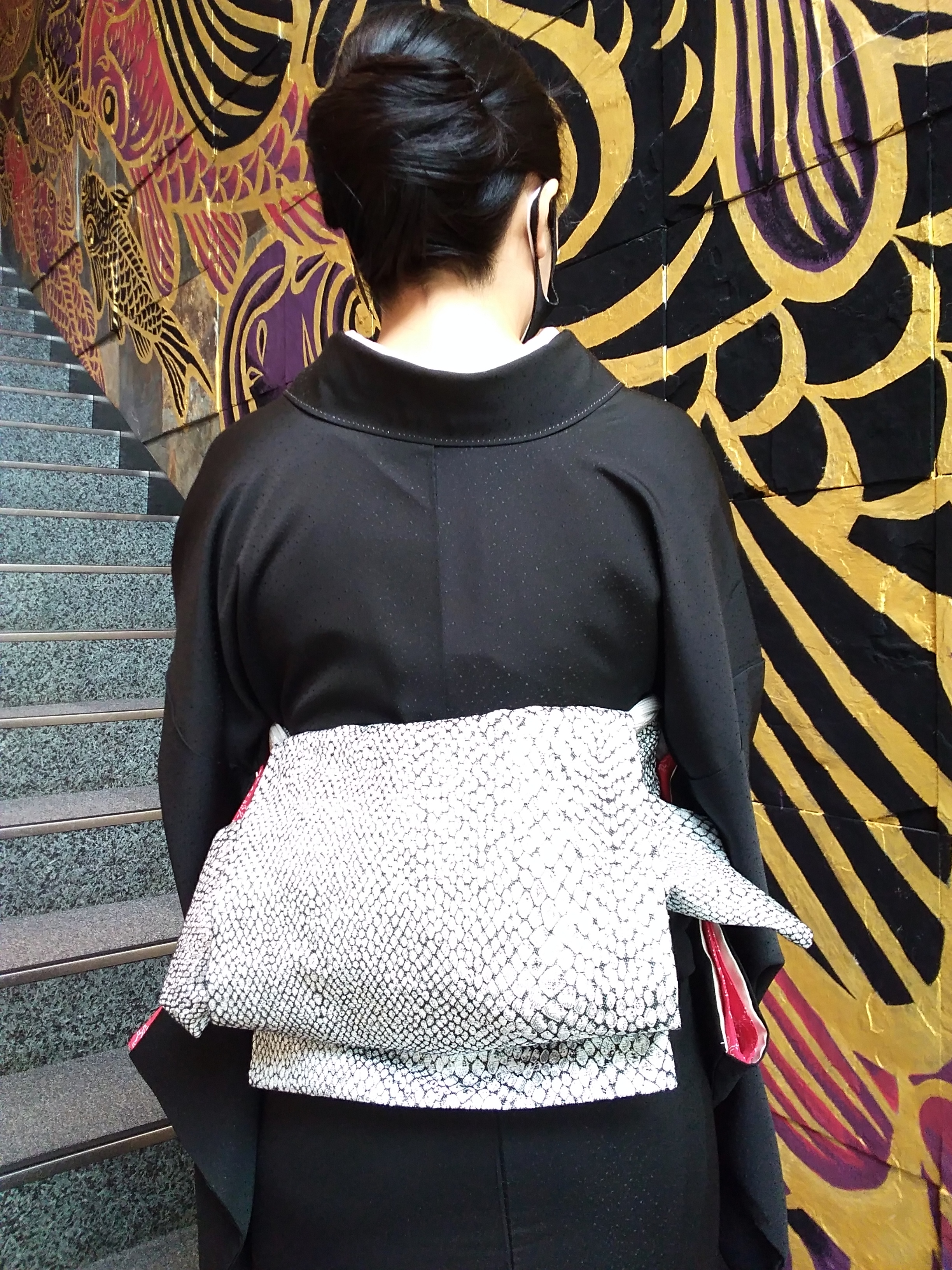 地模様のあられがキラキラと光りの加減で表情が変わって可愛いので気に入っています。しかも、私にとっては黒の着物に合わせられる帯がとても多いので、コーディネイトの幅がとっても増えました。