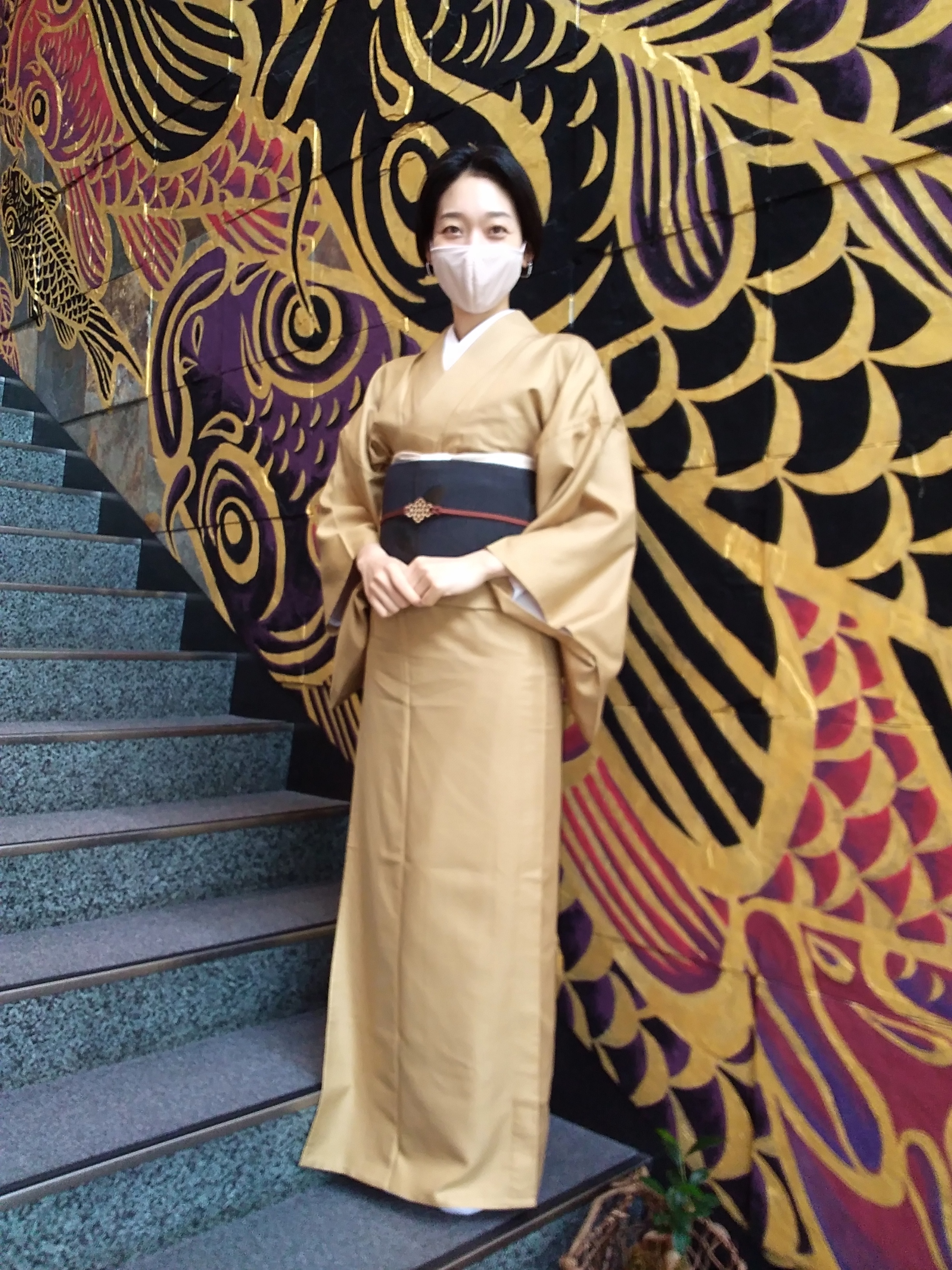 実は、スタッフの祖母の紬の着物を仕立て直して着用しています。
