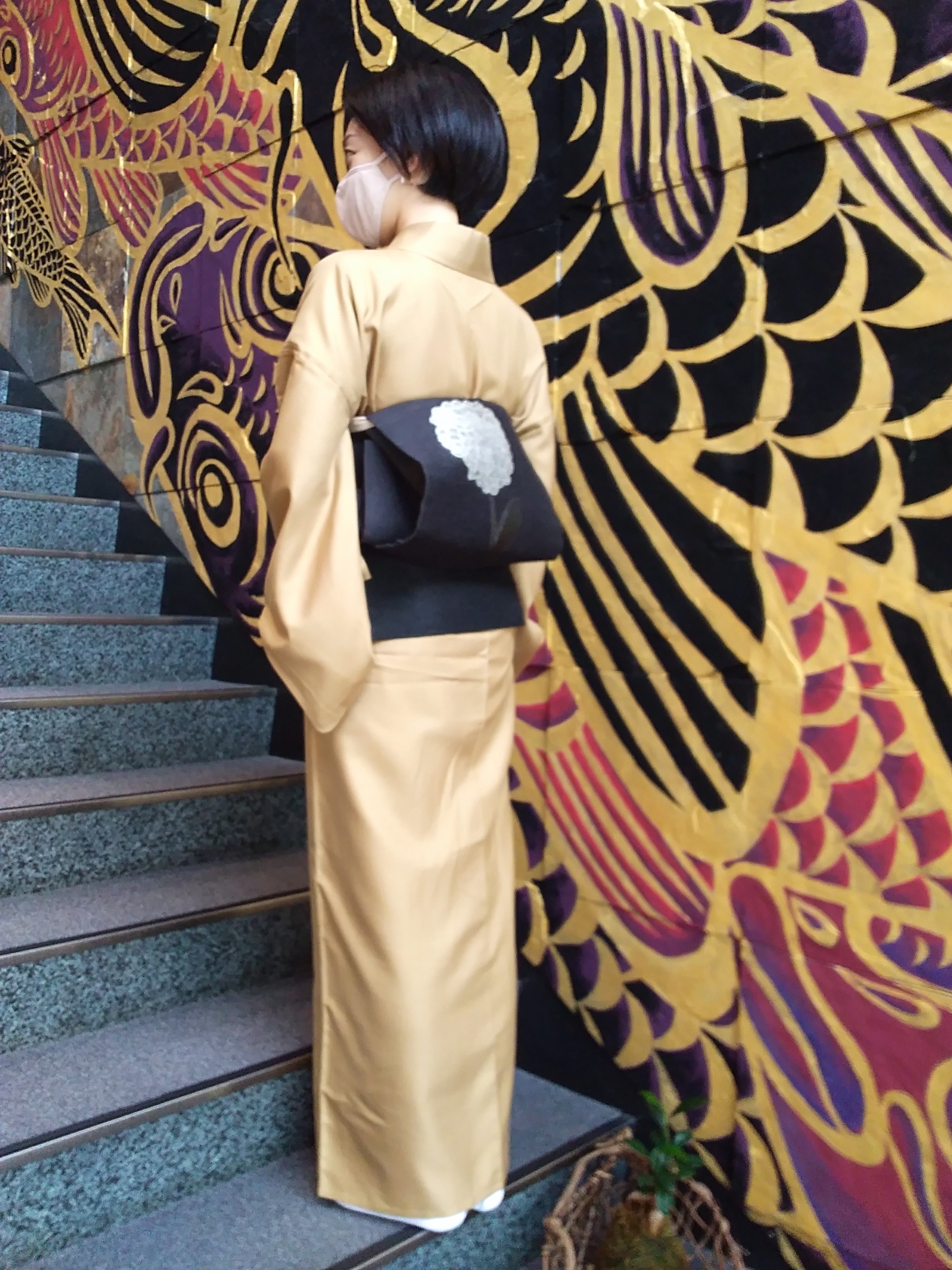名古屋帯は『銀座結び』という結び方で、カジュアルに着こなしています。