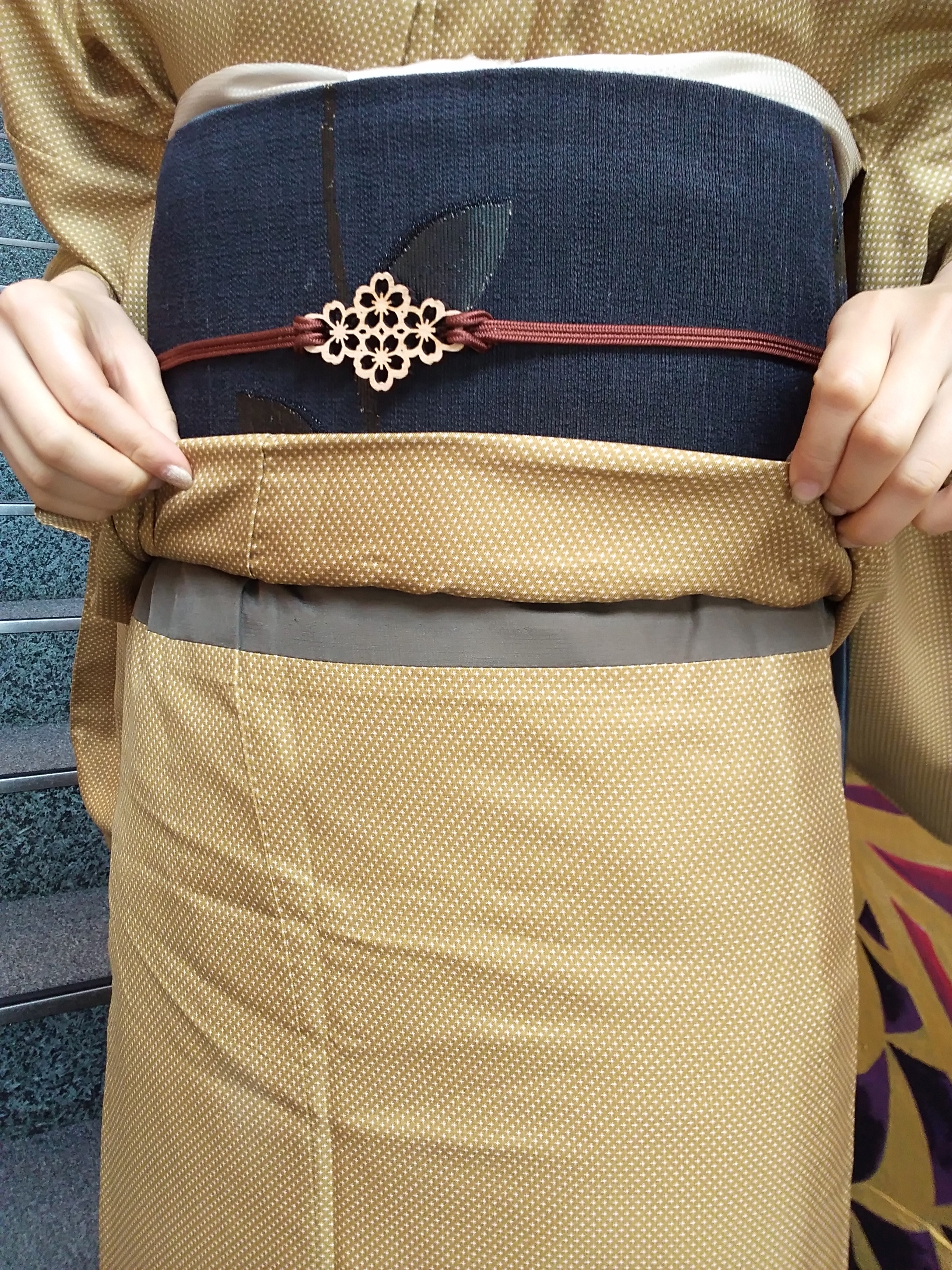 帯締めは個性的な木彫りの桜模様。ポイントになって可愛いですね。