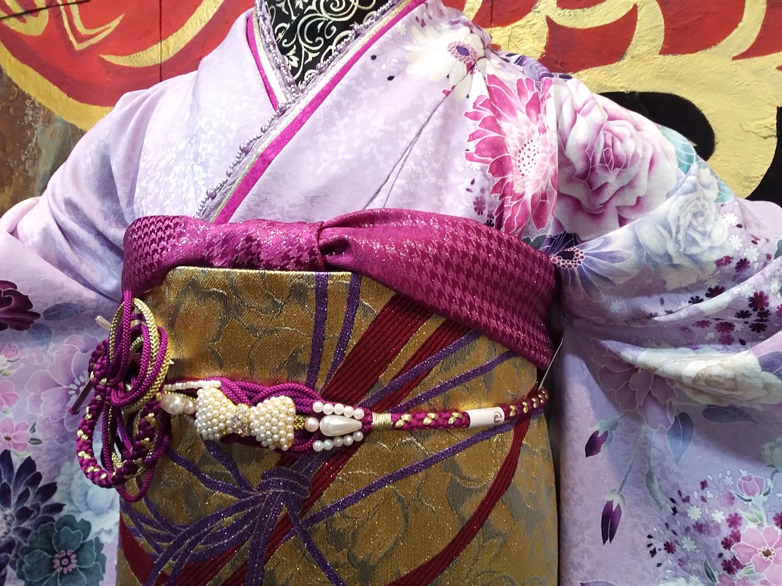 帯にもリボンの柄のものを合わせて、紫系の小物でコーディネイト。