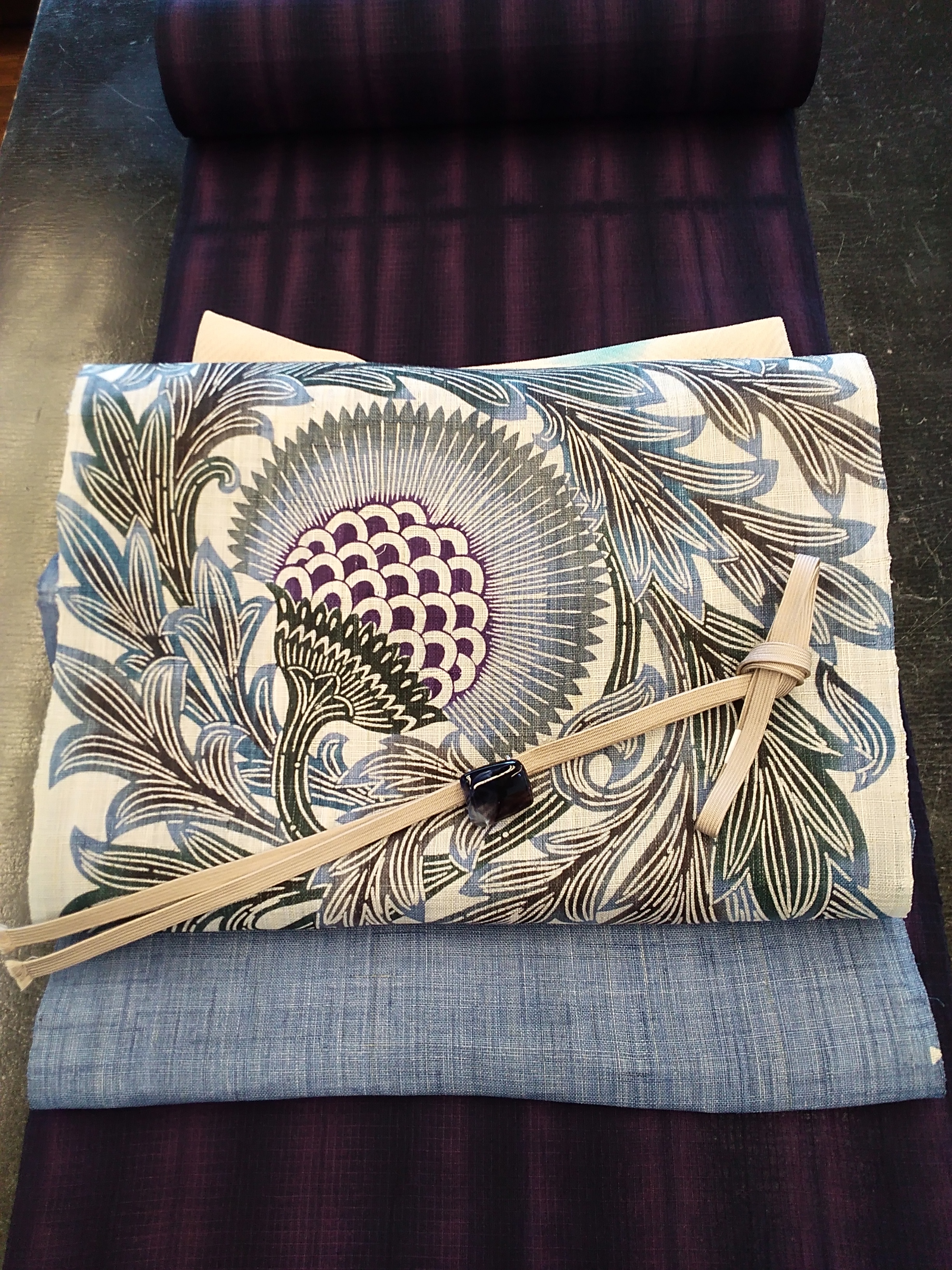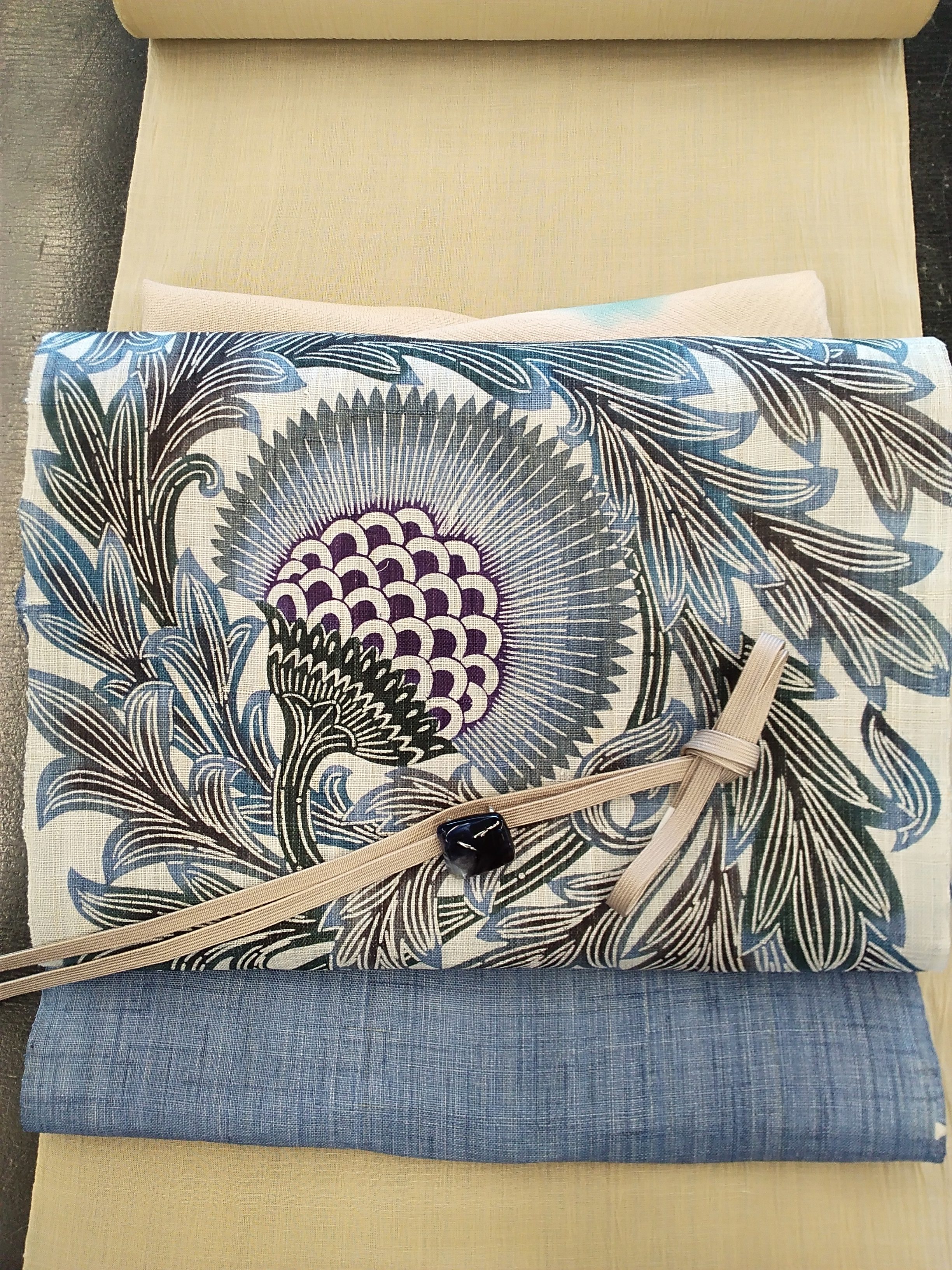 今回は新しく入荷しました、本大麻布の和染のアザミ柄の夏帯をご紹介いたします。