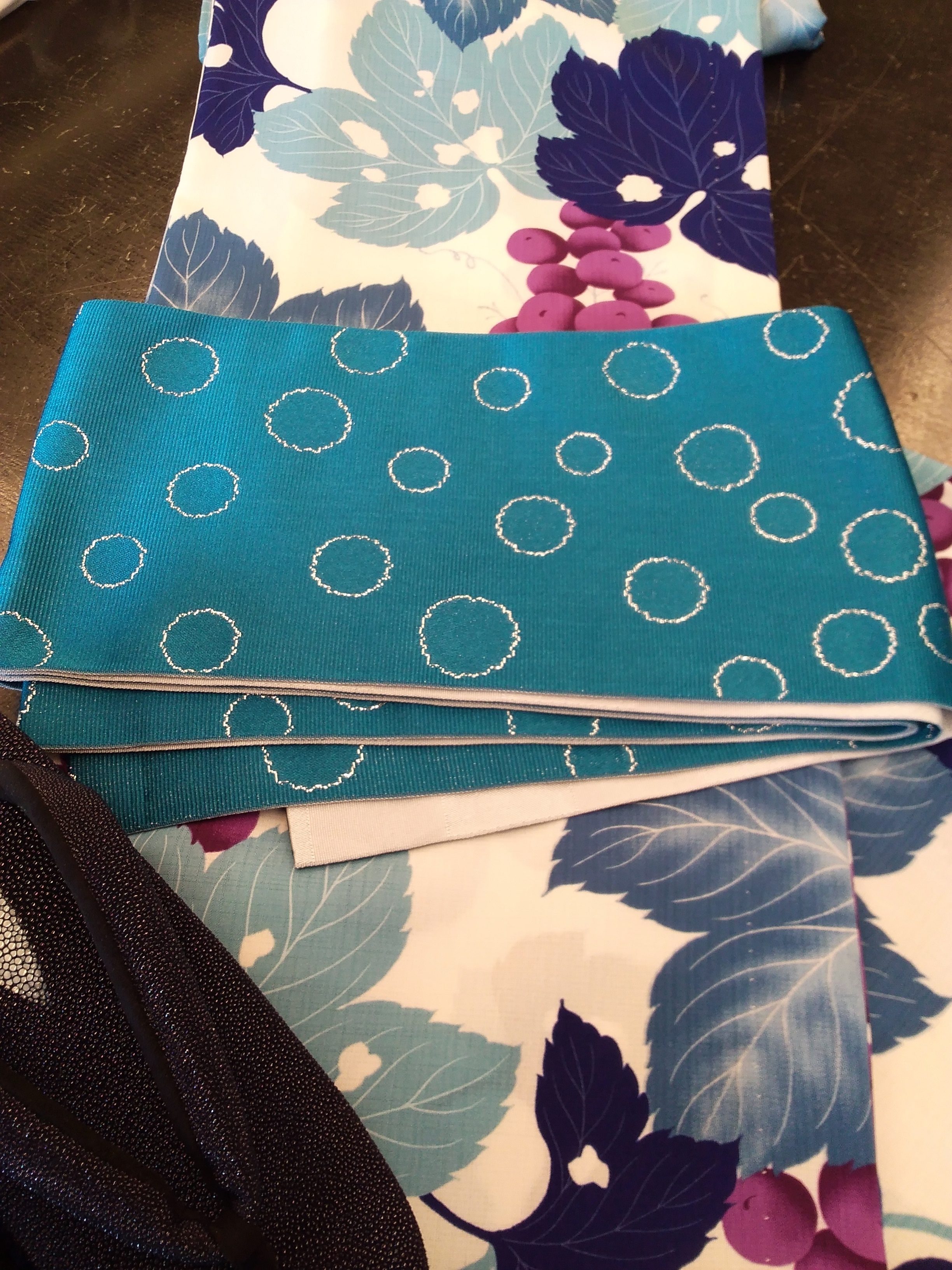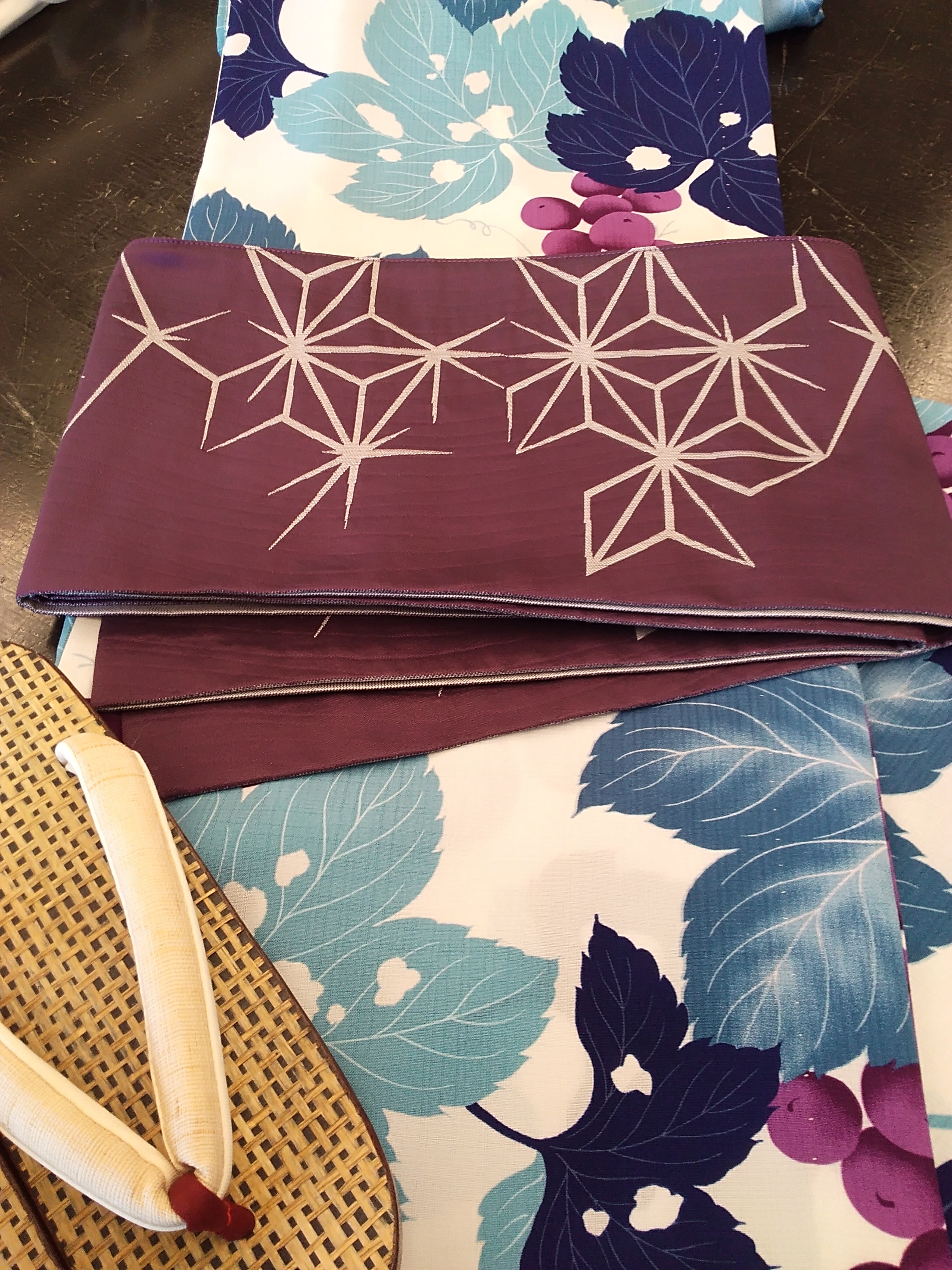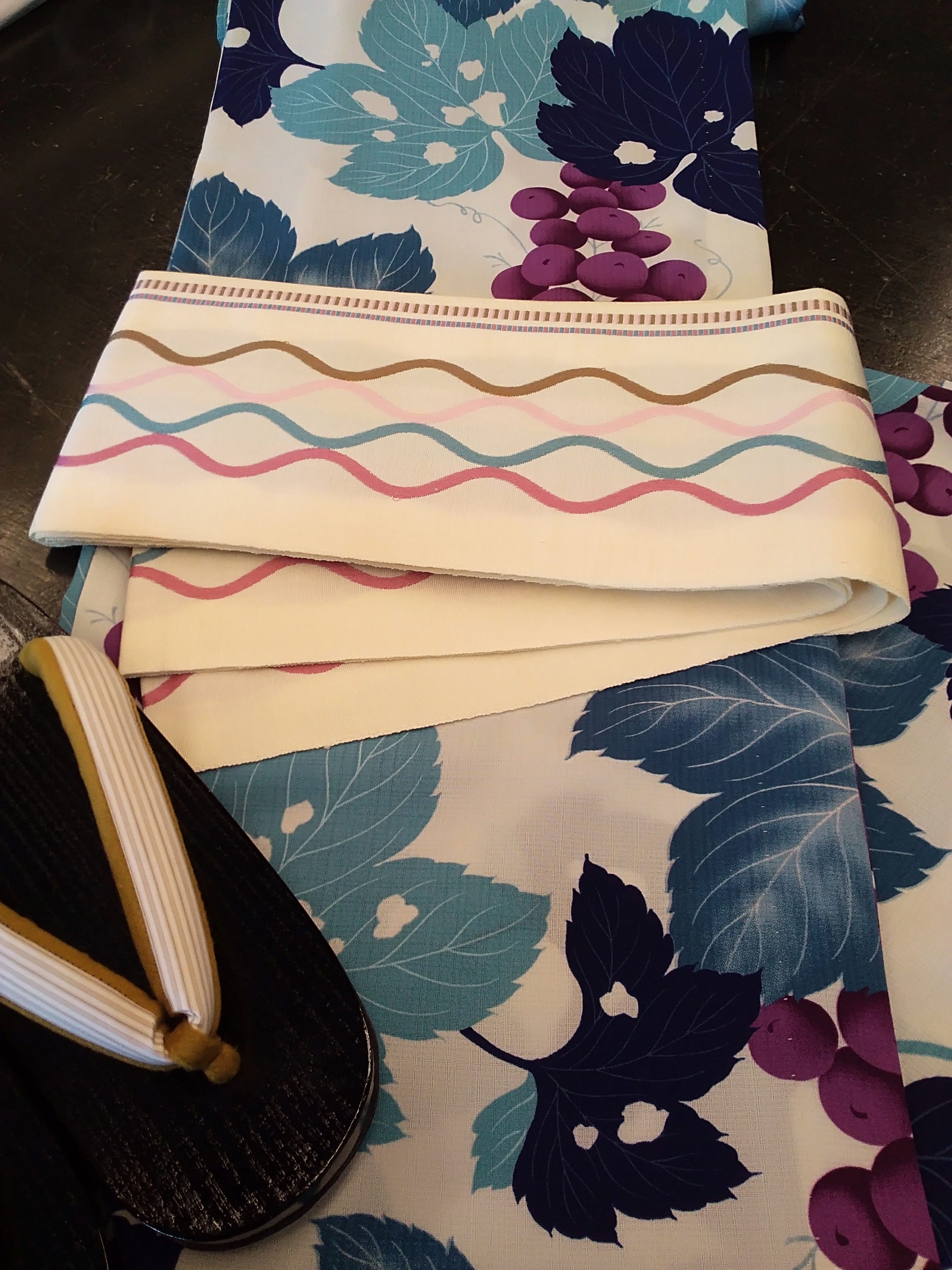 今回は葡萄柄浴衣をコーディネイト。帯を3本変えるだけで見た目が変わるのを見て頂きたいと思います。