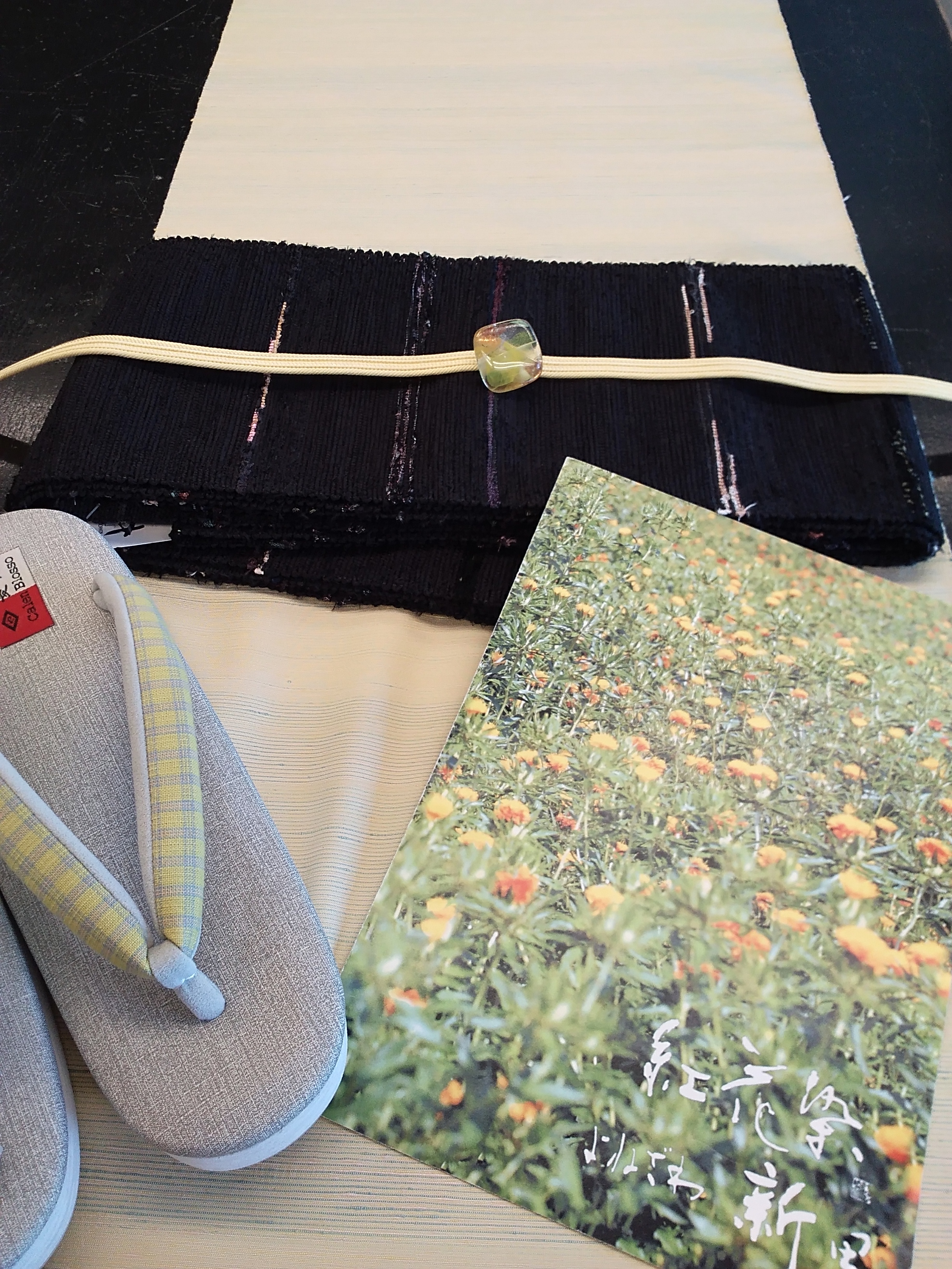 こちらは黄色と水色が混ざった反物。黒地の半巾帯も紅花染めの裂き織りです。