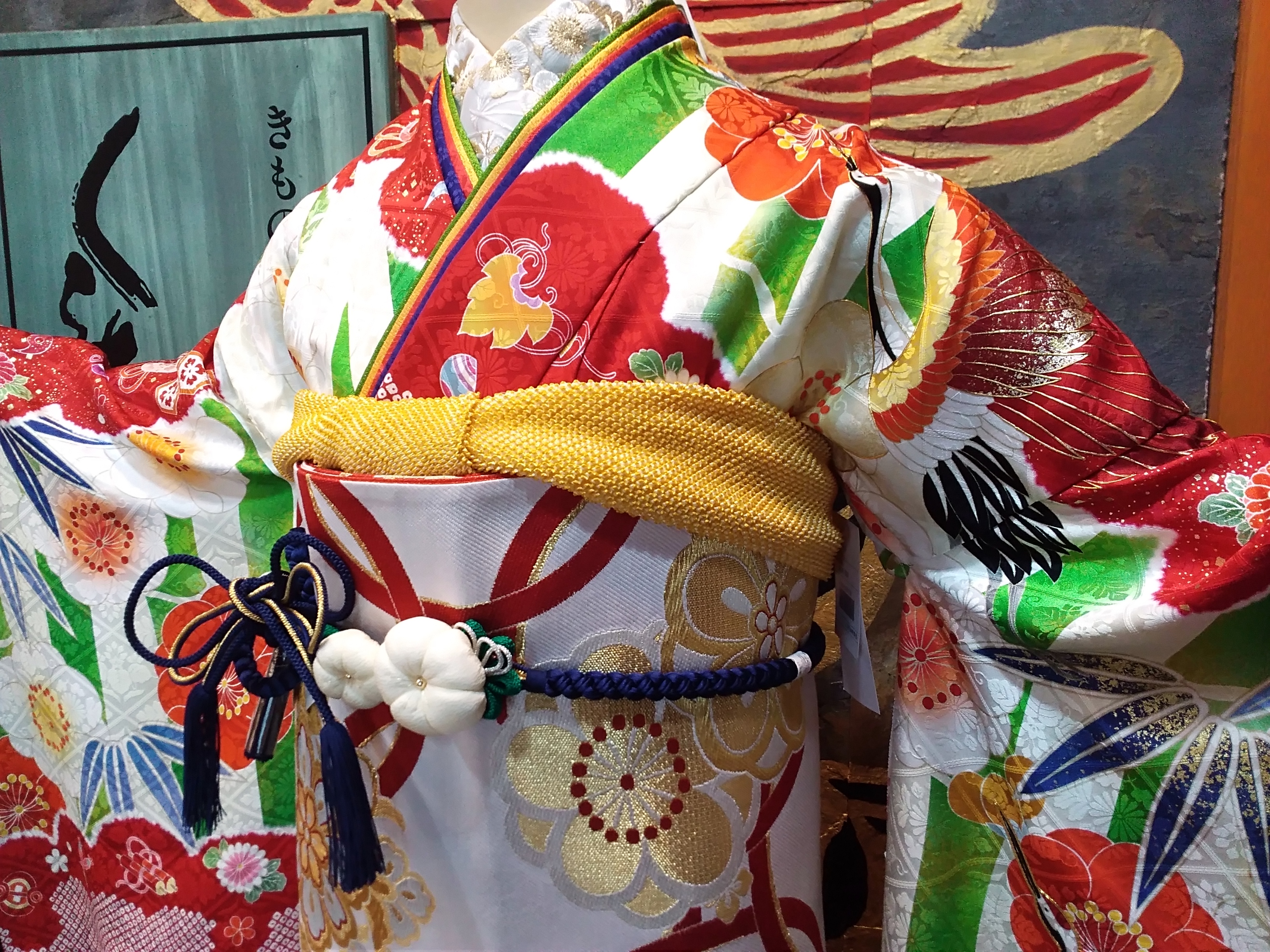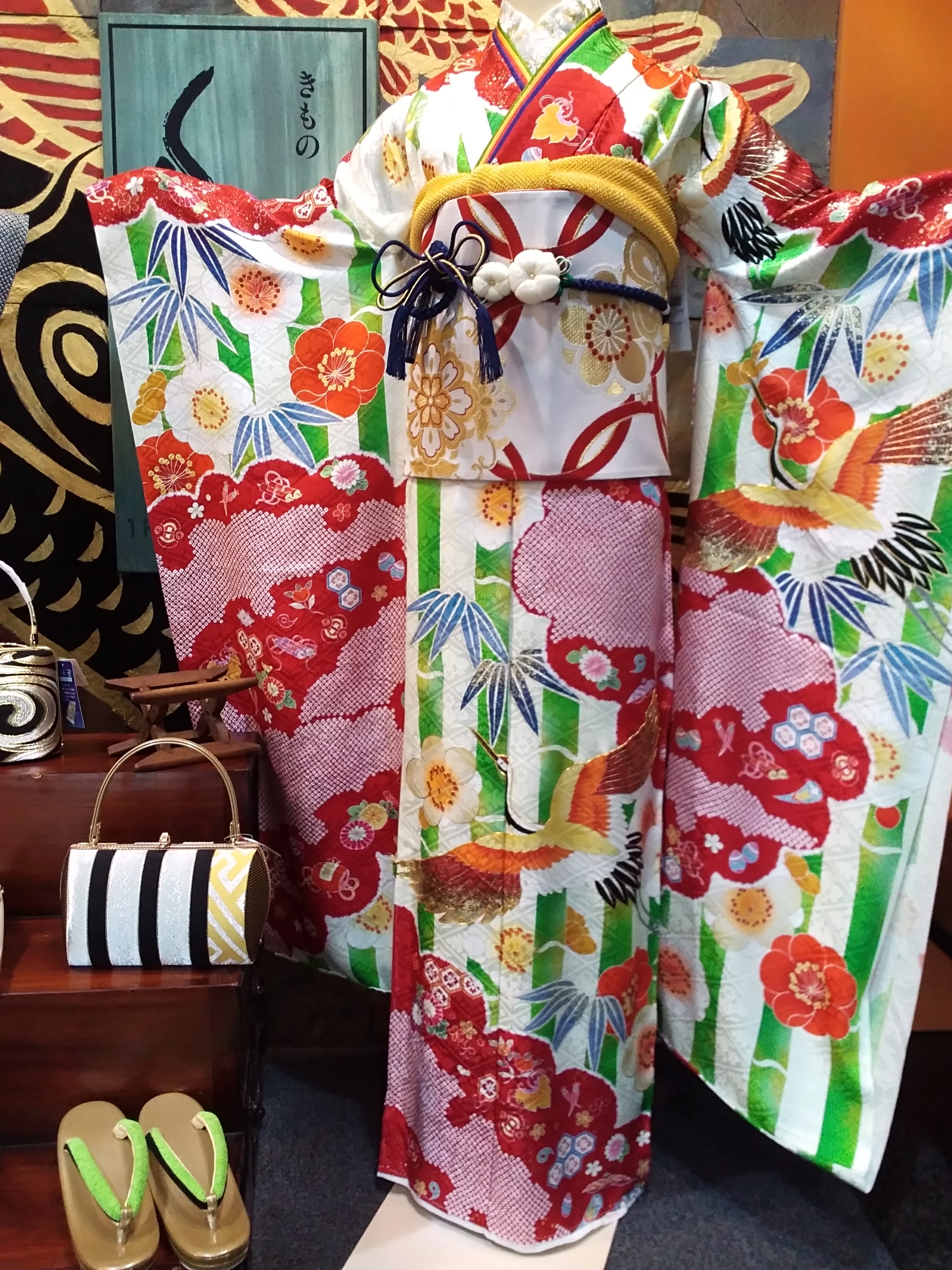 全体に竹が描かれ、梅や鶴、雲取り、雪輪、その中に宝尽くしとおめでたい柄行のお振袖が明るい色合いで描かれています。