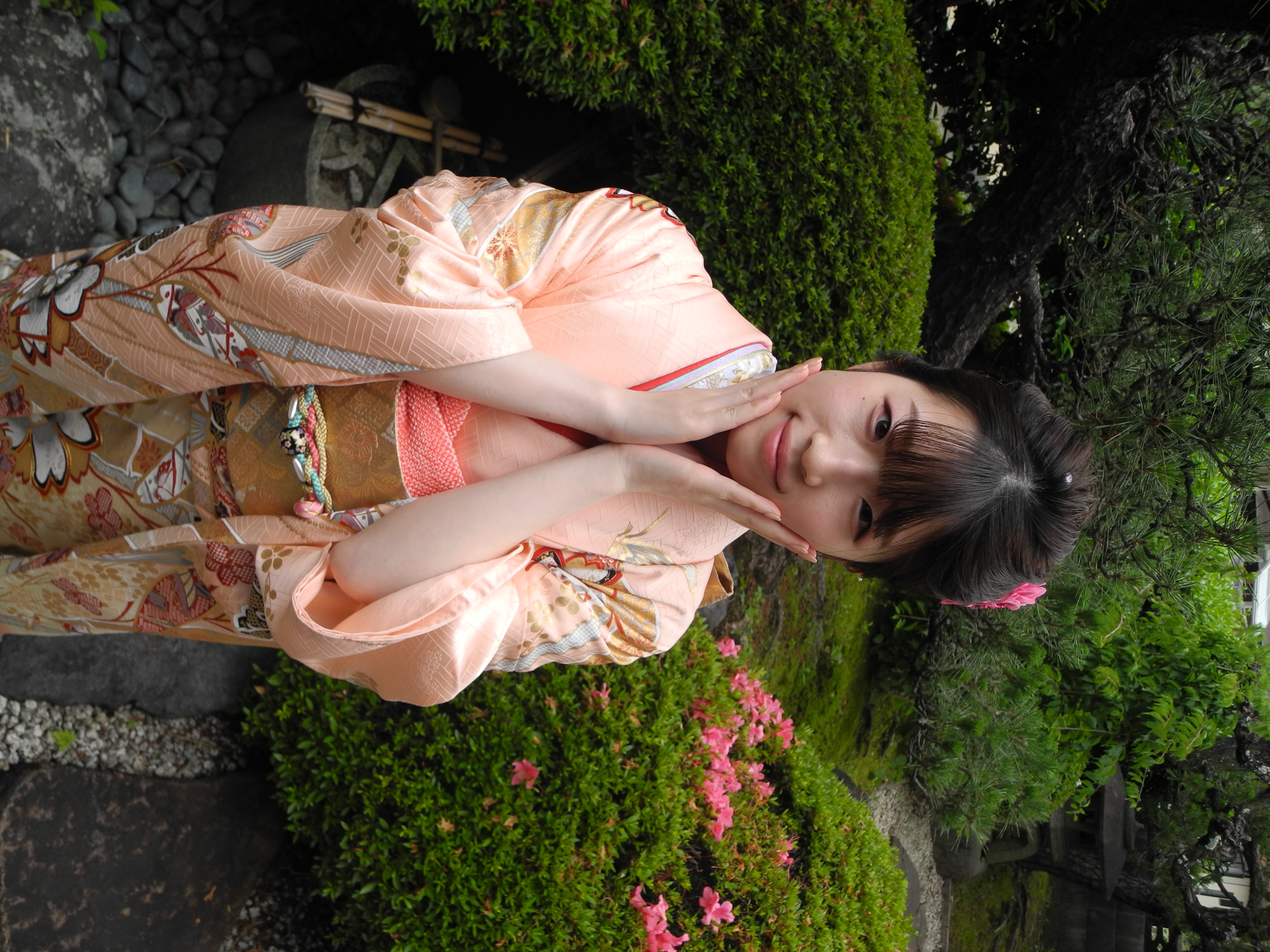 重ね襟に梅の花が付いたものや、帯揚げ、帯締めにピンクを合わせて、可愛らしい雰囲気がとってもお似合いです。