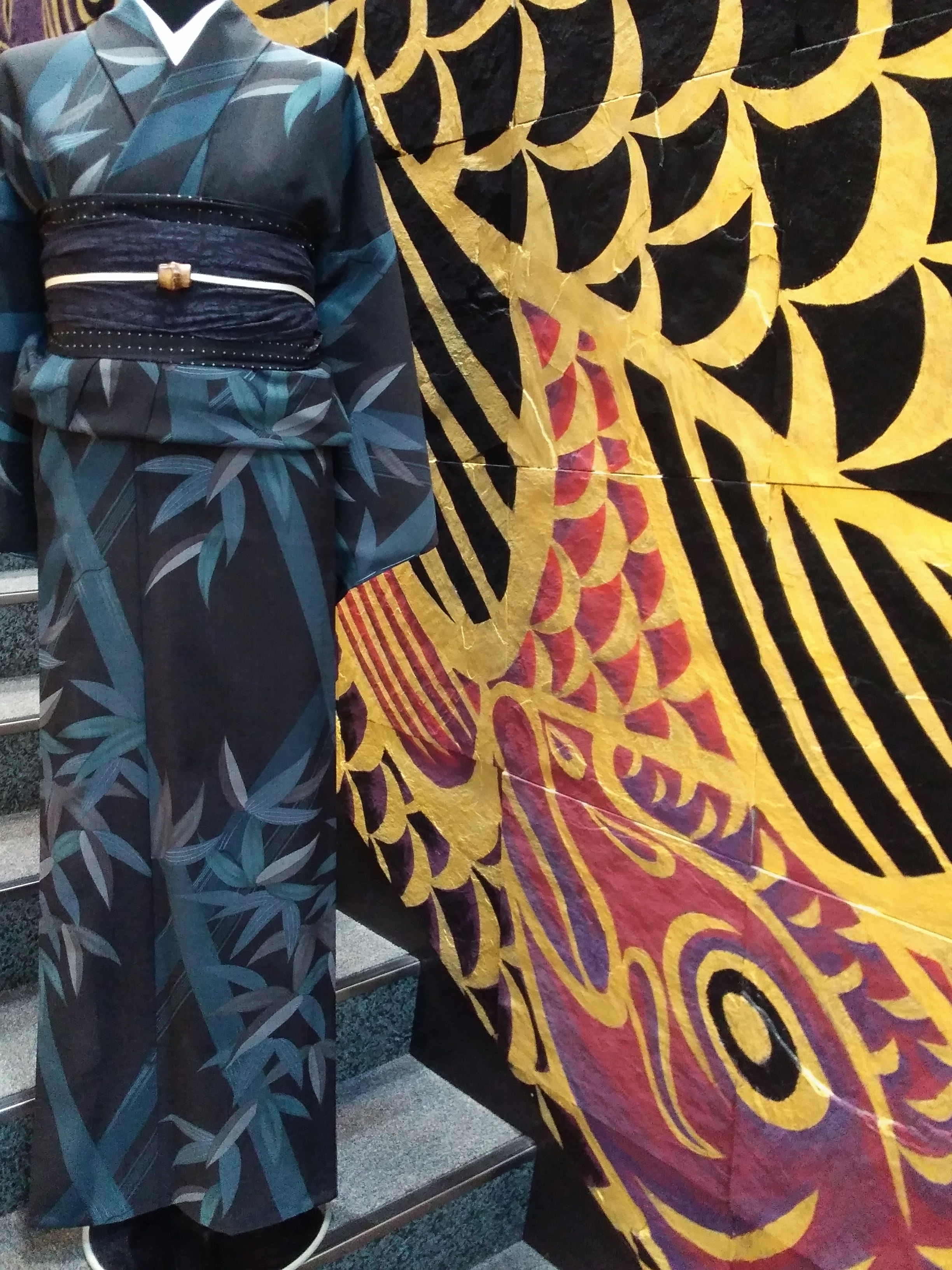今回は兵児帯を2本使ってみました。帯留には焼竹を使ったものを合わせて。