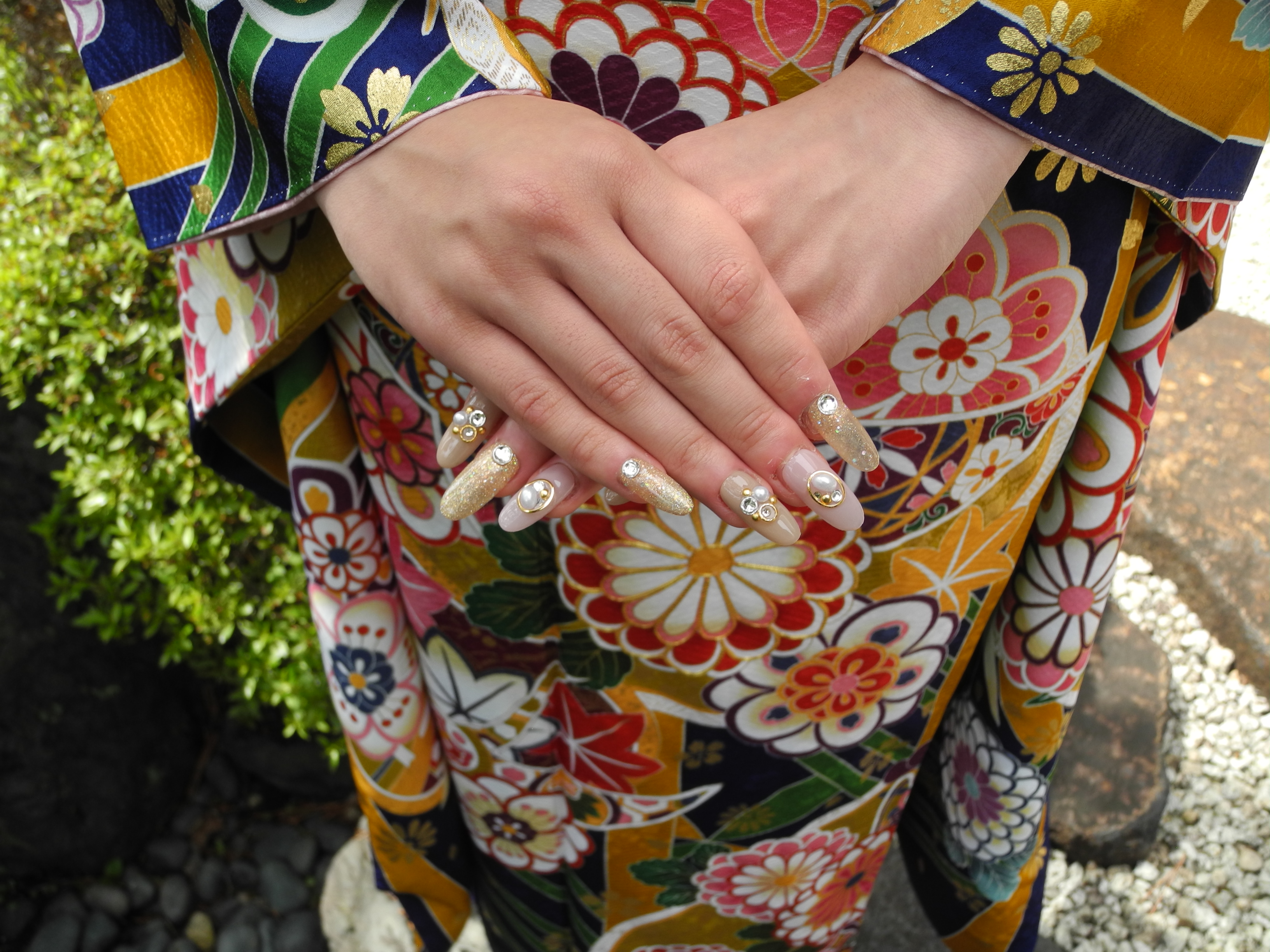 辛子色、緑色と白系でまとめた髪飾りを流行りのふんわり系のヘアスタイルに合わせて。