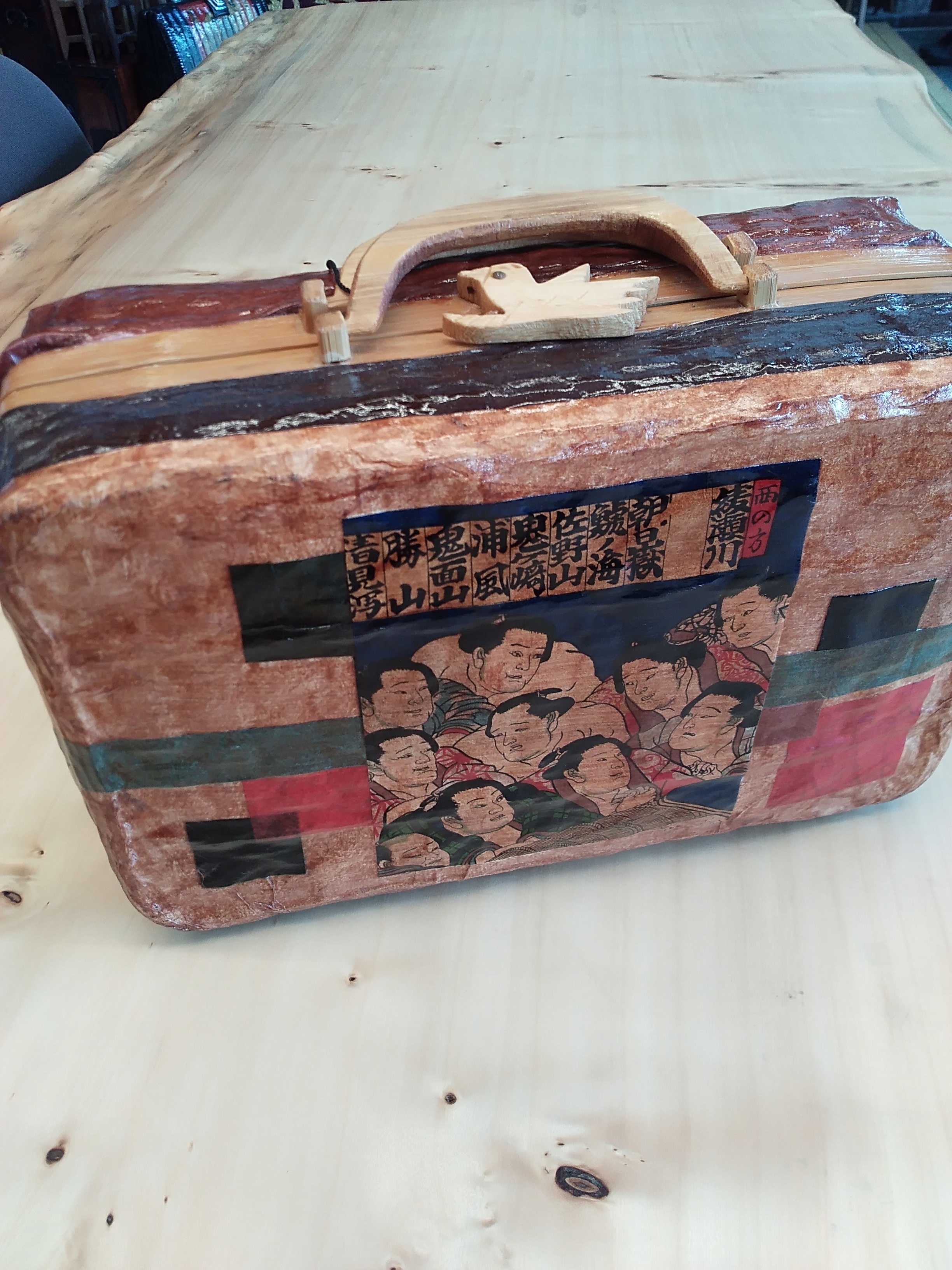 一閑張りのバッグには、綾瀬川、朝日嶽など力士の番付が記載されていますが、明治時代のお相撲さんのようです。