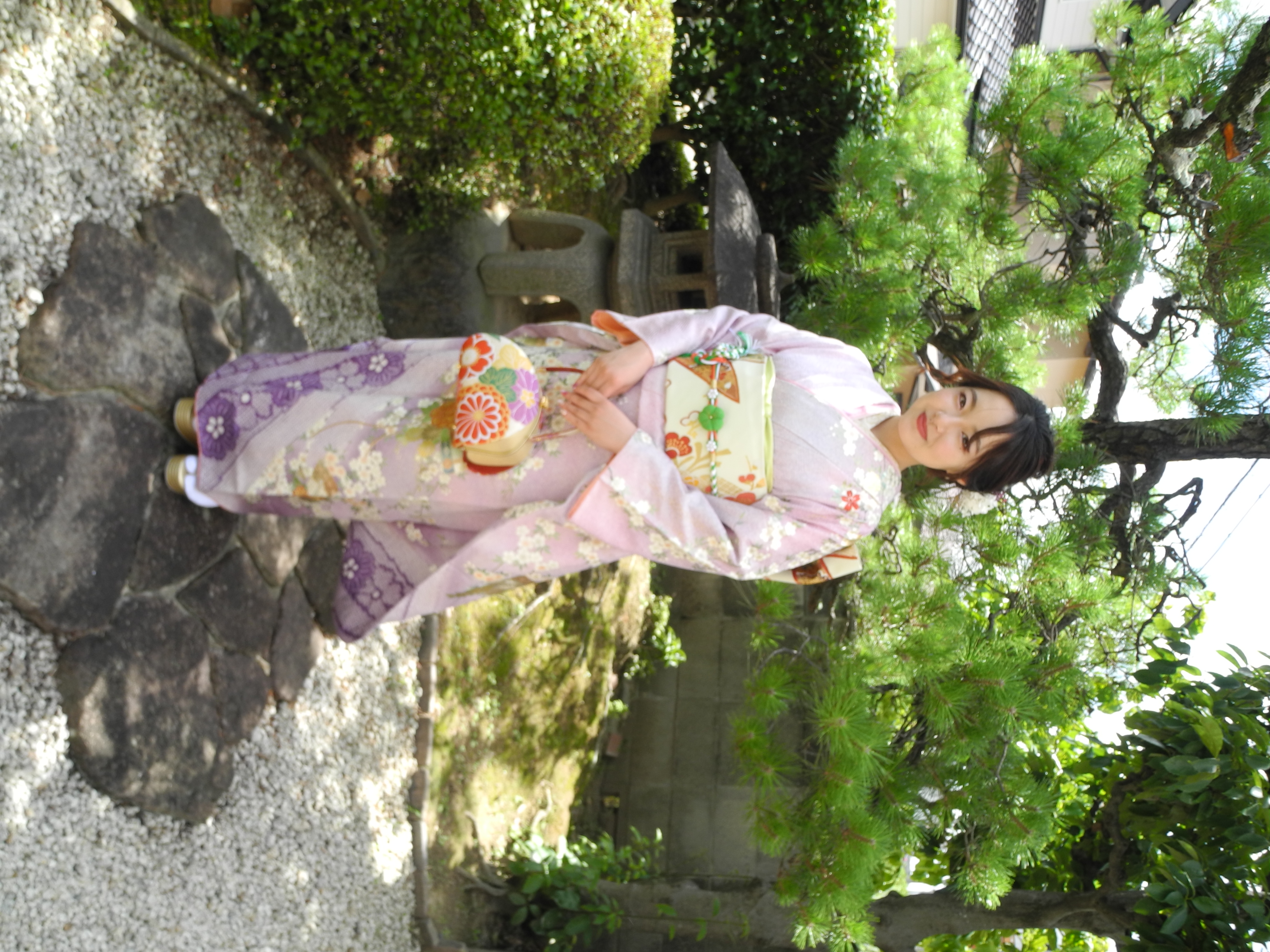 暑いさなかにお庭に出て頂き、撮影していただきましたが、藤色のお振袖に真っ白な素肌の嬢様が何とも涼し気。