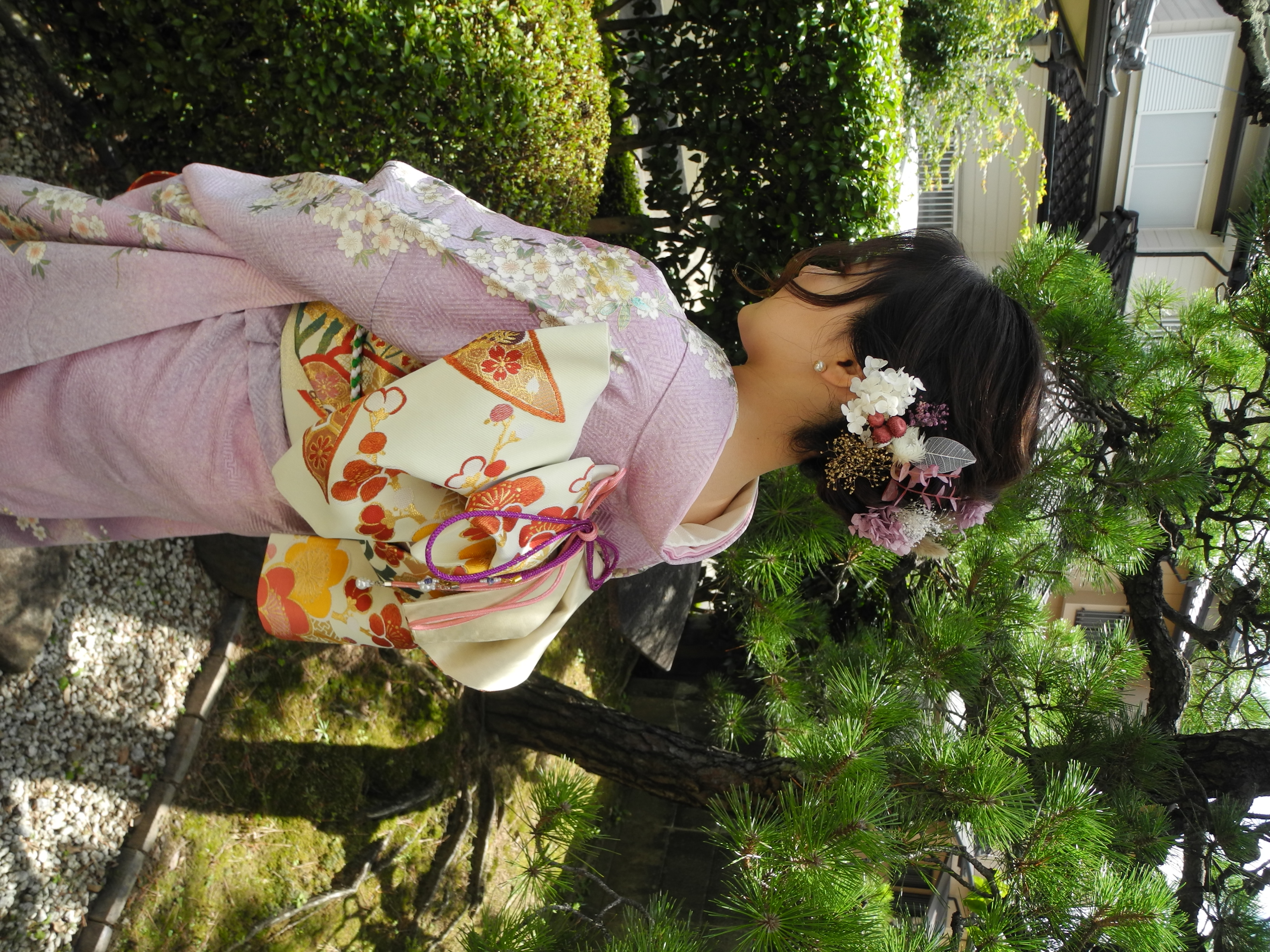 髪飾はお振袖の藤色に合わせて。