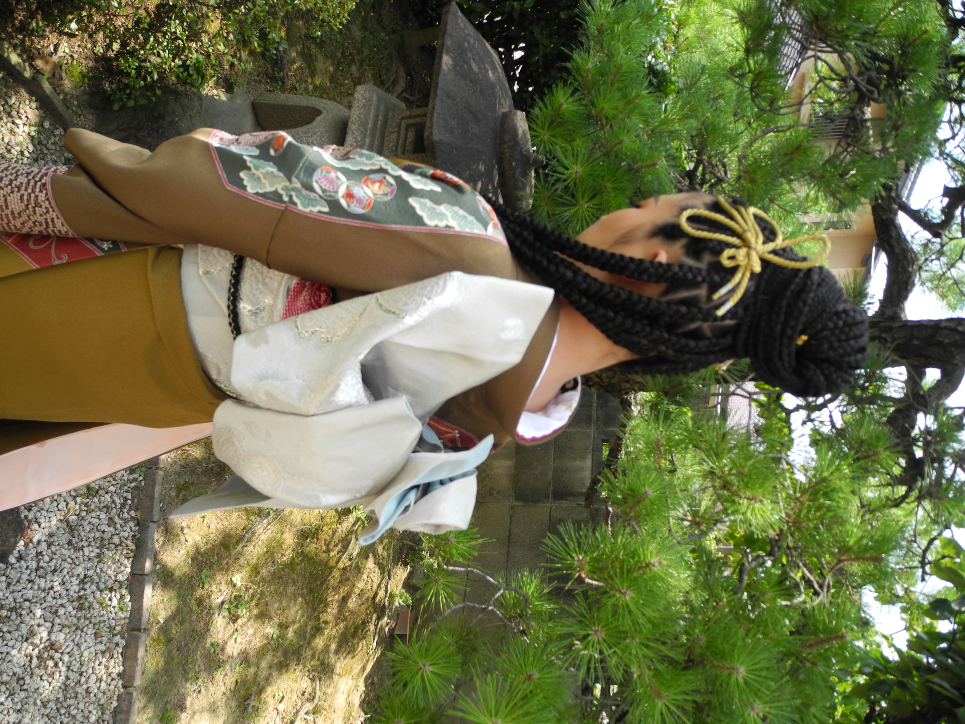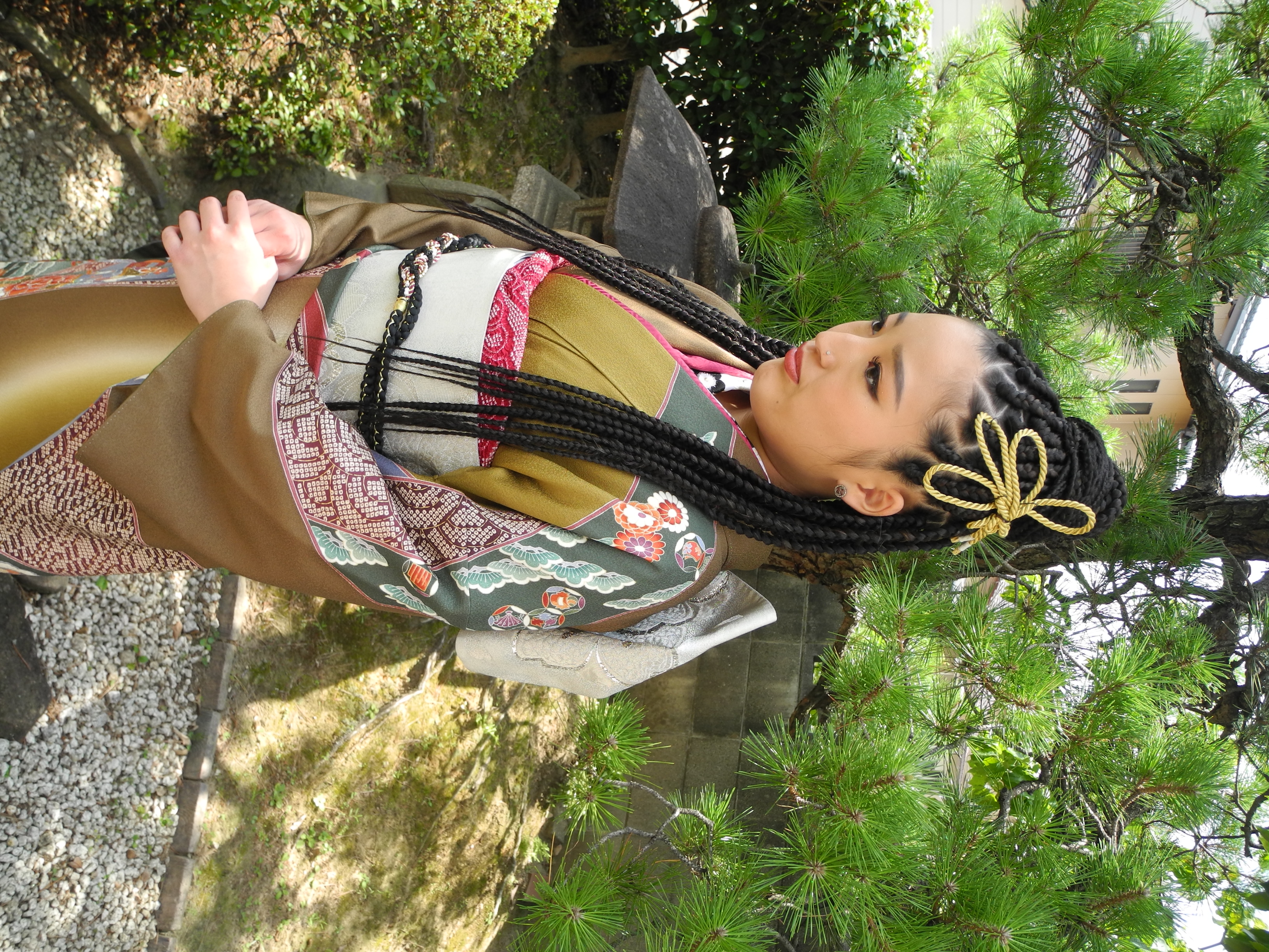 渋いお着物を選ばれたお嬢さまでしたが、当日、コーンロウ(髪型)でご来店いただきました。