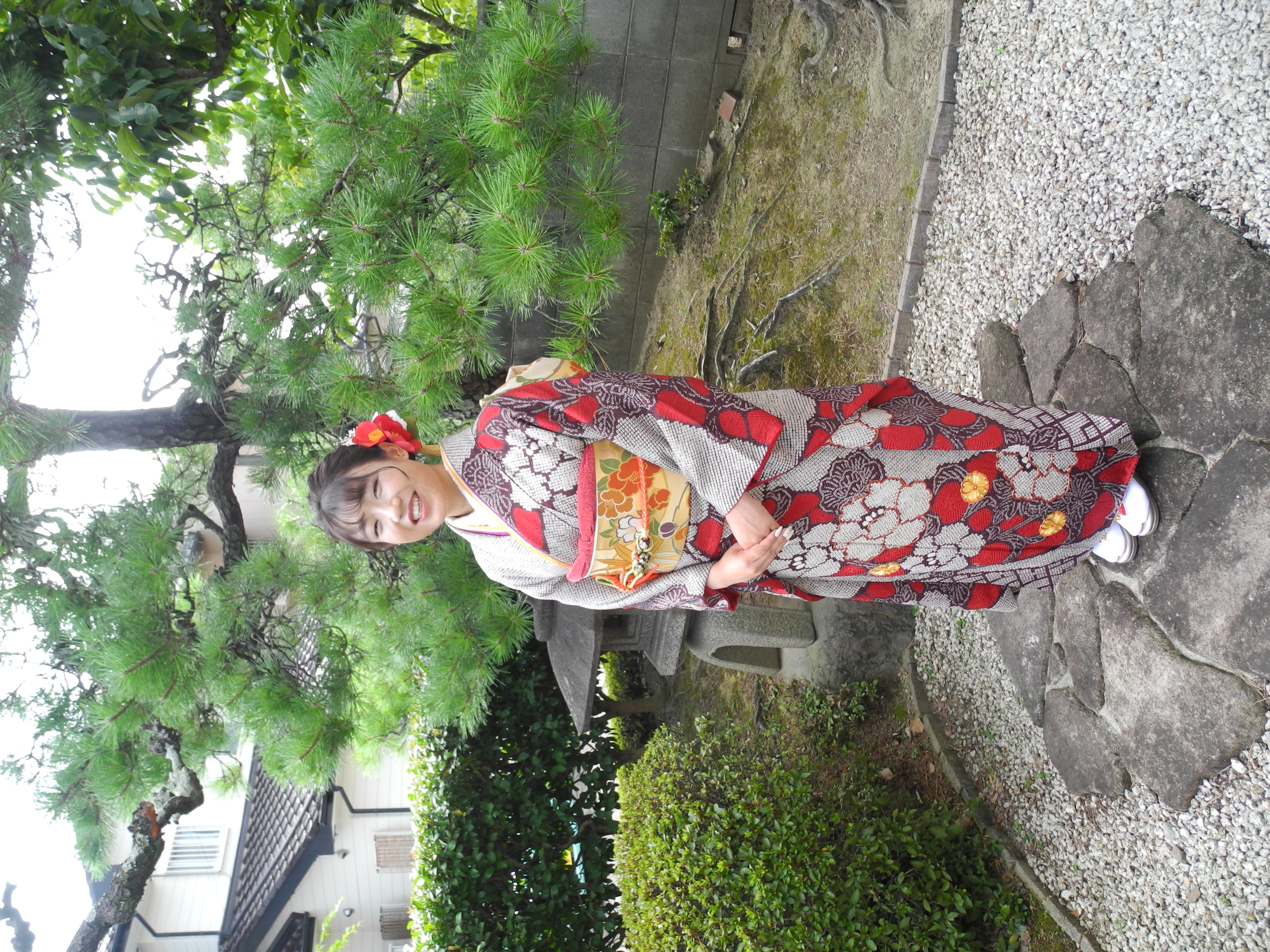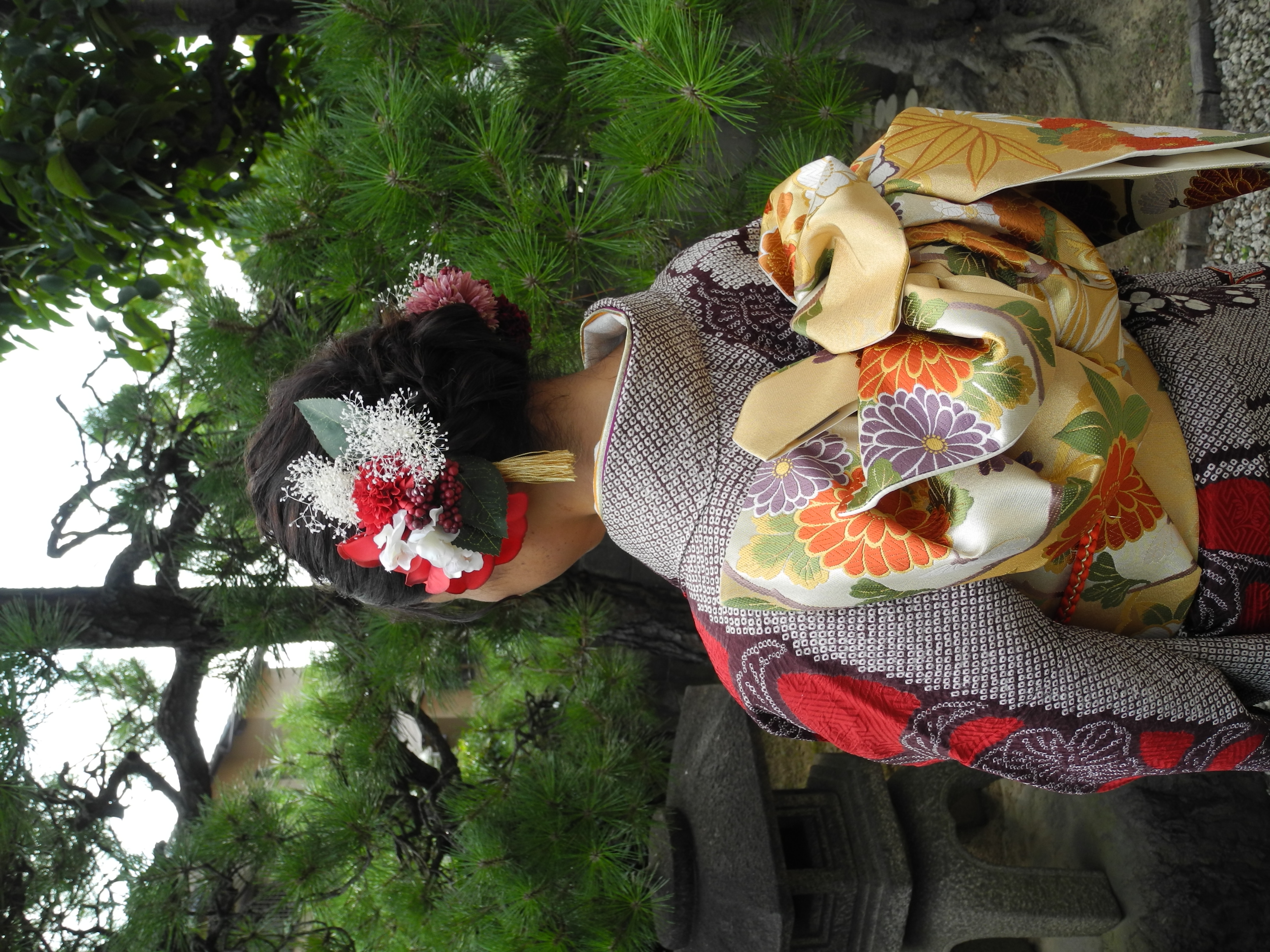 髪飾も椿。帯の柄と、着物の赤を撮った組み合わせが純和風で素敵♡