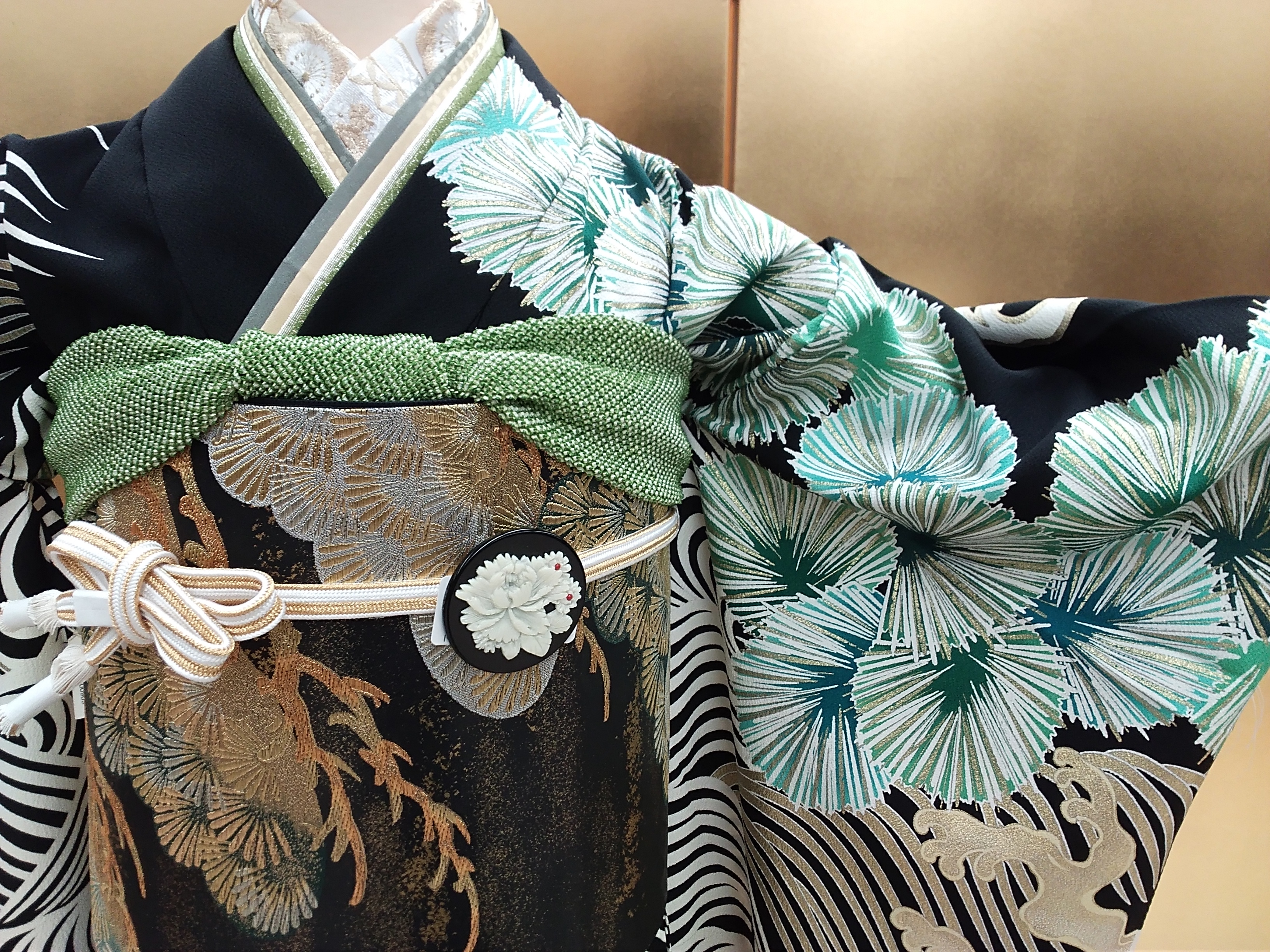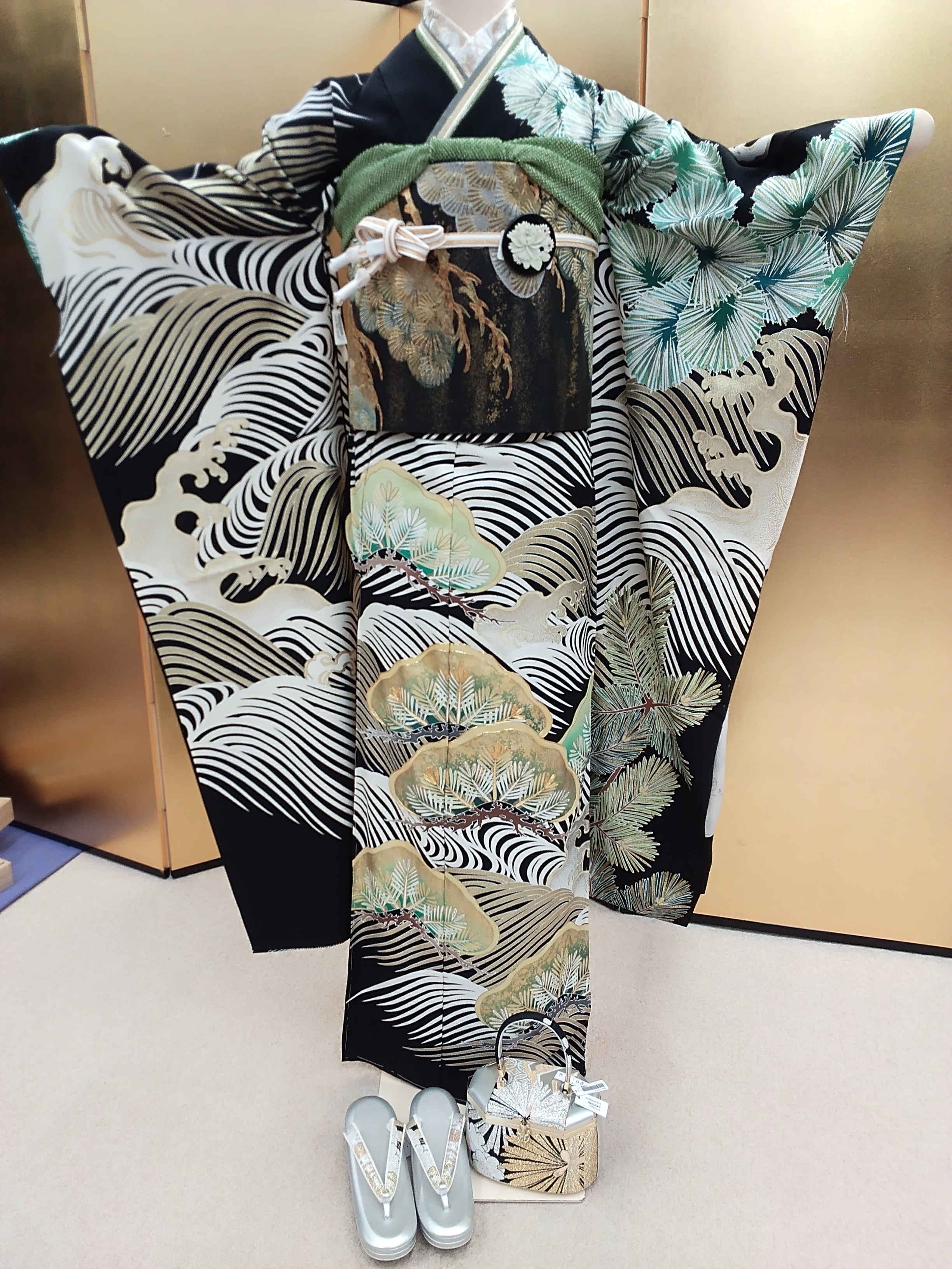 この振袖には、波柄に加え、針松、若松、老松が描かれた勢いのあるお振袖。