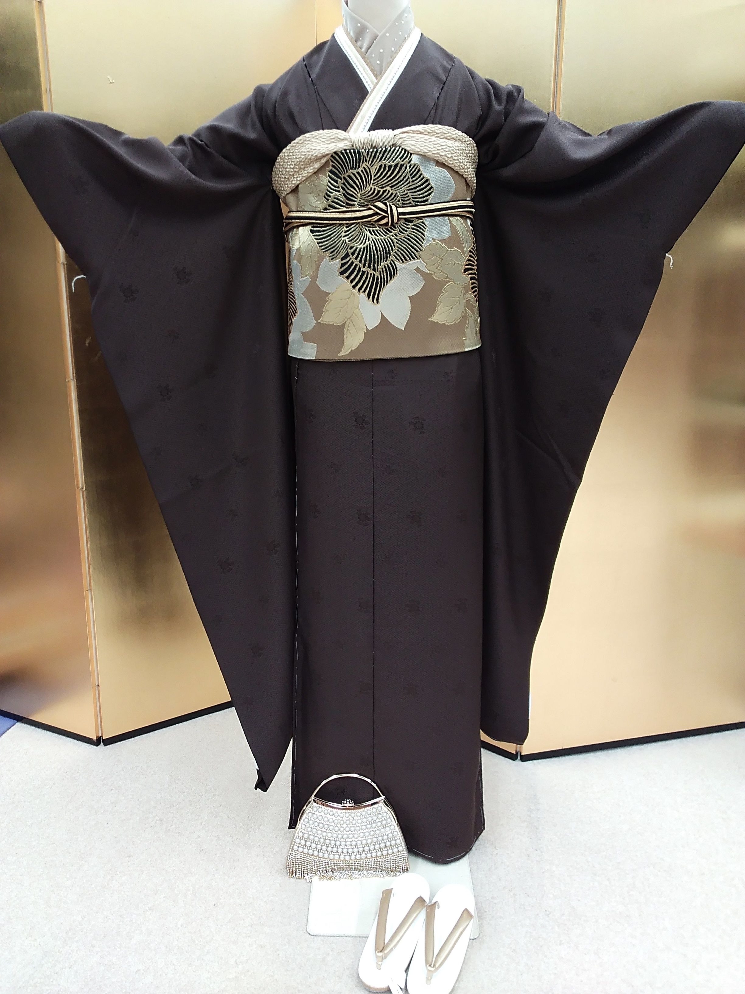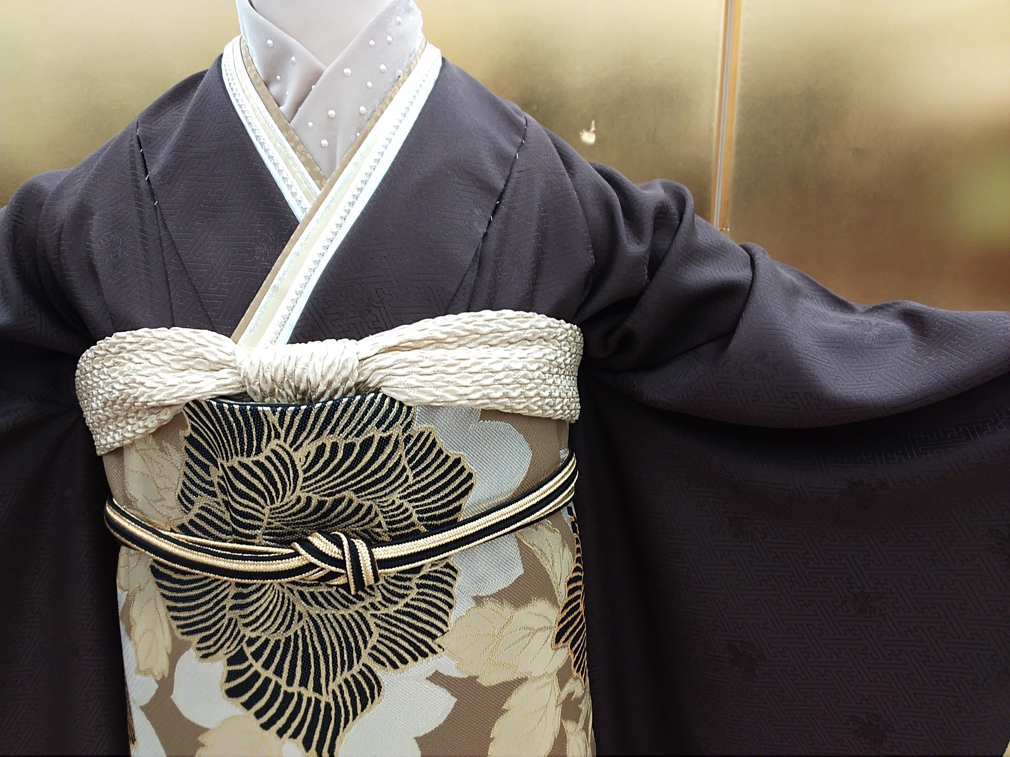重ね襟はミルクティー色、金、ベージュ、白地にパール。