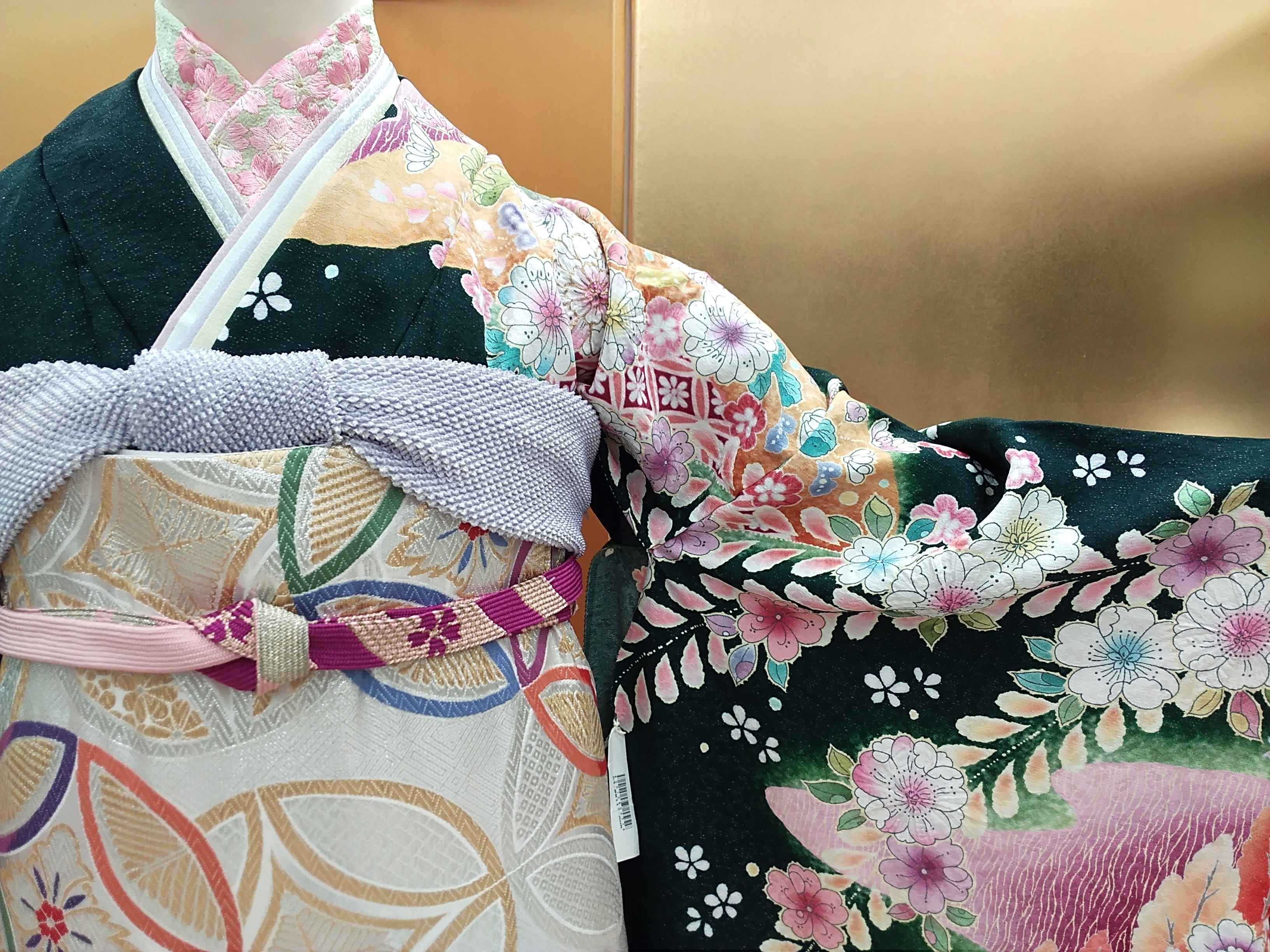 半衿は黄緑に桜満開の刺繍。