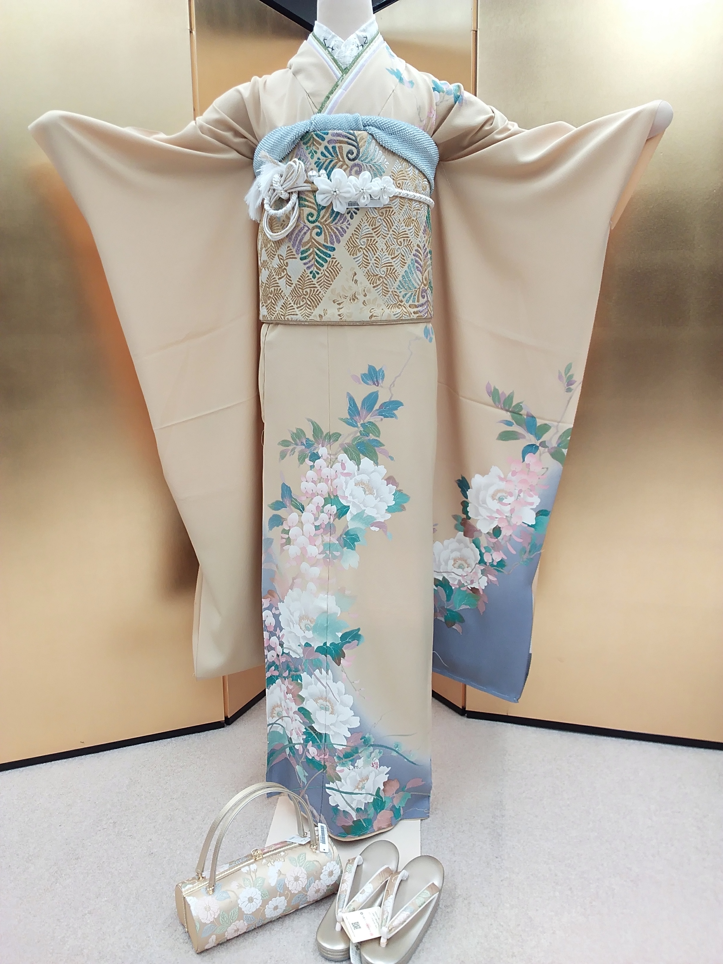 象牙色の友禅のお振袖。牡丹と、藤が手書きならではの美しい色合いで描かれています。
