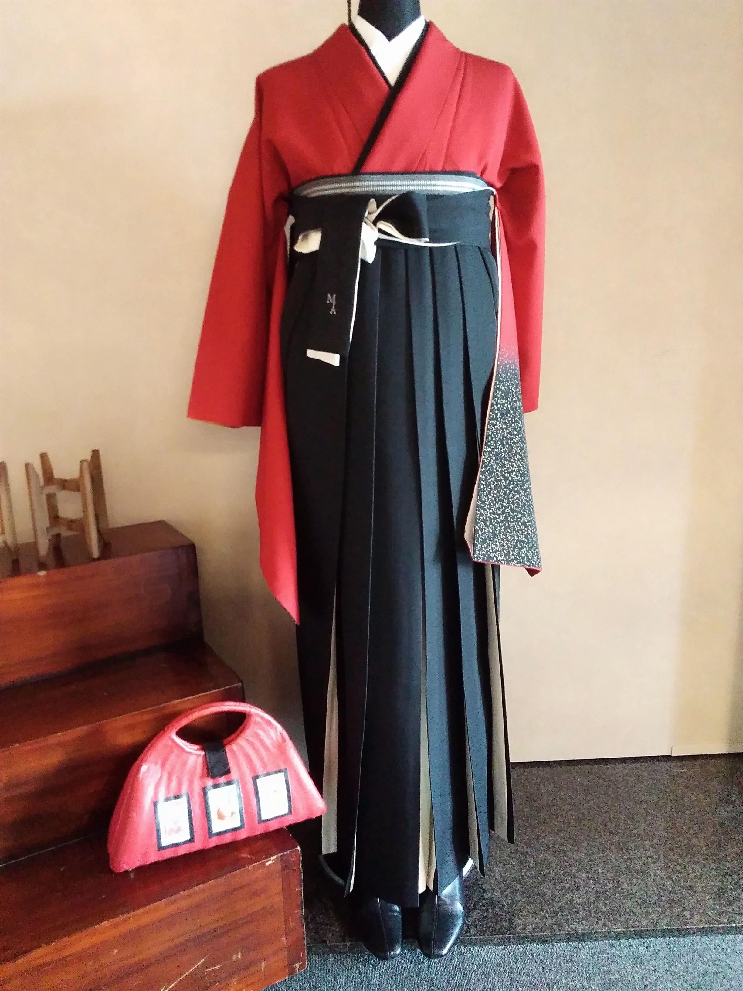 こちらの袴は歩くと、プリーツの中の白地がちらりと見えて個性的。ブーツを履いて、個性的なバックを持って、ブーツを合わせて。