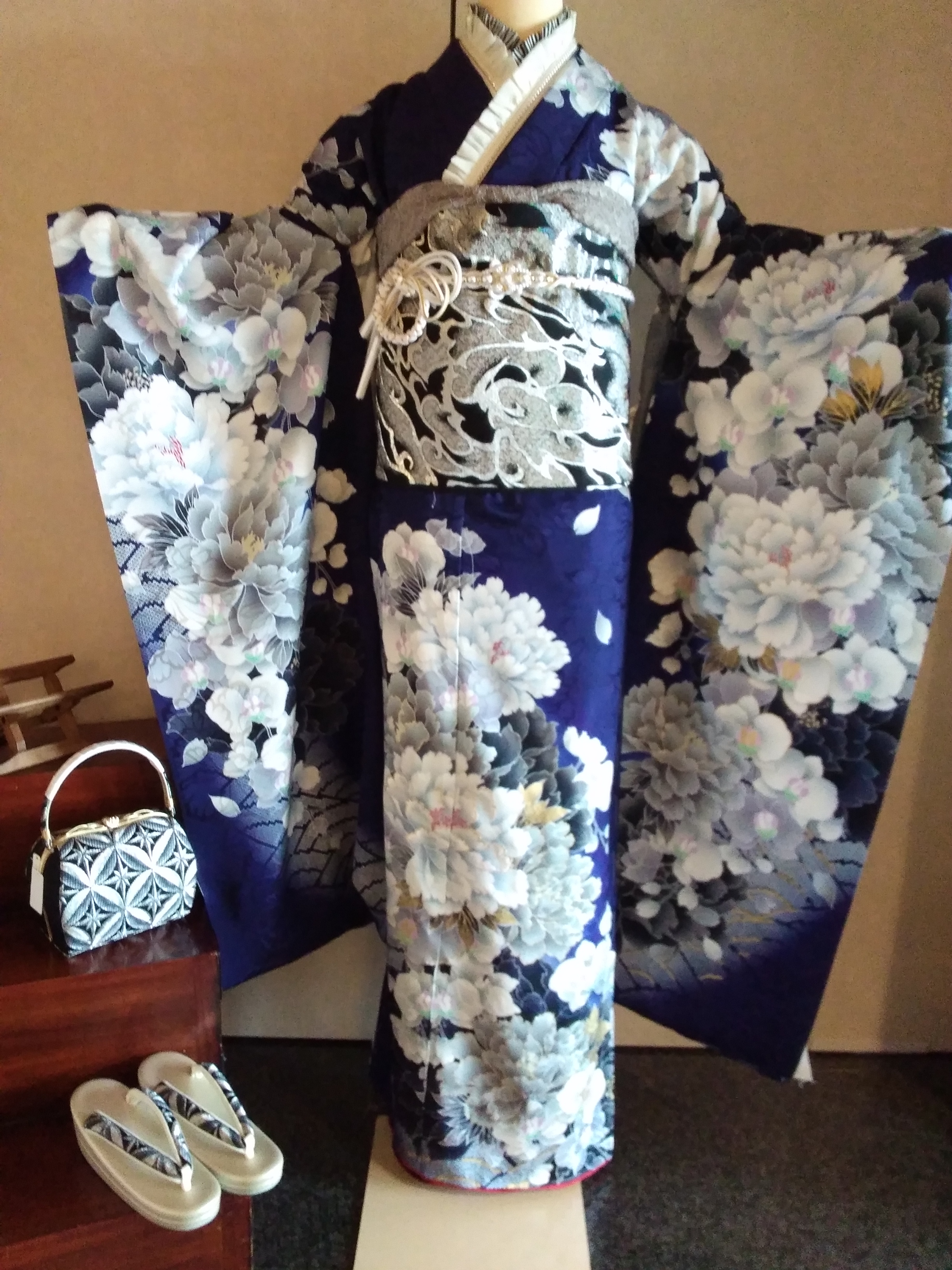 紺色の着物に大きな牡丹と蘭がたっぷりと描かれたお振袖。