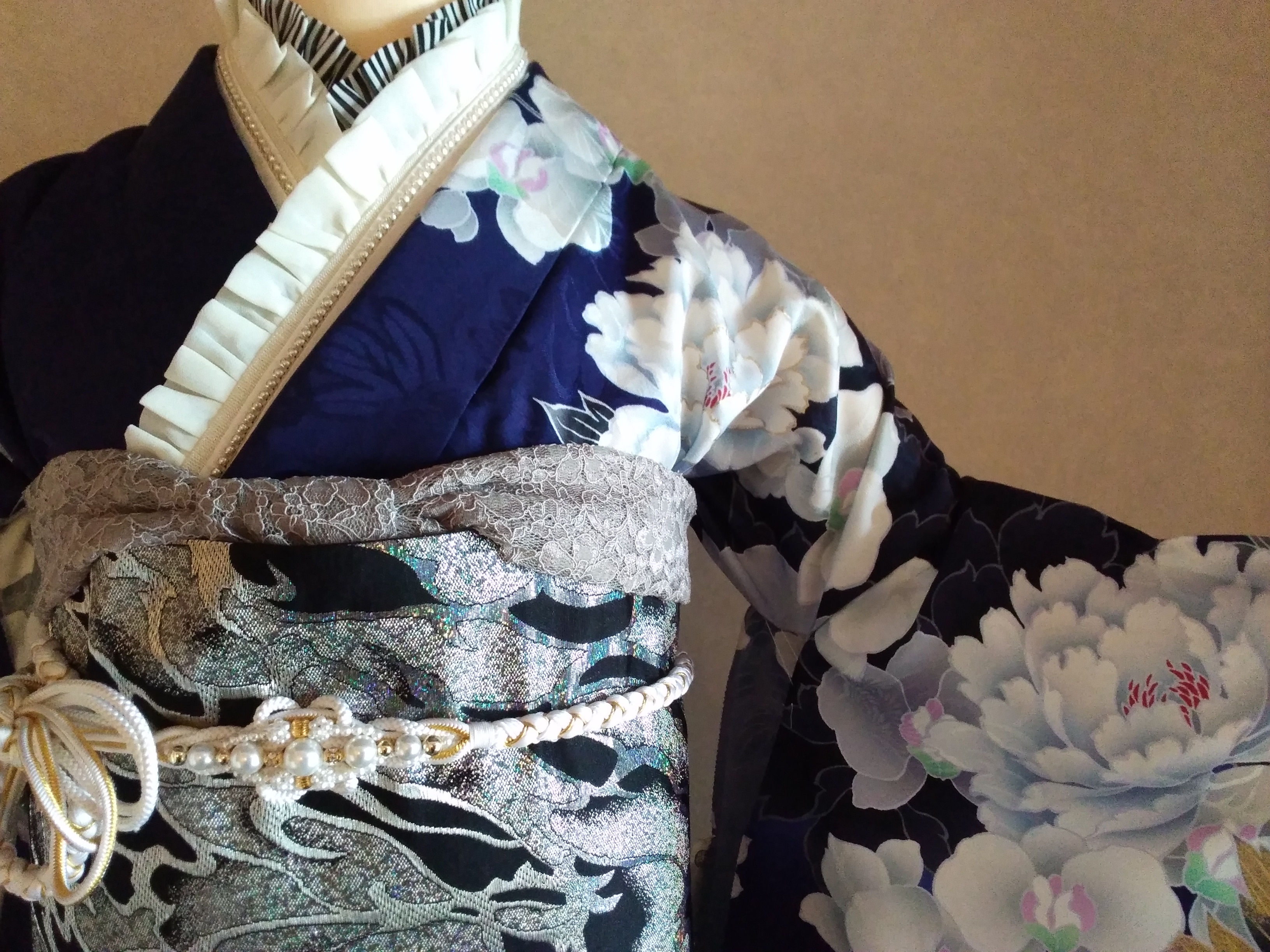 半衿にもレース、重ね襟にもレースとストーンを合わせて。薔薇や蘭の洋花と呼ばれるお花にはよく合うと思います。