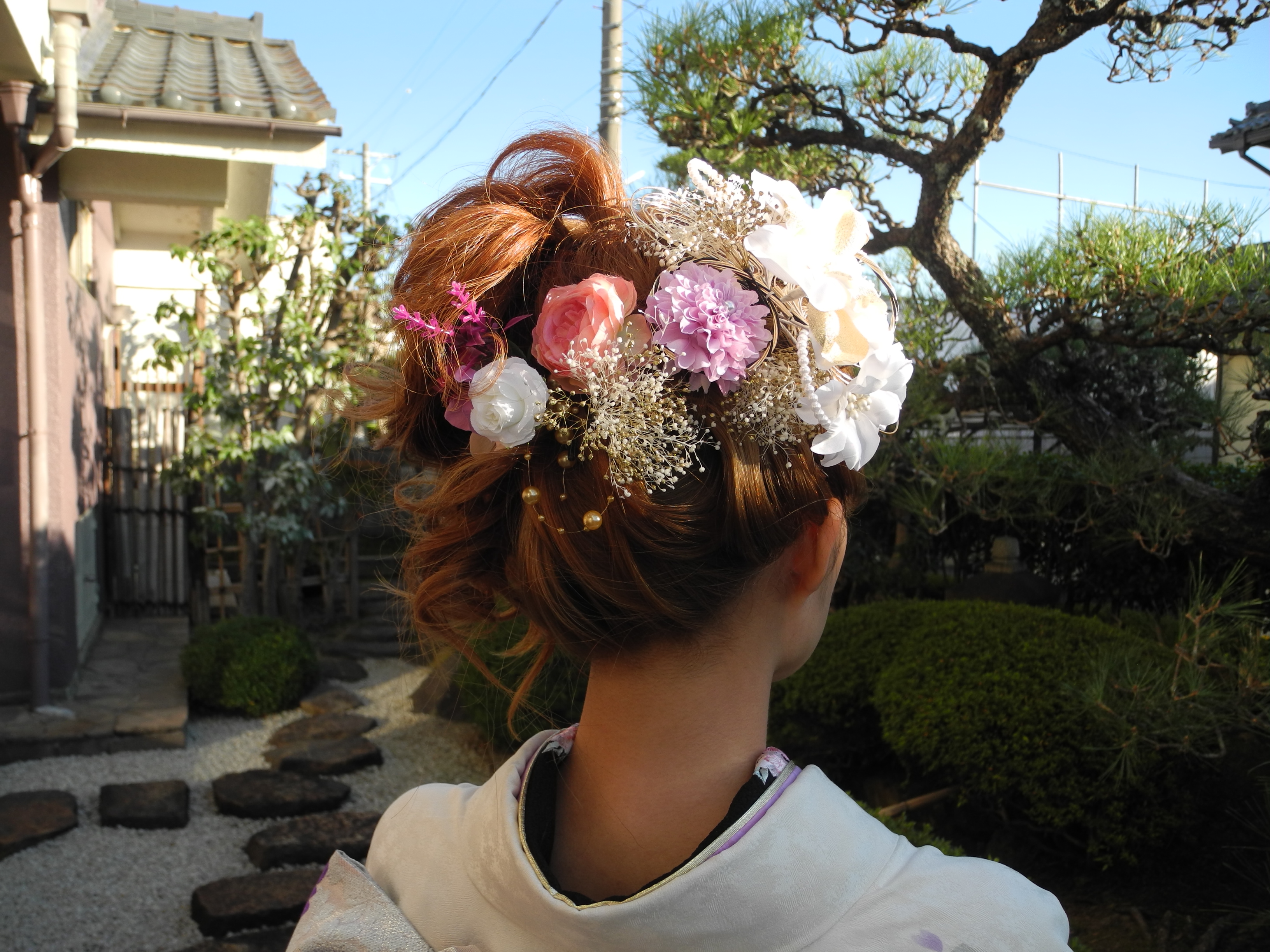 最近では、一番人気の髪型です。髪飾りの色をお振袖に合わせてコーディネイト。少しくすんだ色味が流行りです。