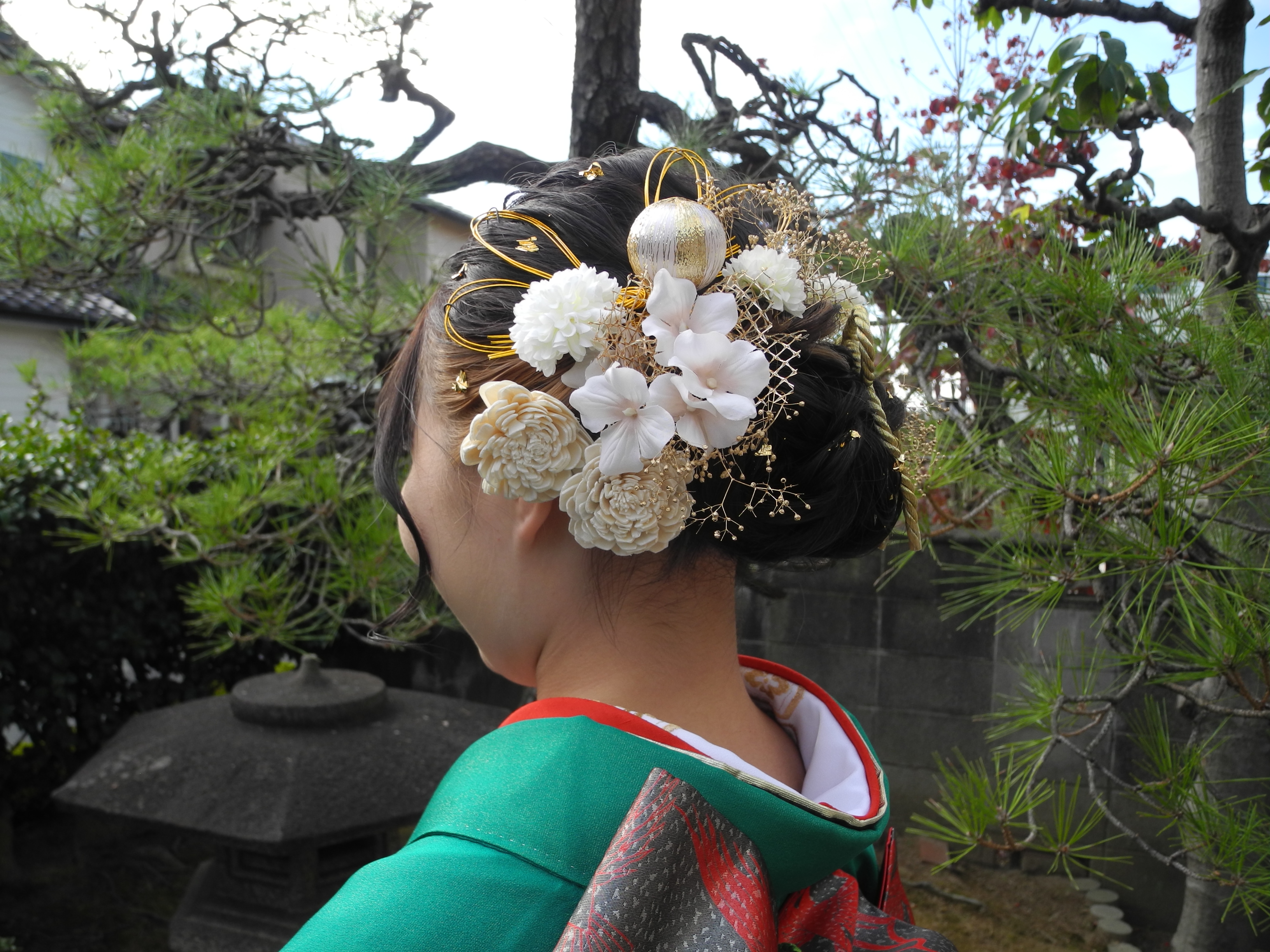 金髪のインナーカラーの入った髪の毛と、白と金の髪飾り、水引、金箔が今風ですね♡