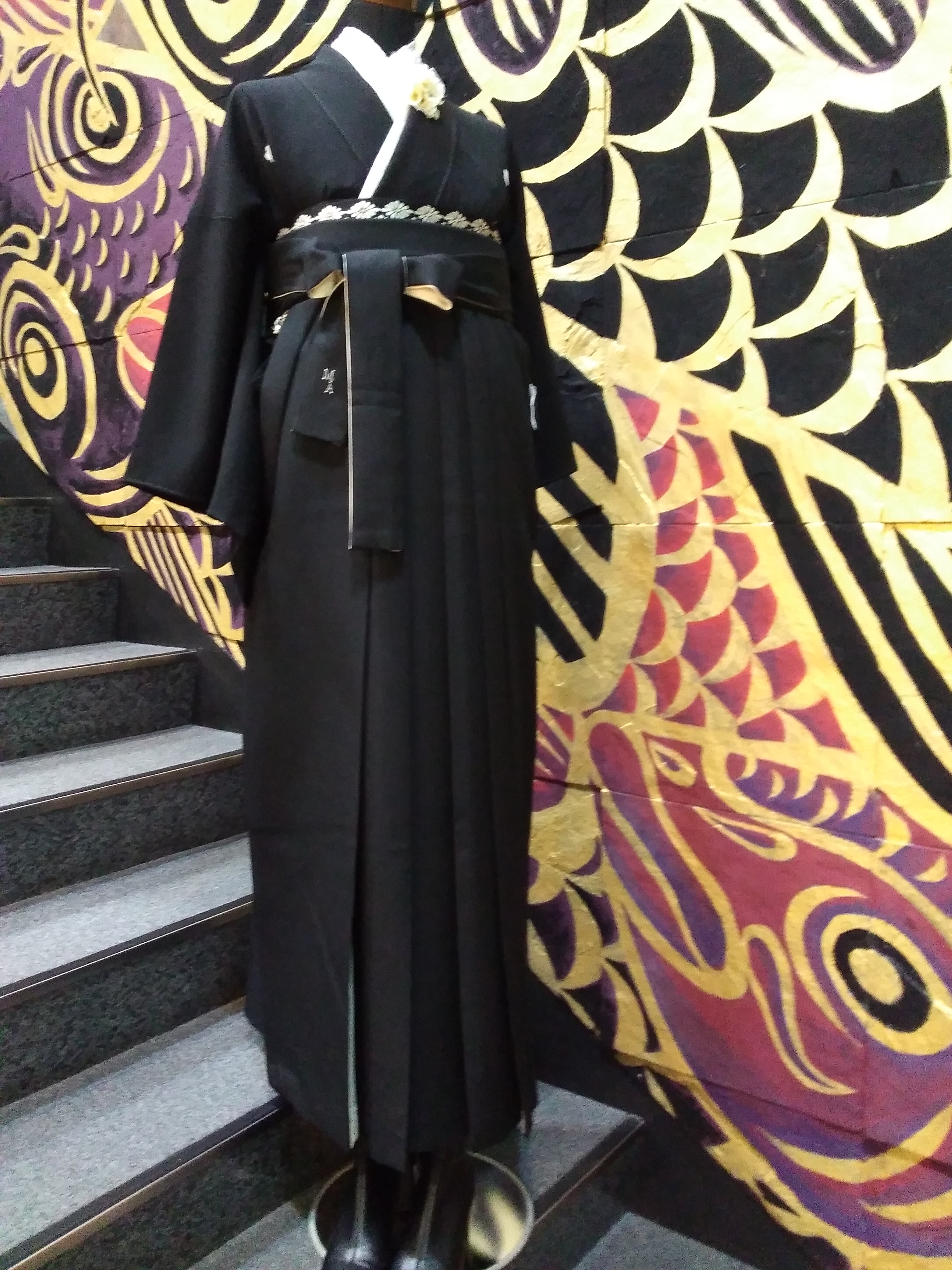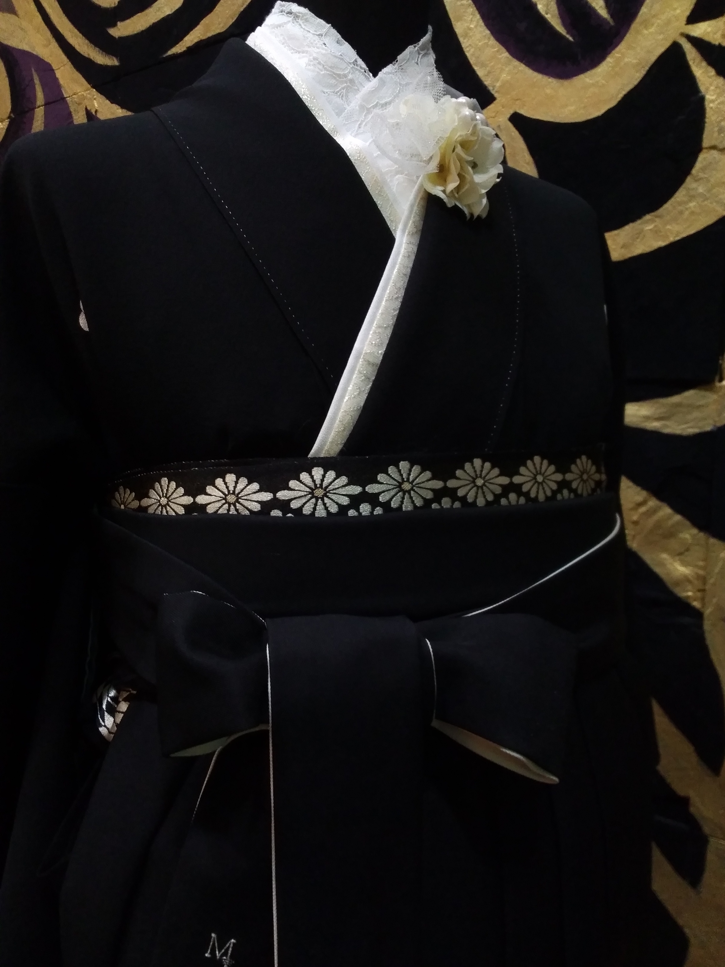黒の紋付に黒の袴だと、かっこよすぎると思うかもしれませんが、レースの半襟、白の重襟、胸にコサージュを付けるとあら不思議。