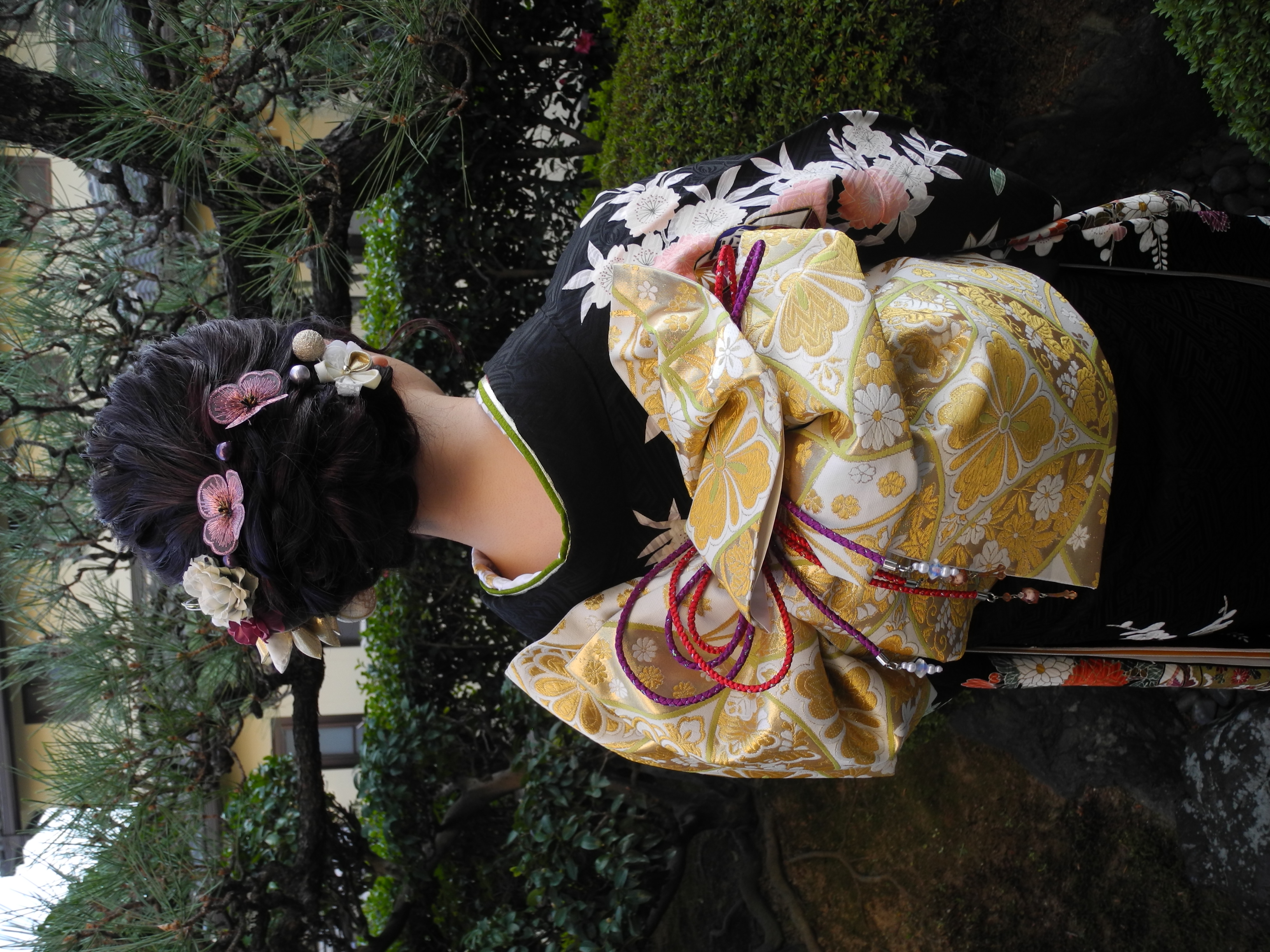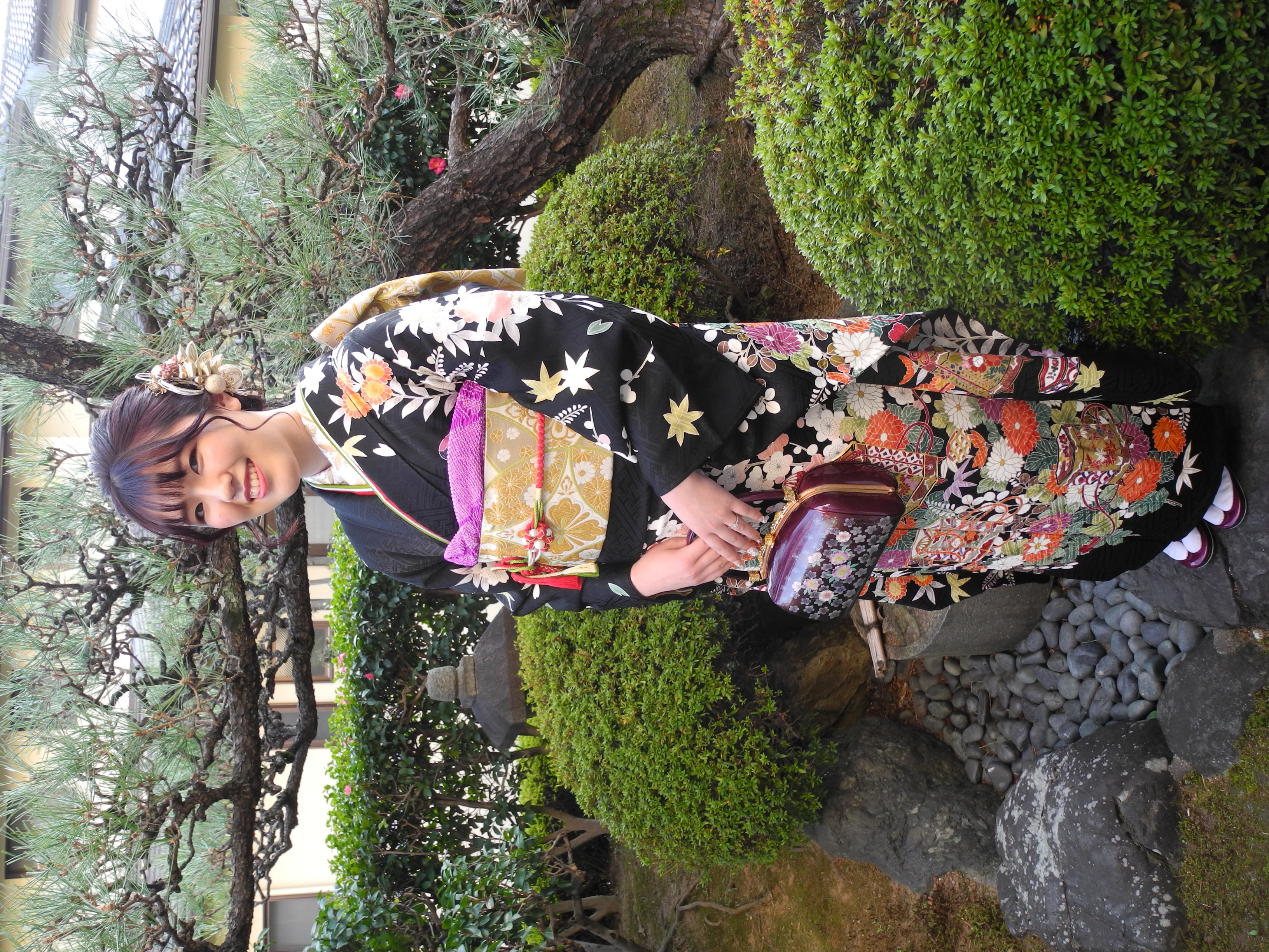 黒の古典柄のお着物は、落ち着いた中に、可愛らしさもあり、お嬢様にとってもお似合いですね。