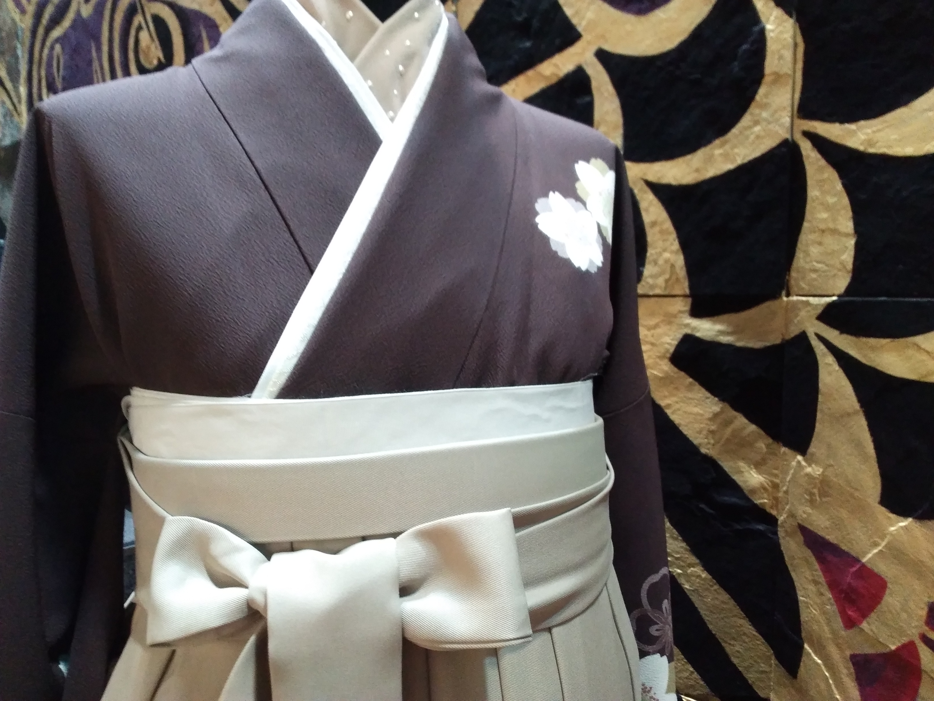 袴を着るのに必要なものは、紐などは別として、長襦袢、着物、半巾帯、袴、ブーツもしくは草履、あれば重ね襟です。