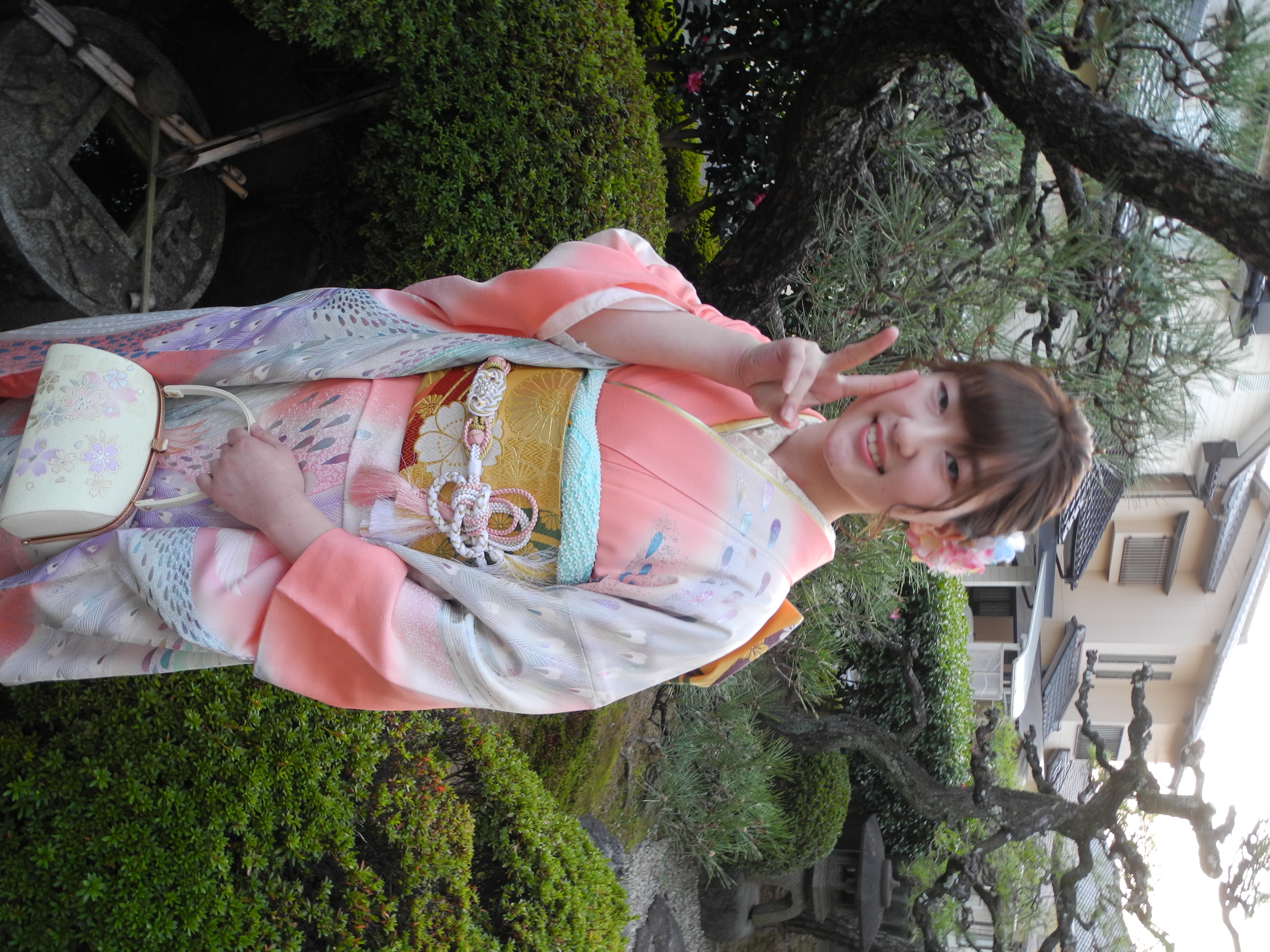 お母様のピンク色に孔雀が描かれたお振袖に小物をコーディネートしていただいたお嬢様。