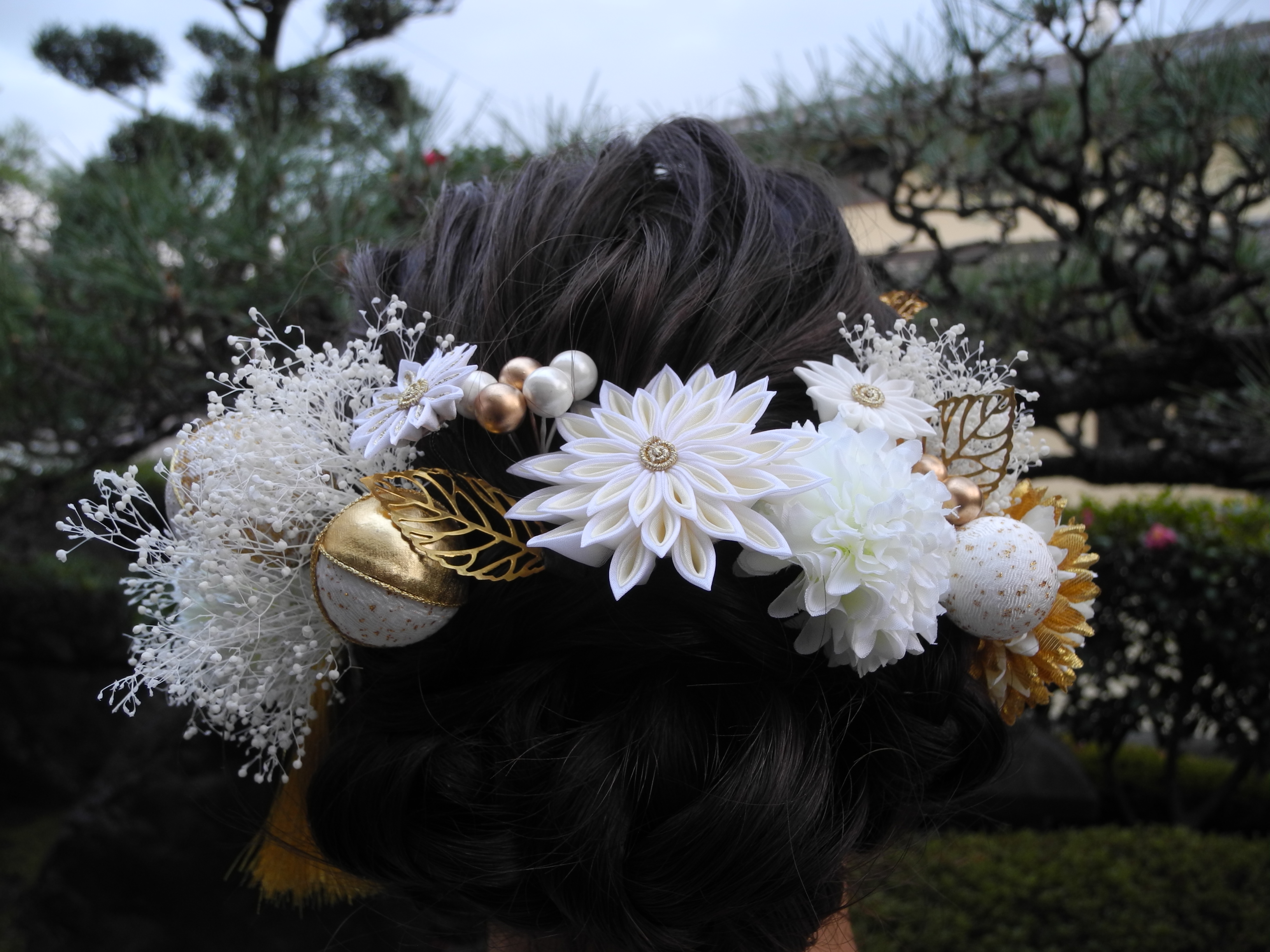 髪飾りも白と金でまとめて。