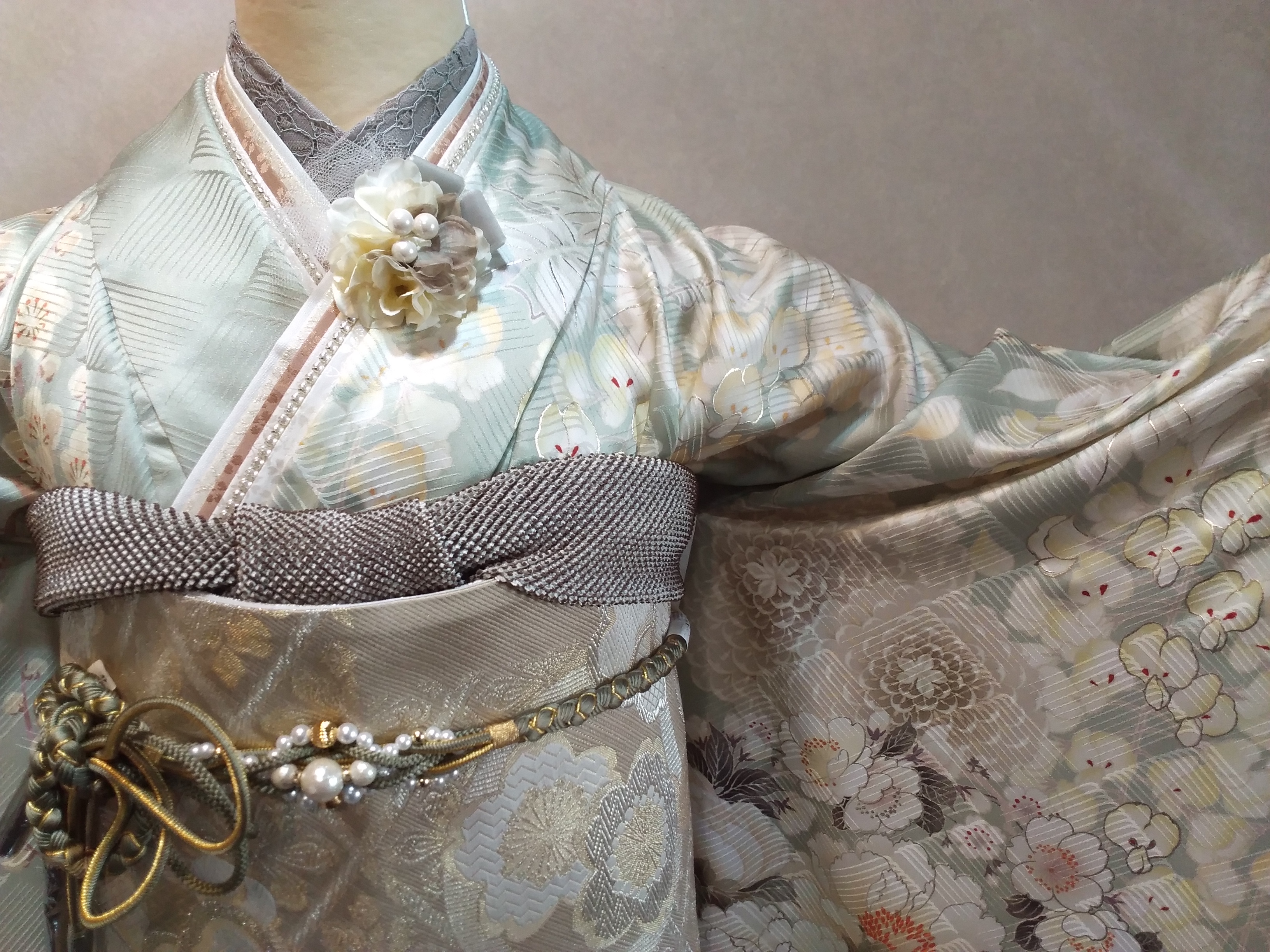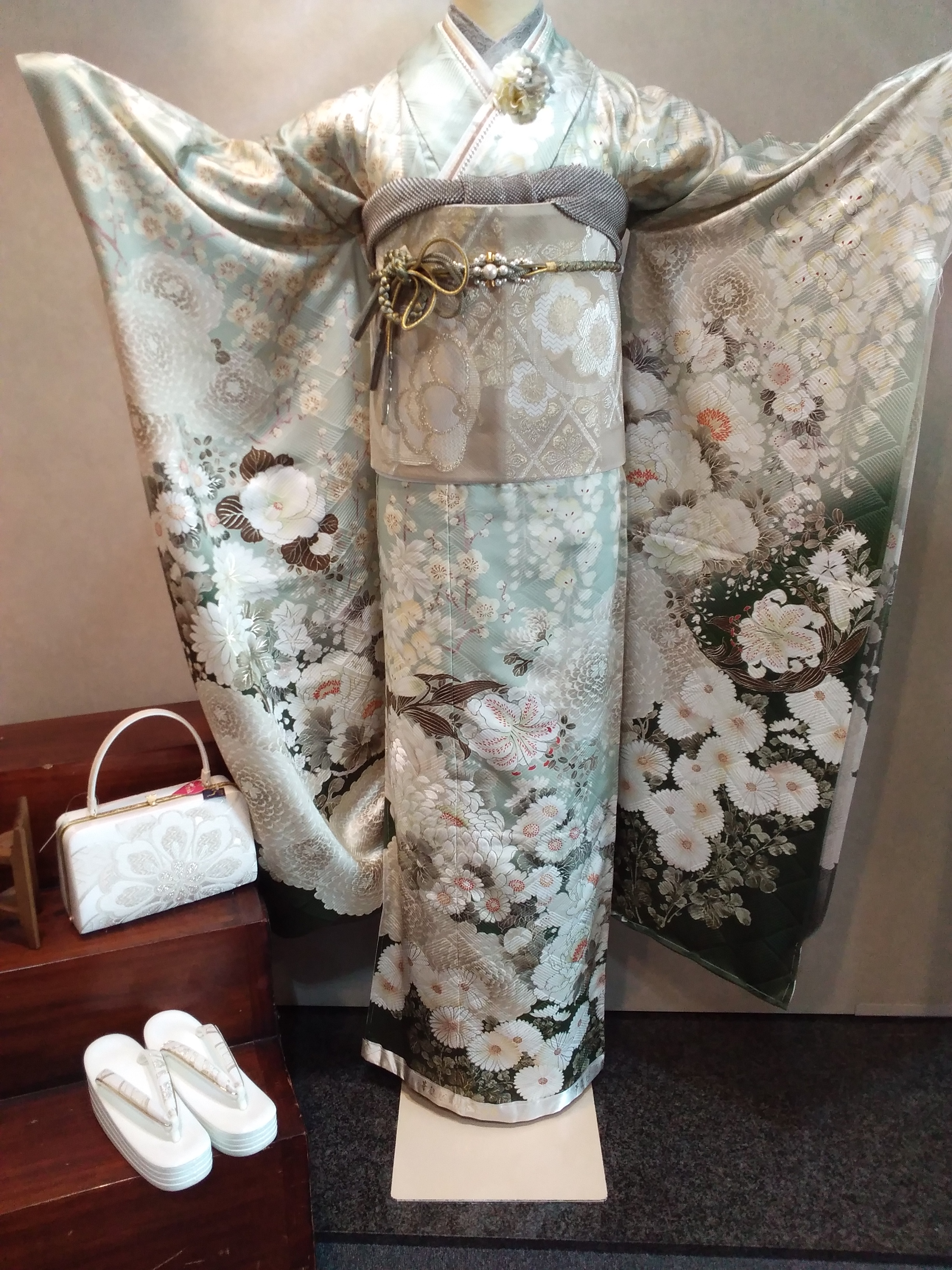 若緑色に梅、藤、百合、撫子、椿、何種もの菊、牡丹、桜などの花々が白をベースに描かれたお振袖。