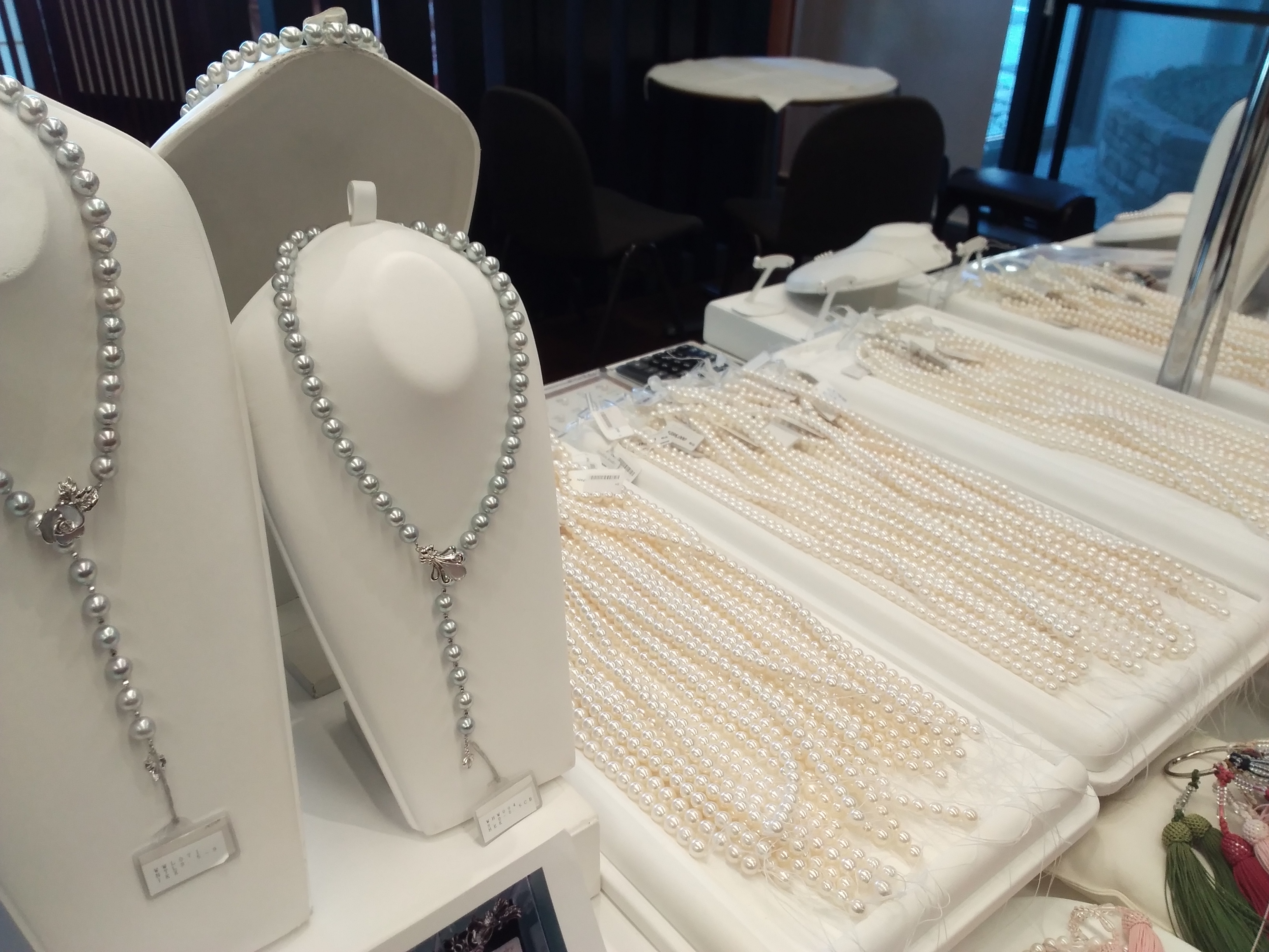 只今、パール展開催中です。真珠の見極め方を教えて頂き、沢山あるものから選んで頂くチャンスです。