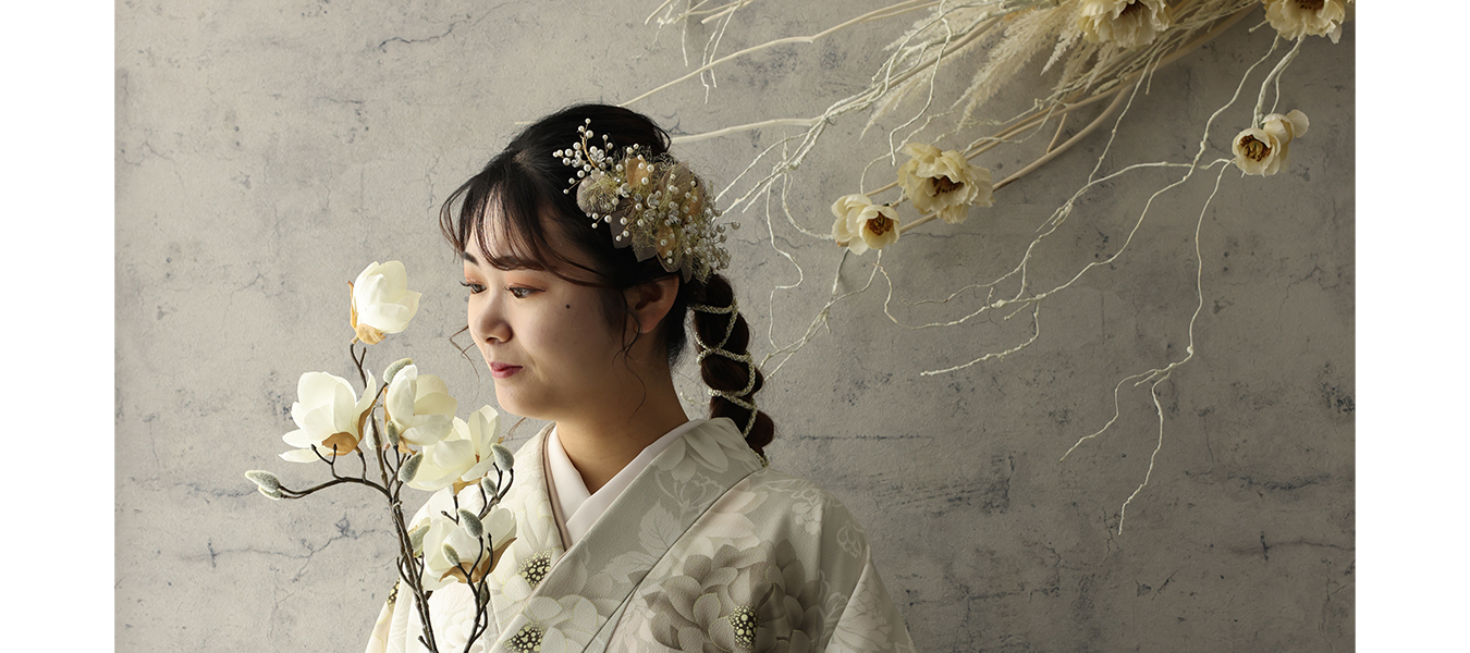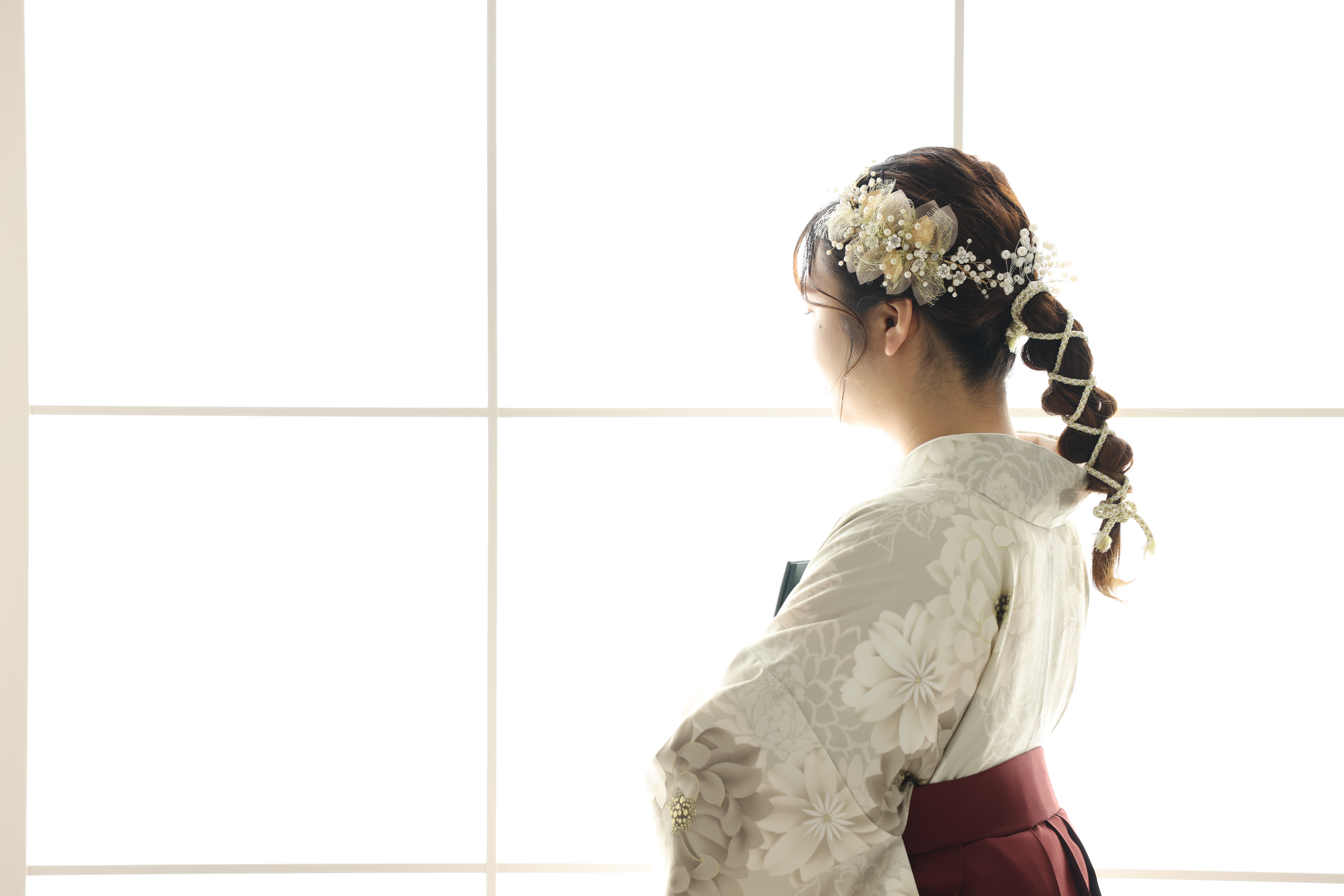 今年流行りのナチュラルカラーな小振袖と髪飾り、コンクリートの背景に良く合いますね💗