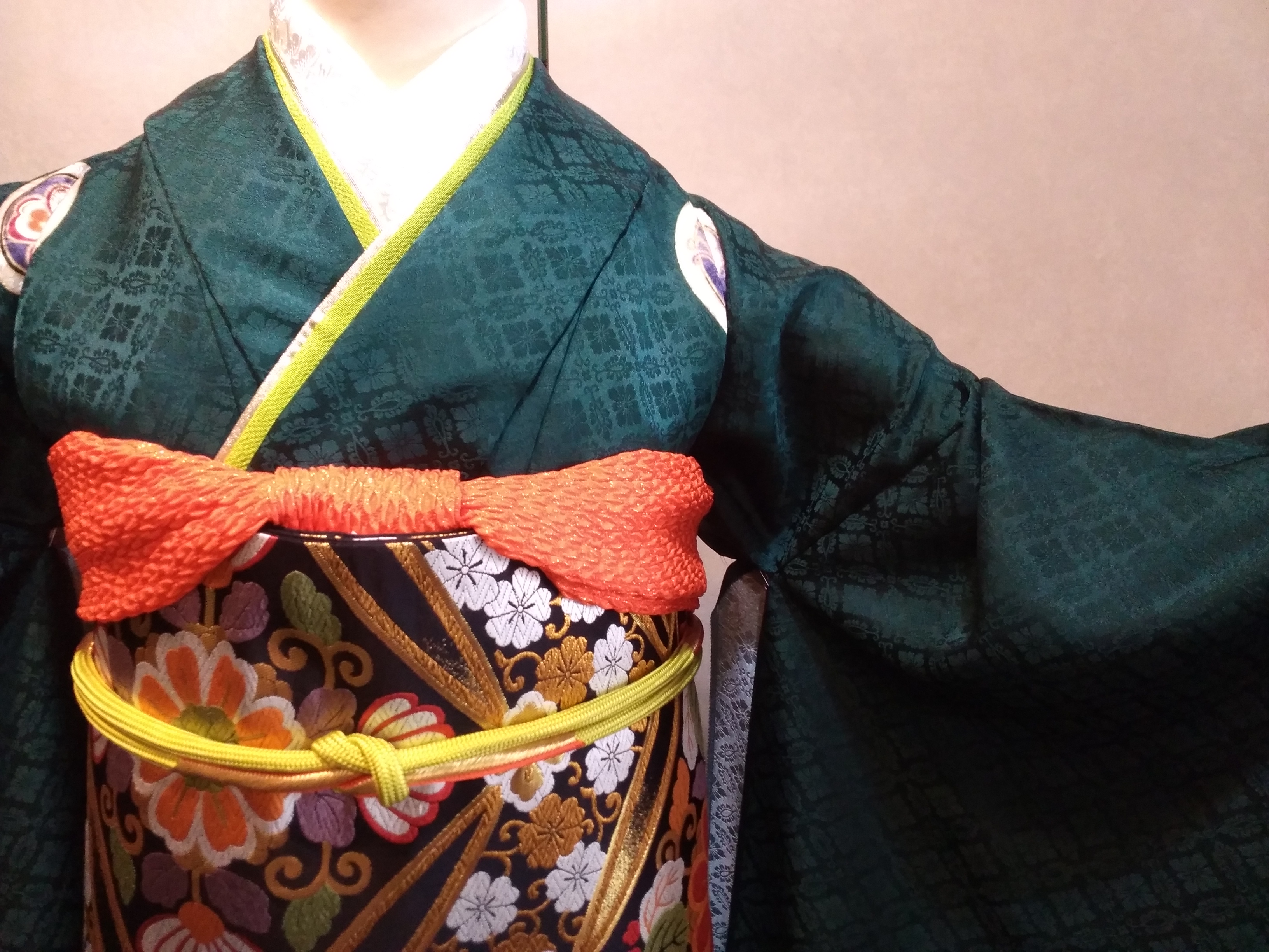以前もこのお振袖をコーディネイトした時は、落ち着いた色合いでシックにコーディネイトしましたが、今回はこの春流行るような元気なオレンジと黄緑を組み合わせて、若々しいコーディネイトにしました。