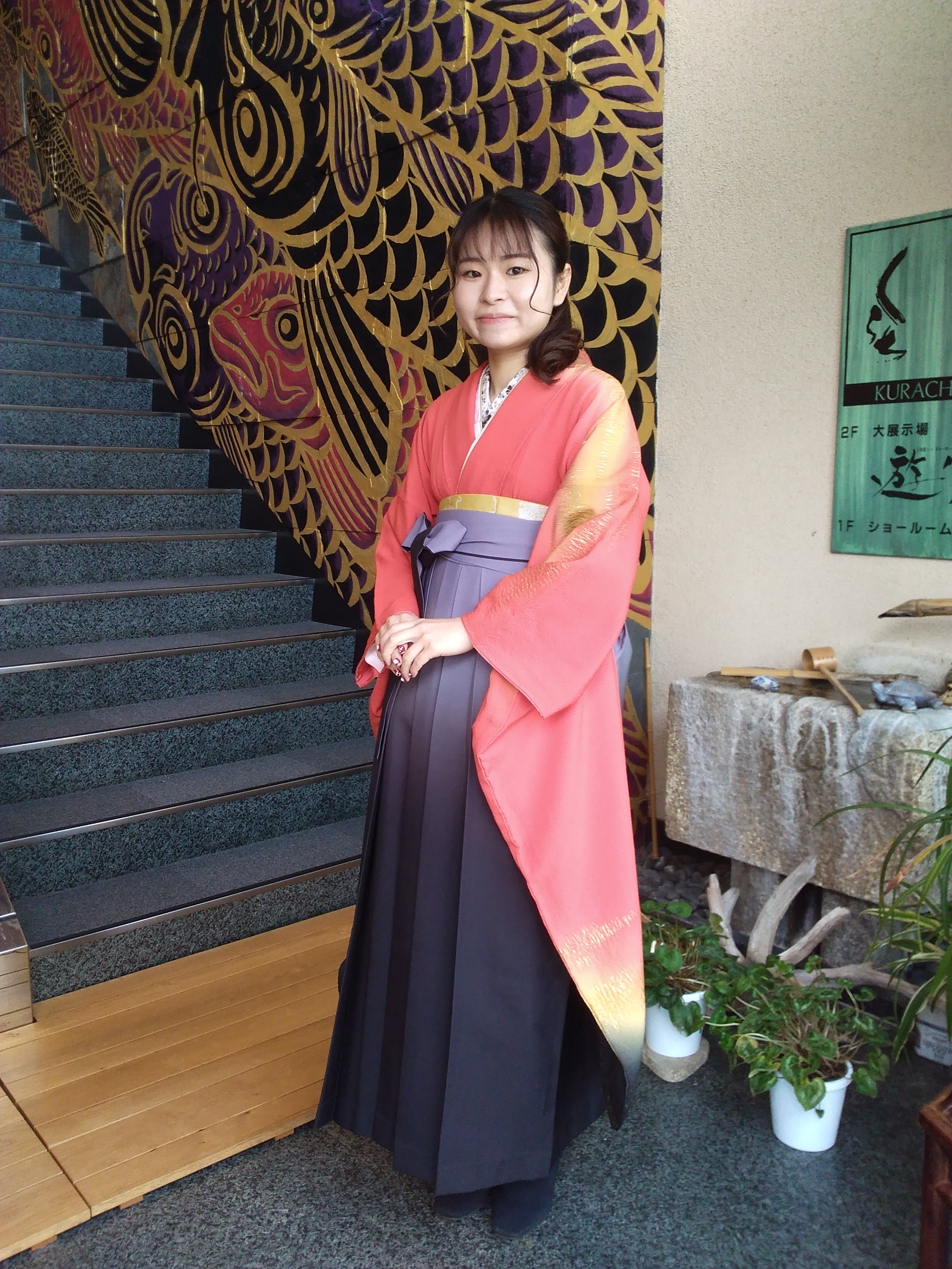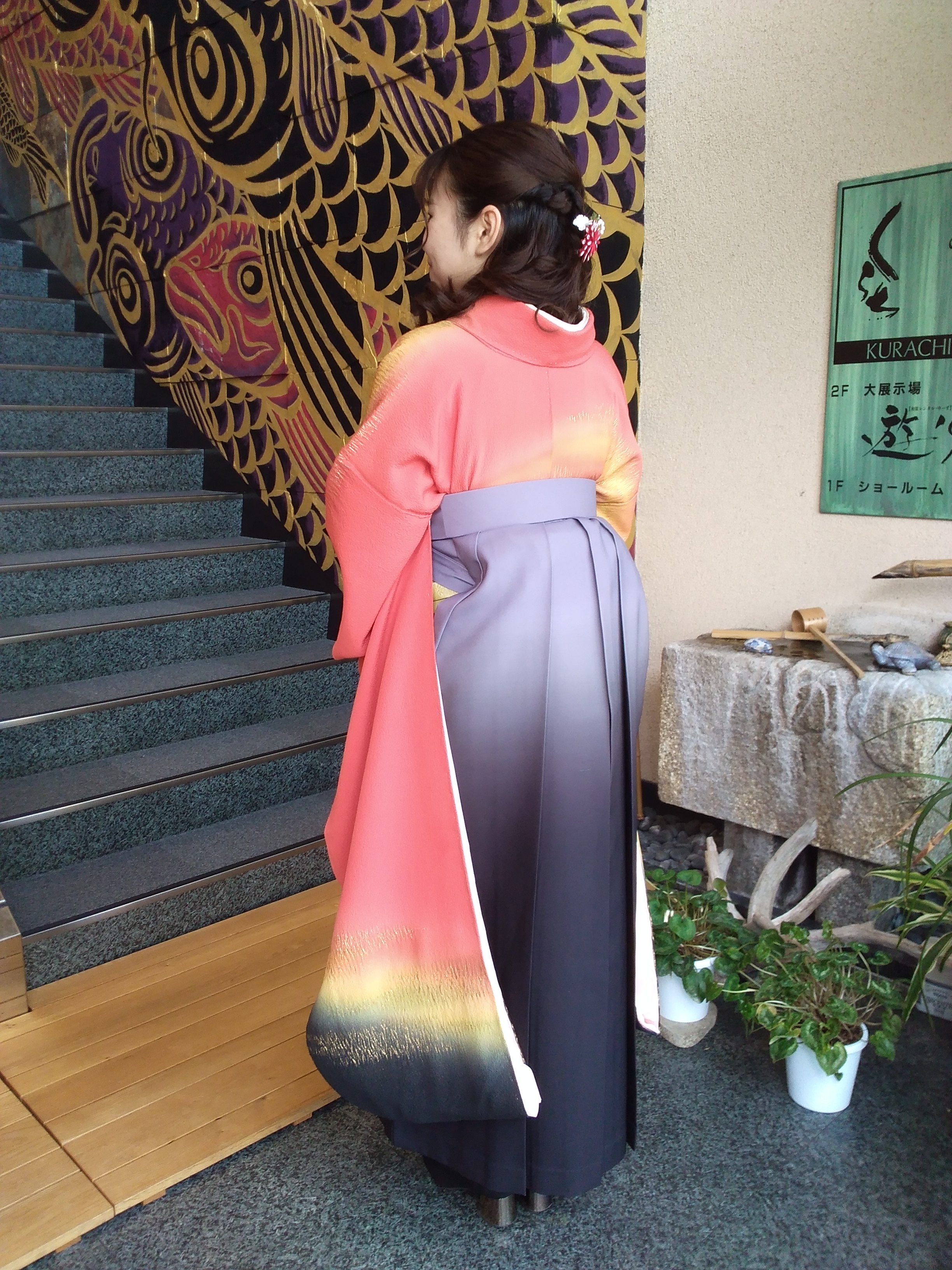 お母様のオレンジから黒のぼかしのお振袖に、袴をコーディネイトさせて頂いたお嬢様。