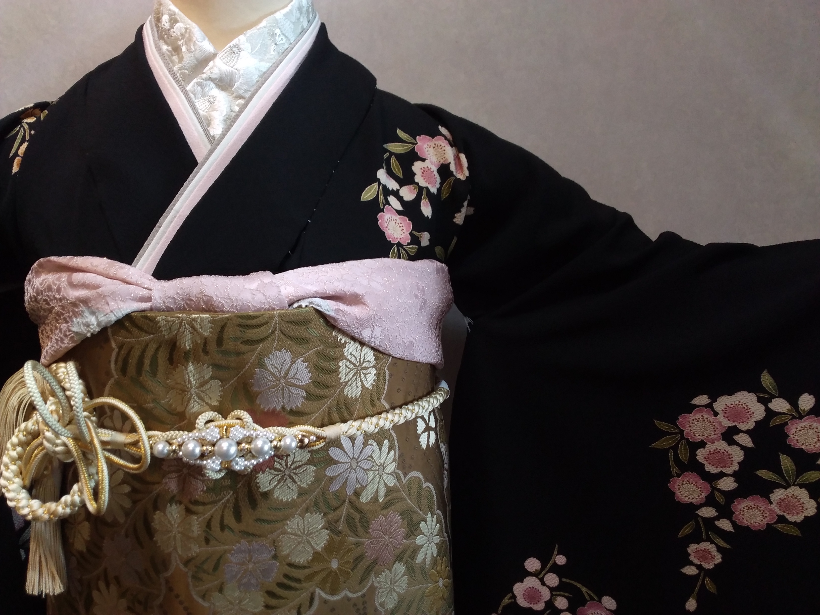 重ね襟と帯揚げだけは淡いピンクを合わせて、可愛らしさを出して。