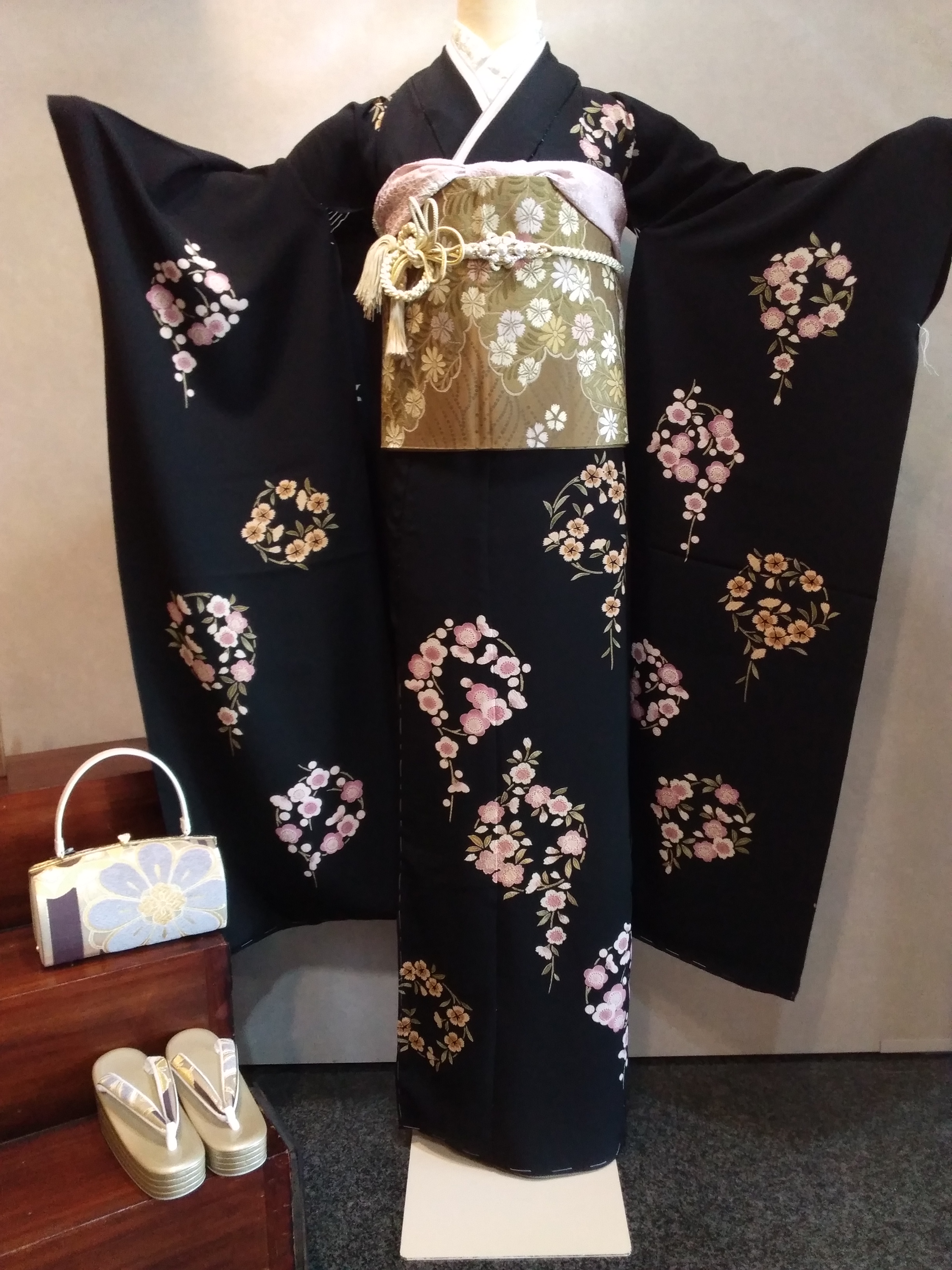 黒地のちりめん地なので、マット感がある生地に桜、梅、撫子が描かれているお振袖。