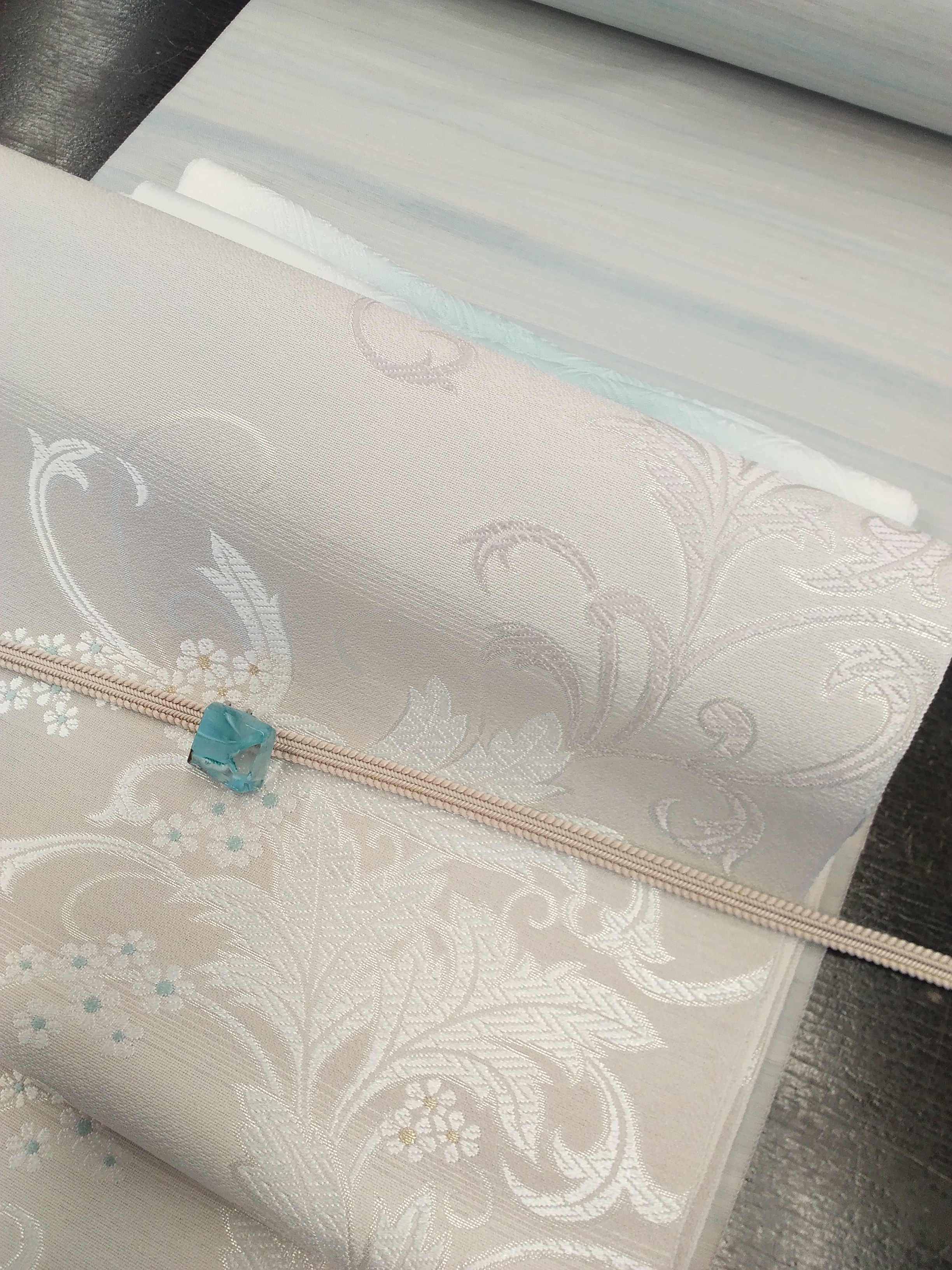 青空色の置賜紬に小花柄の名古屋帯を合わせて。