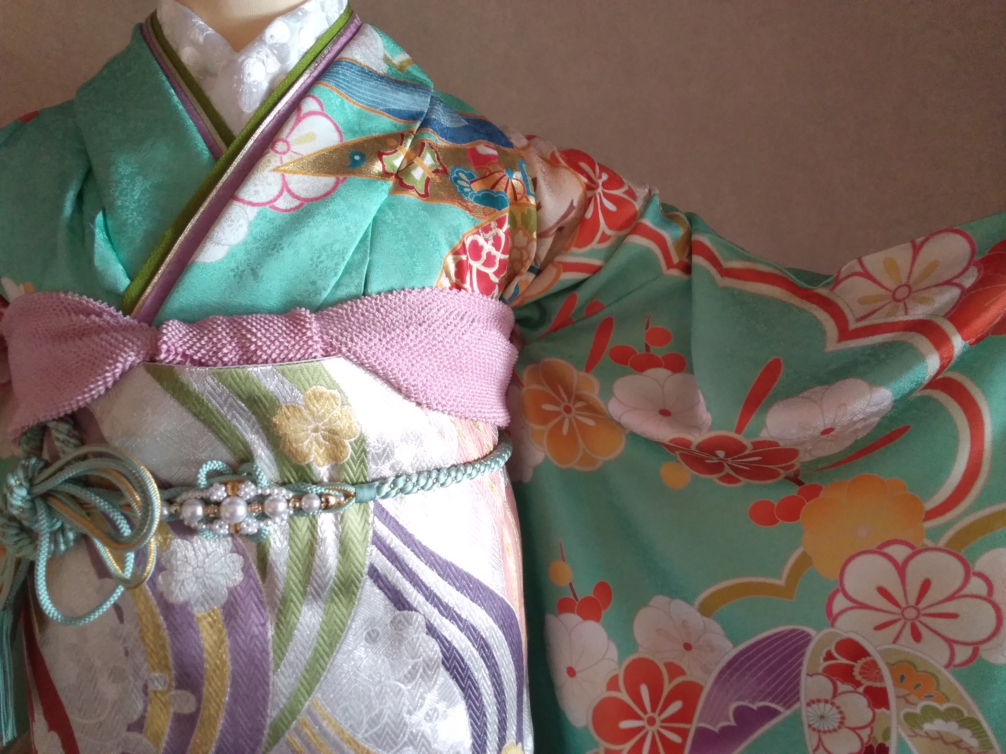 ミントグリーンに笹、梅柄のお振袖をパステルカラー調でコーディネイトしてみました。